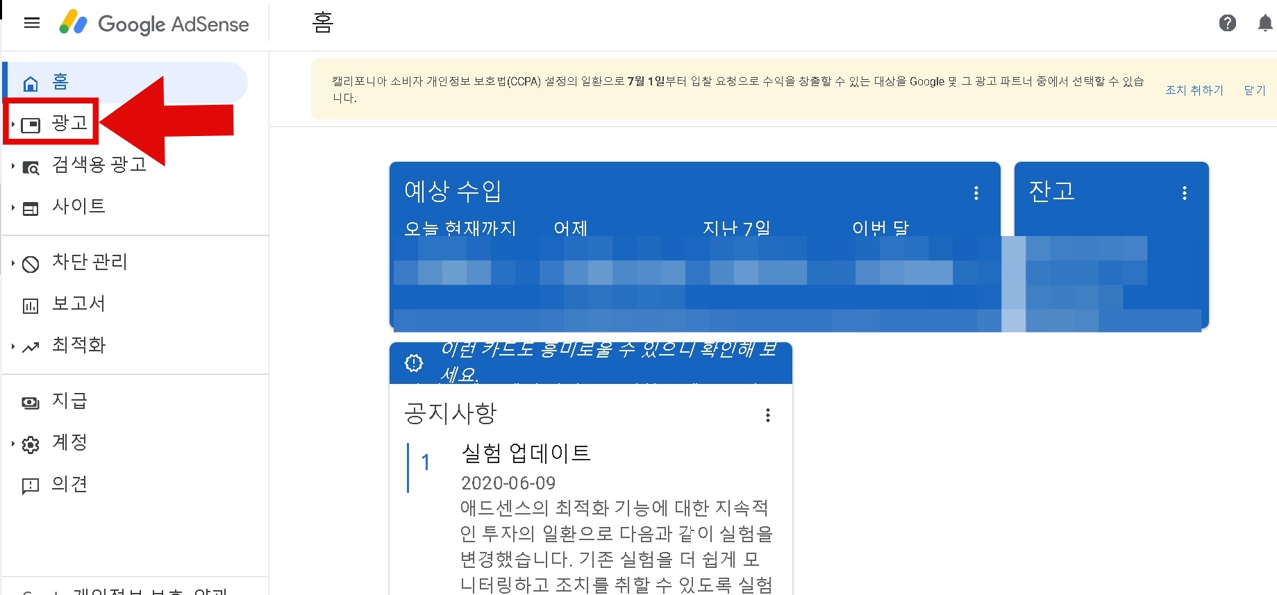 첫번째, 애드센스 홈으로 간다.