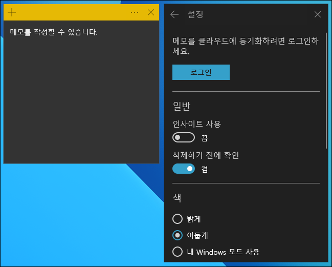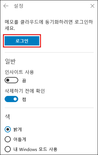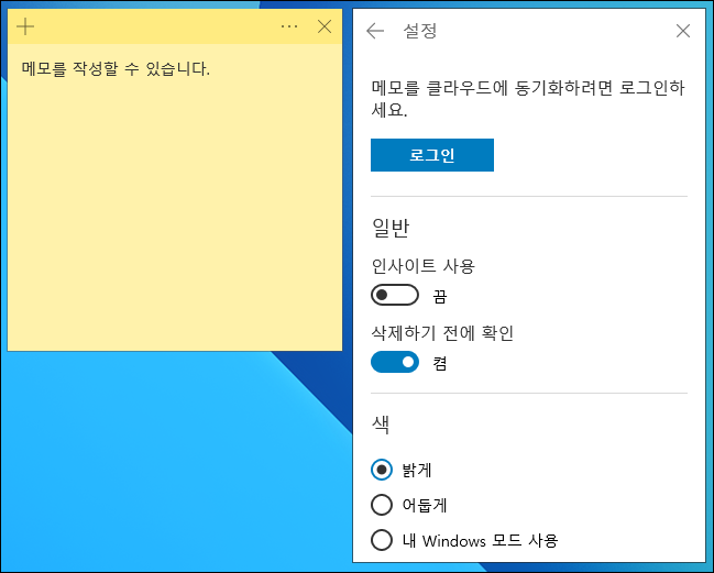 설정창을 누르면 옵션에서 스티커 메모의 테마 색상을 변경할 수 있습니다.
