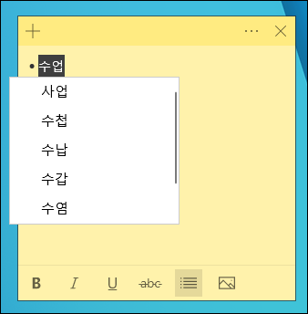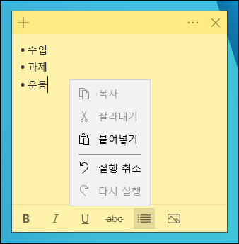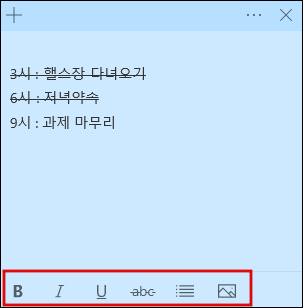 메뉴를 이용하면 글자의 굵기, 기울기, 밑줄, 취소선, 목록 정렬, 사진 넣기 등 스티커 메모장의 편리한 기능들을 사용할 수가 있습니다.