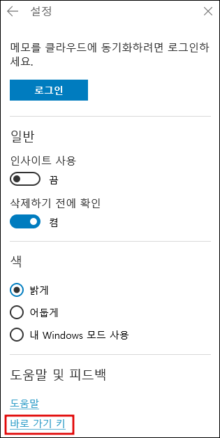 설정에서 '바로가기 키'를 누르면 사용 가능한 단축키를 확인할 수 있습니다. 탄축키를 활용하면 좀 더 빠른 메모를 작성할 수 있습니다.