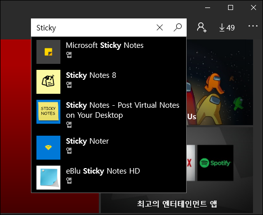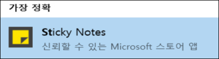 'sticky'를 검색하면 Microsoft Sticky Notes(스티커 메모)가 나옵니다.