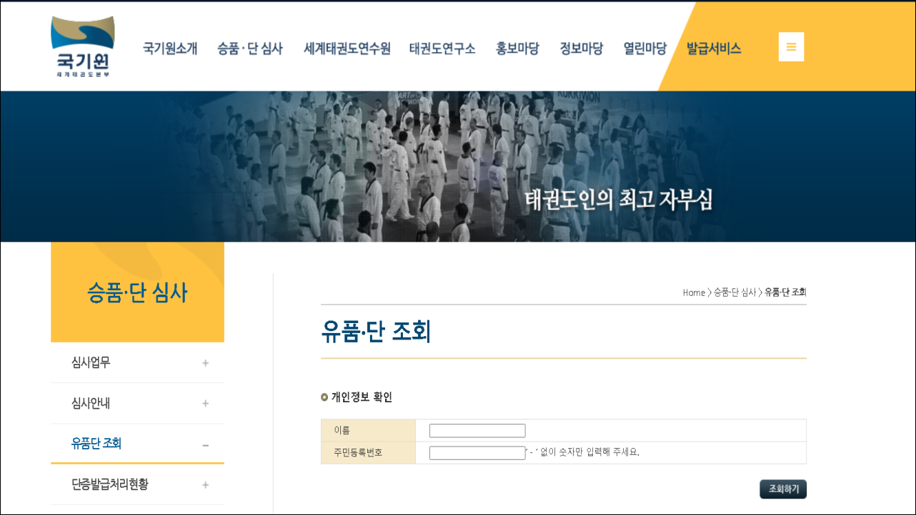 이름 및 주민등록번호를 입력하면 자신의 태권도 단증 조회가 가능합니다.