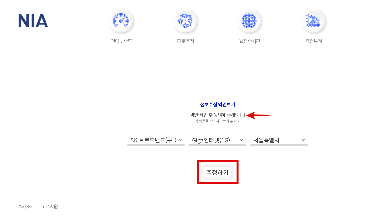 그러면 현재 사용하고 있는 인터넷 회사와 상품, 지역이 표시됩니다. '측정하기'를 클릭해 줍니다.