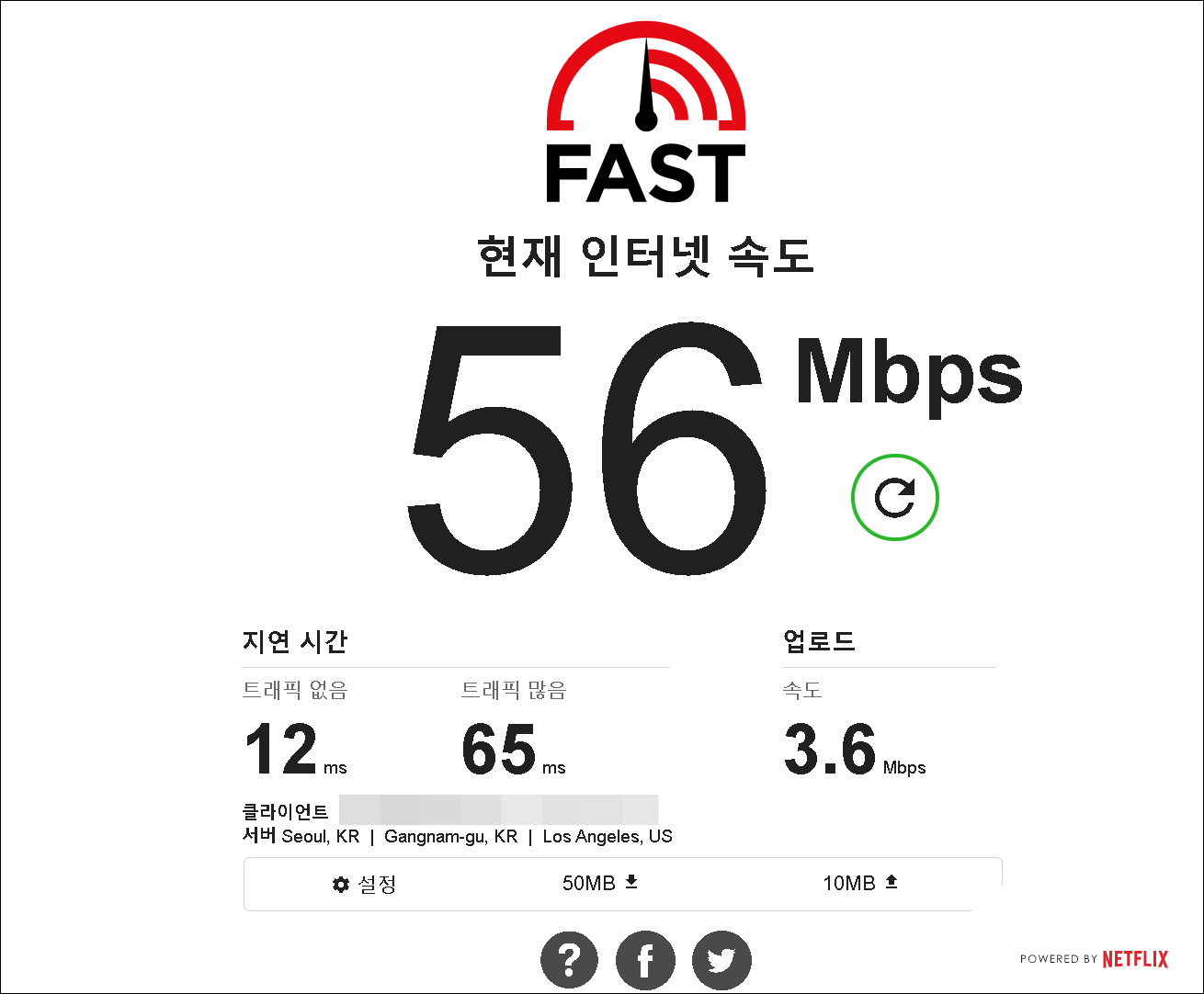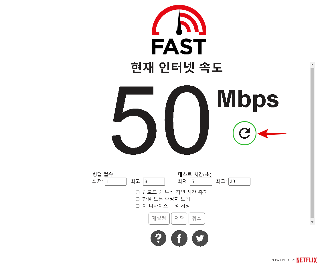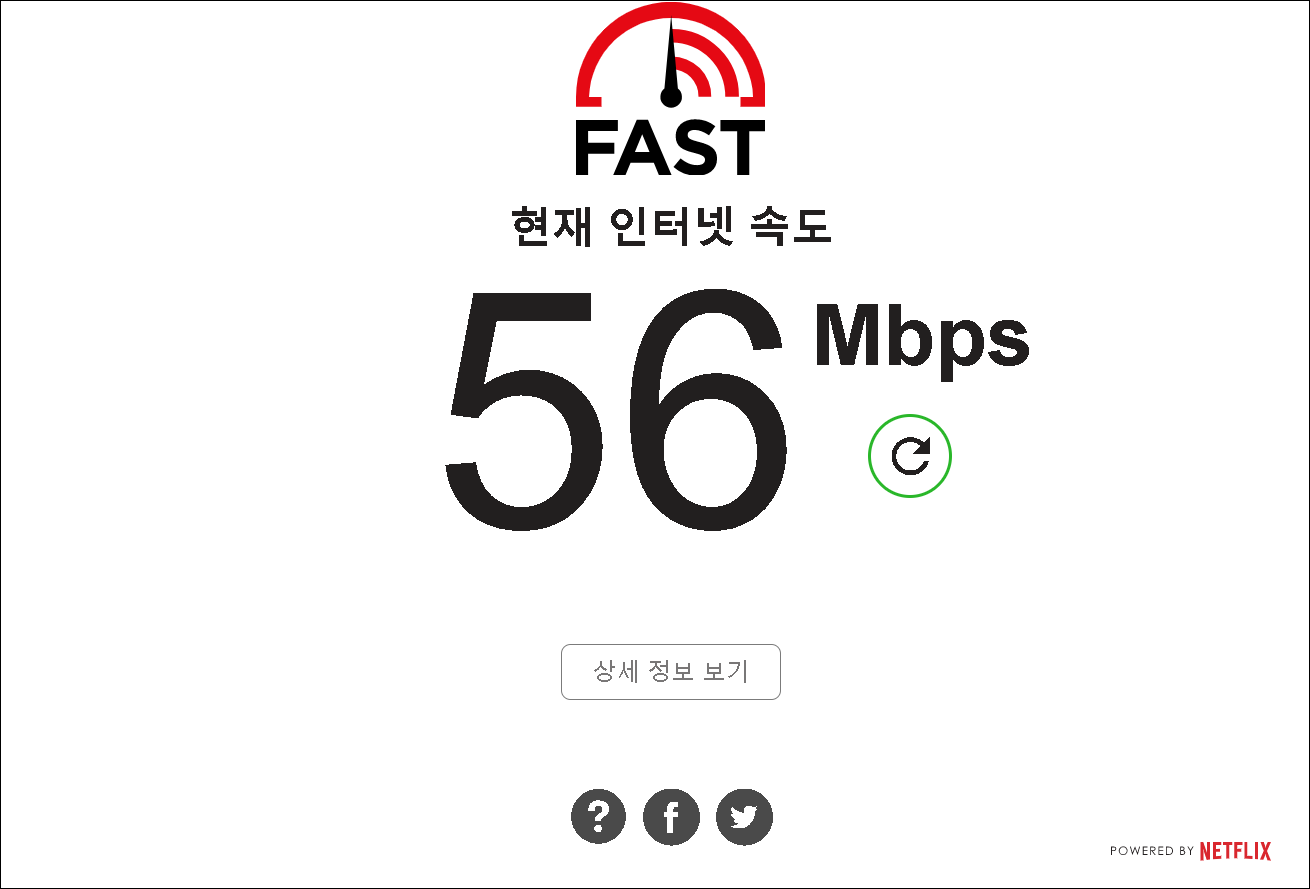 설정을 누르면 몇 가지 옵션이 보입니다. 원하는 옵션을 선택하고 다시 재측정을 클릭하면 됩니다. 몇 번 측정을 해봤는데 속도가 거기서 거기입니다. 휴대폰의 모바일 인터넷 브라우저 앱 주소창에 fast.com를 넣고 사이트에 접속하면 핸드폰 인터넷 속도 측정(무선 인터넷)도 할 수 있습니다. fast.com은 넷플릭스에서 제공하고 있는 속도 측정 사이트로 넷플릭스를 감상하는데 최적화된 속도를 확인할 수 있습니다.