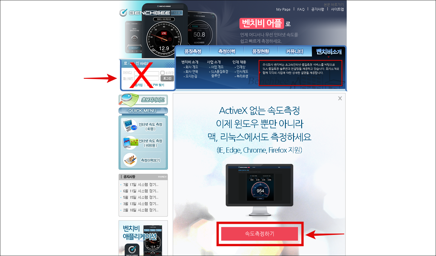 아이디를 만들거나 로그인을 하지 말고 바로 속도 측정하기를 클릭해줍니다. '벤치비' 어플을 설치하면 핸드폰 인터넷 속도(무선 인터넷)를 확인할 수 있습니다.