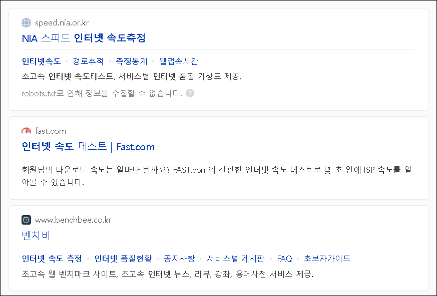 검색 결과에 나타는 위 3군데 사이트가 무료로 인터넷 속도를 측정할 수 있는 사이트입니다.