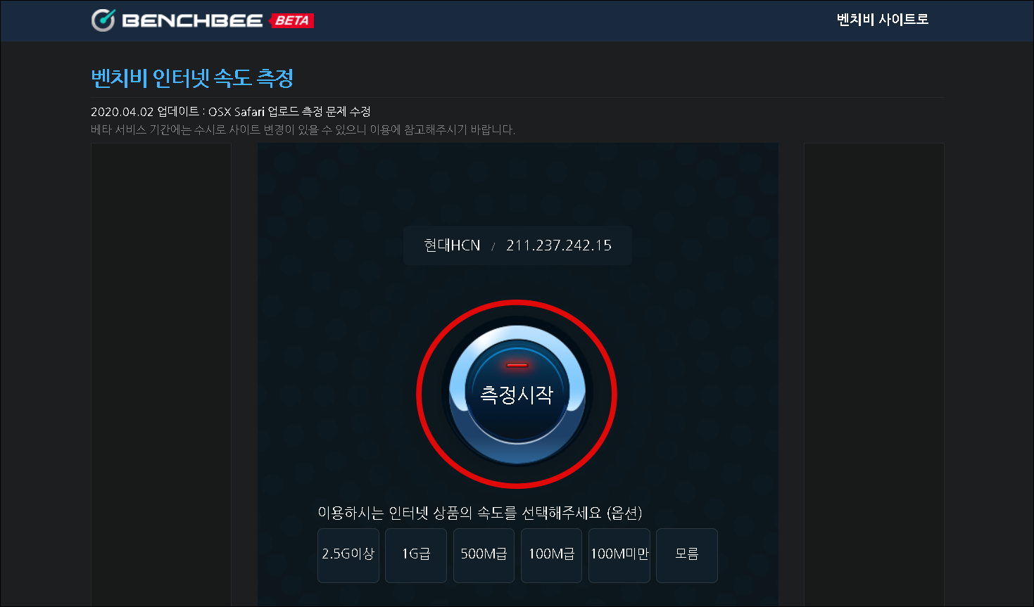 세 번째 사이트는 벤치비라는 인터넷 속도 측정 사이트입니다. 회원가입이나 프로그램 다운로드 없이 간단하고 빠르게 바로 인터넷 속도를 측정할 수 있습니다.