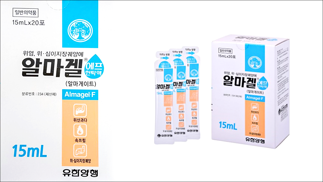| 1정 중 알마게이트 500mg | 1포(15ml) 중 알마게이트 1g(1,000mg) | 1포(15ml) 중 알마게이트 1.5g(1,500mg) |