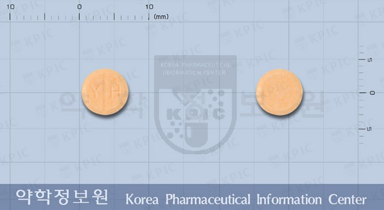 주황색(등황색)의 원형 정제입니다. Y 분할선 H라고 쓰여 있습니다.