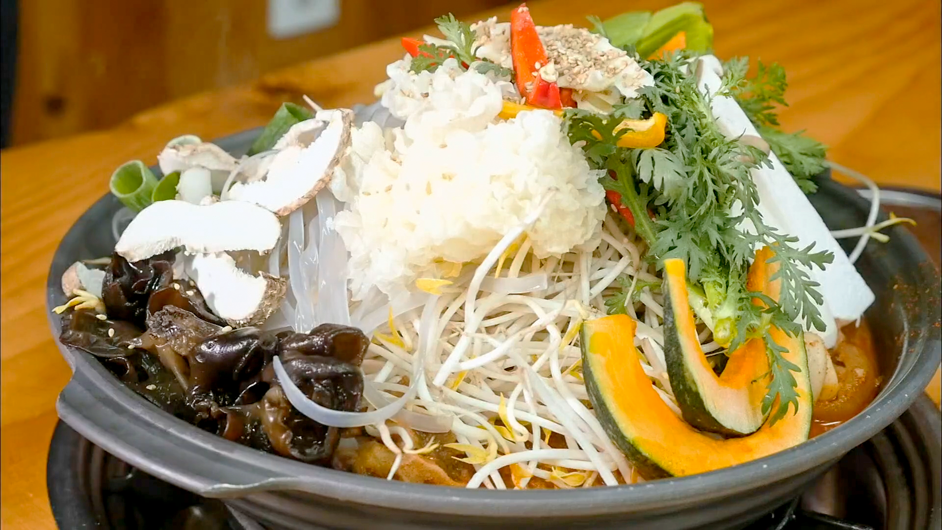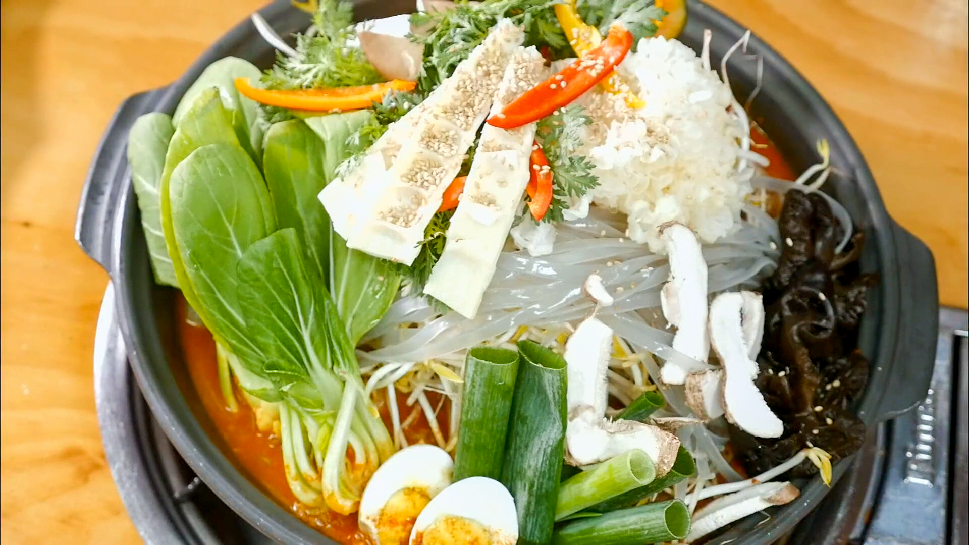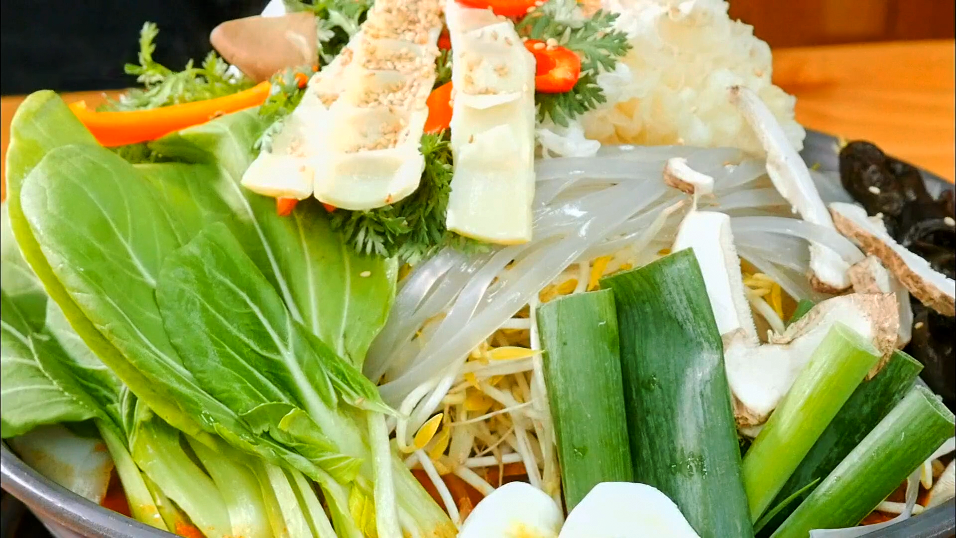 고기 위에 콩나물, 대파, 당면, 청경채, 쑥갓, 버섯, 호박, 달걀 등 당양한 재료가 아낌없이 듬뿍 들어가 있습니다.