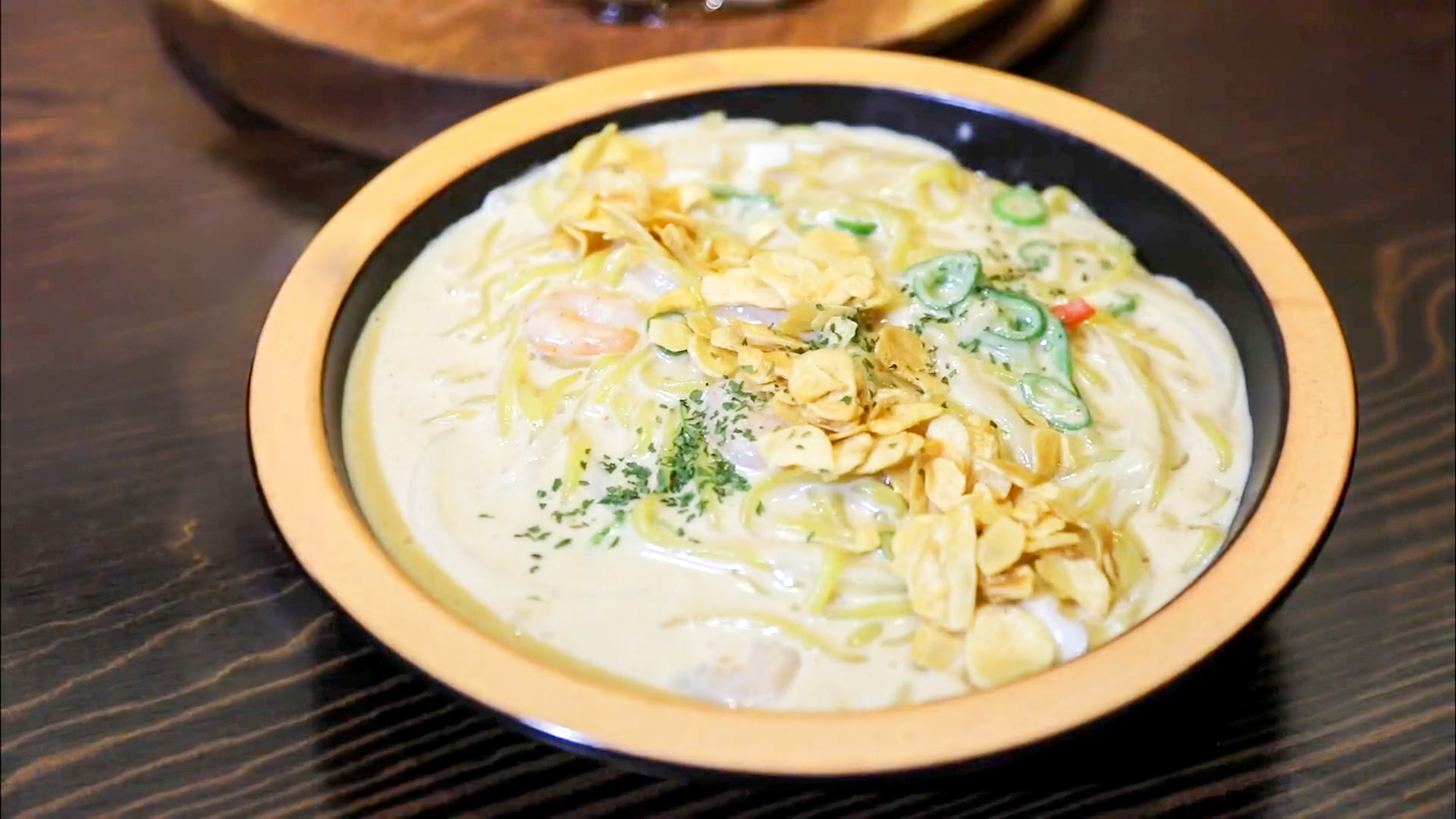 크림짬뽕입니다. 오징어, 새우, 양파, 마늘 후레이크, 피망 등 다양한 재료들이 들어가 있습니다.