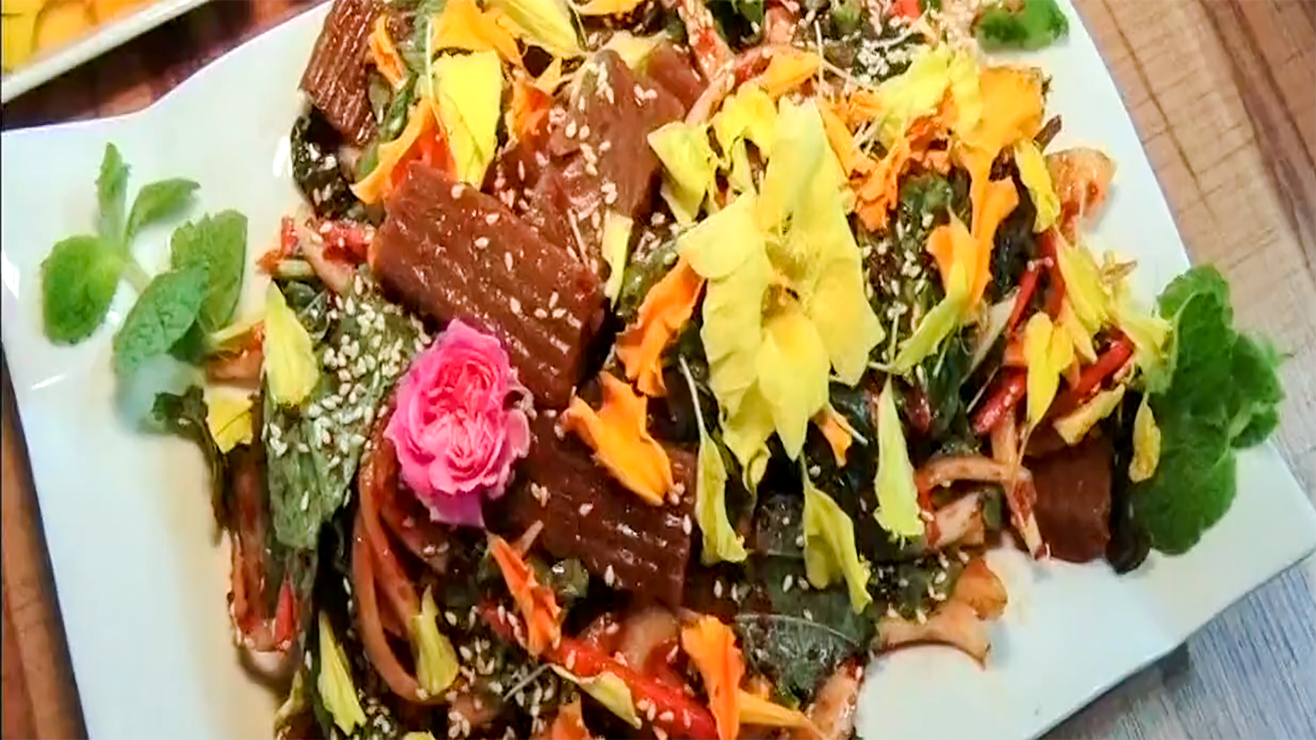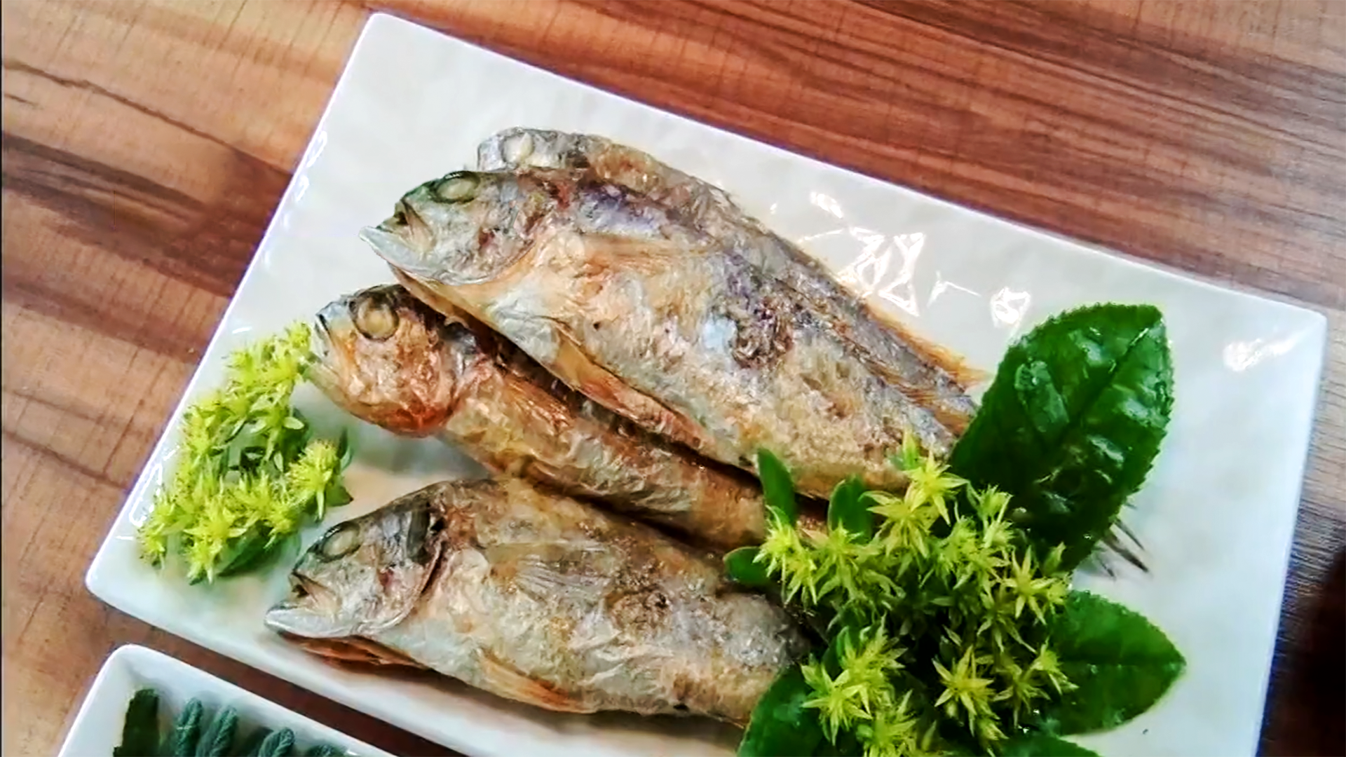찻잎과 돌나물 꽃이 올라간 조기구이입니다. 음식마다 꽃이 담겨있어 더욱더 맛있게 느껴집니다.