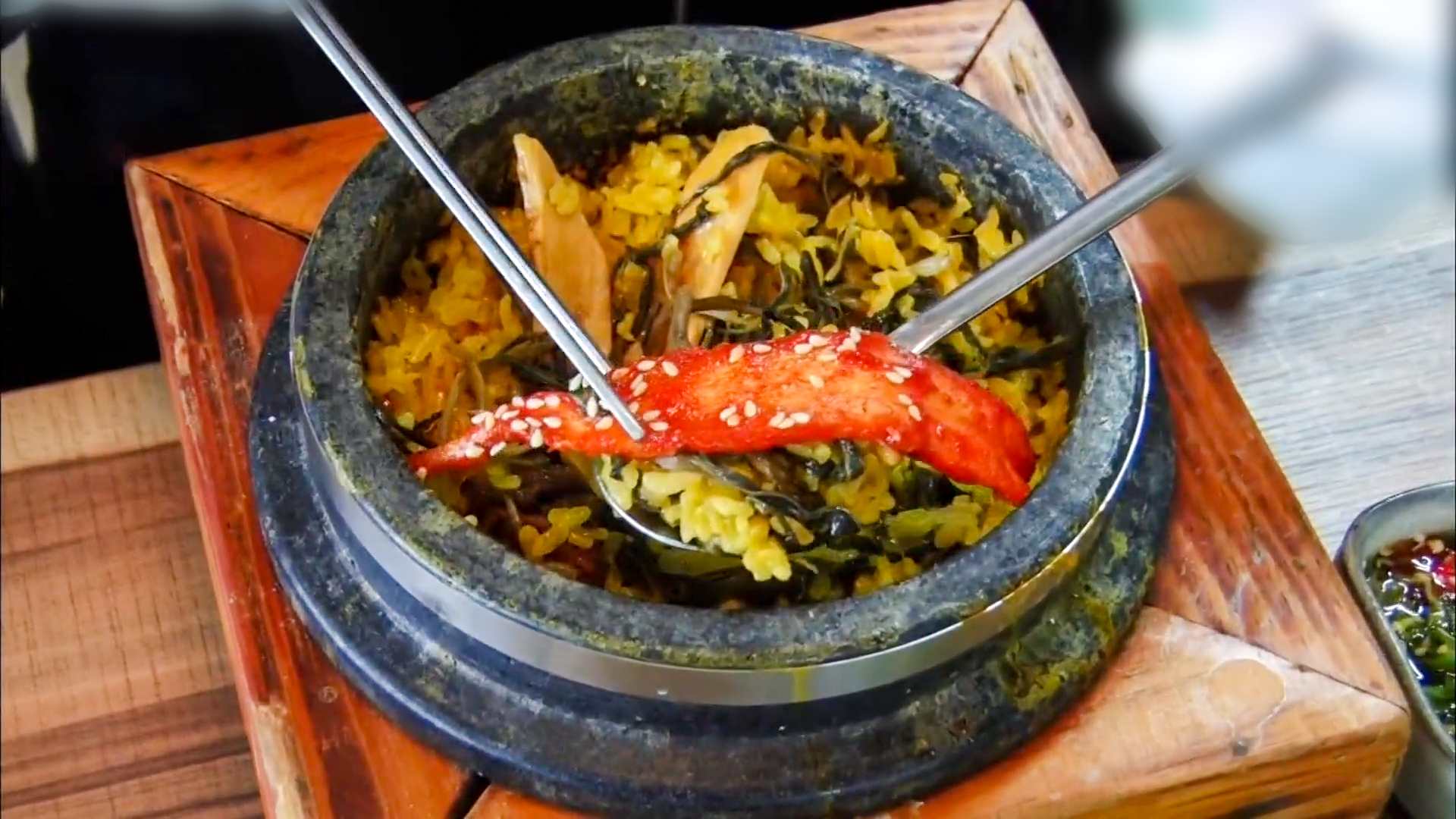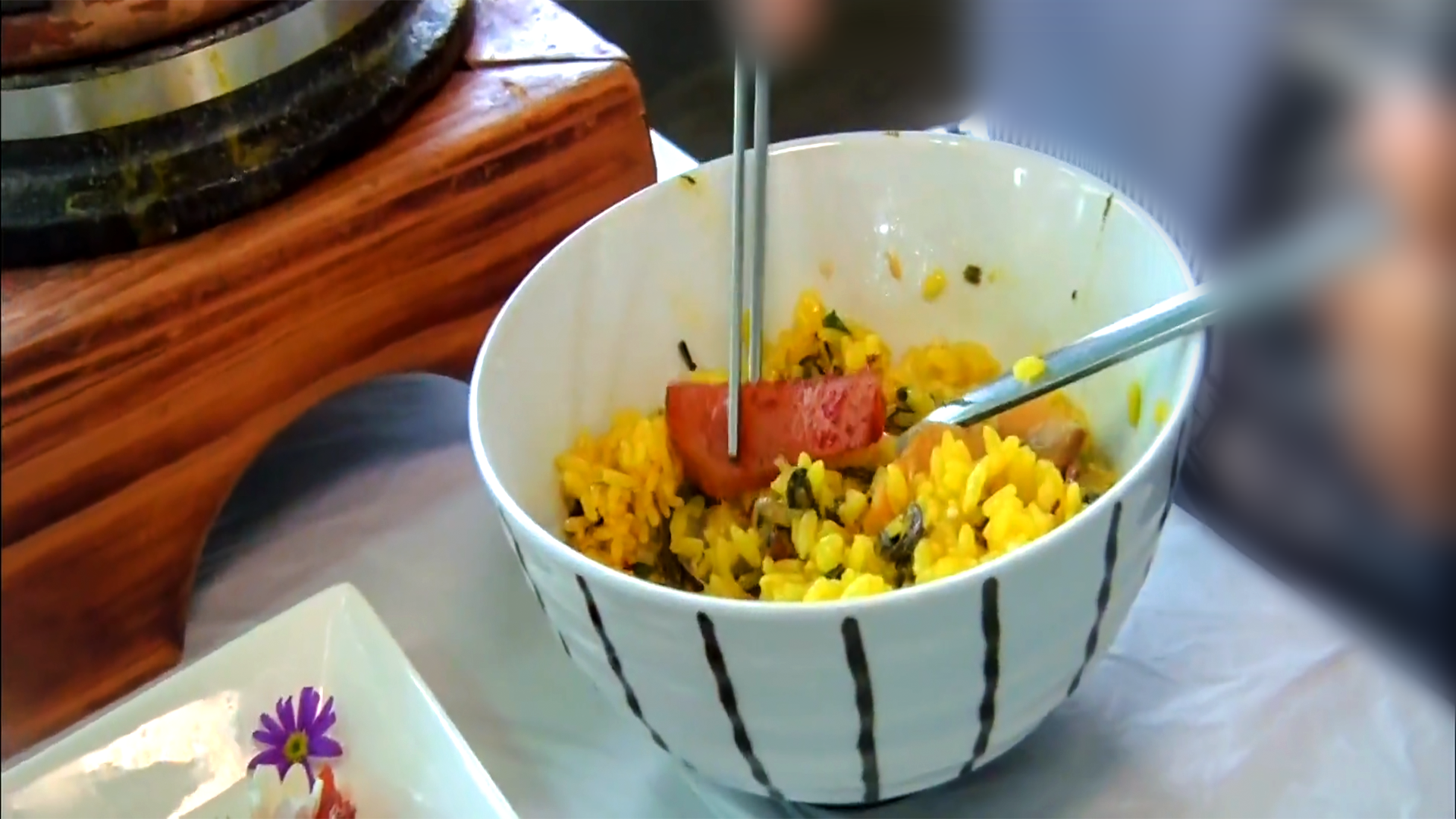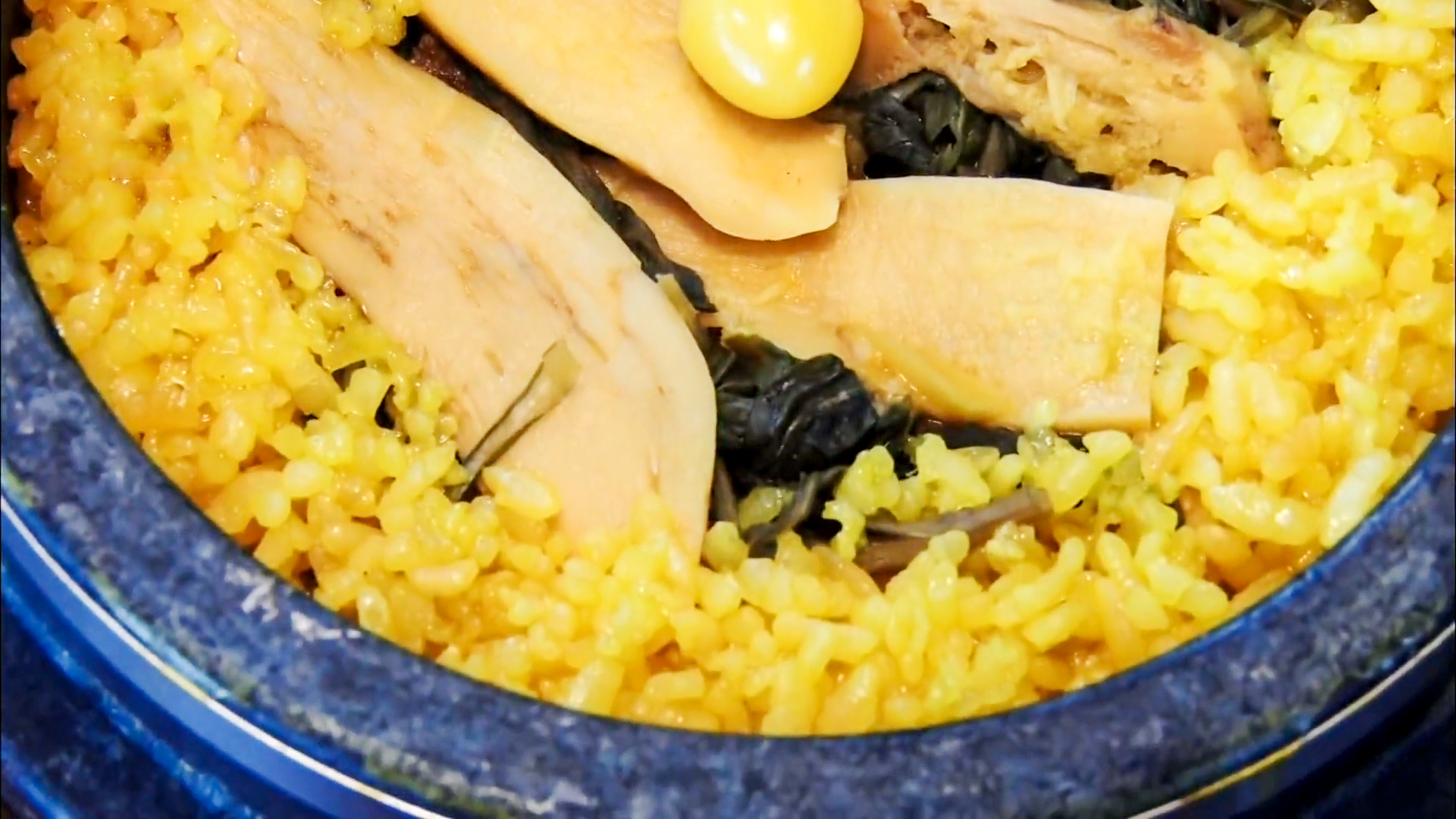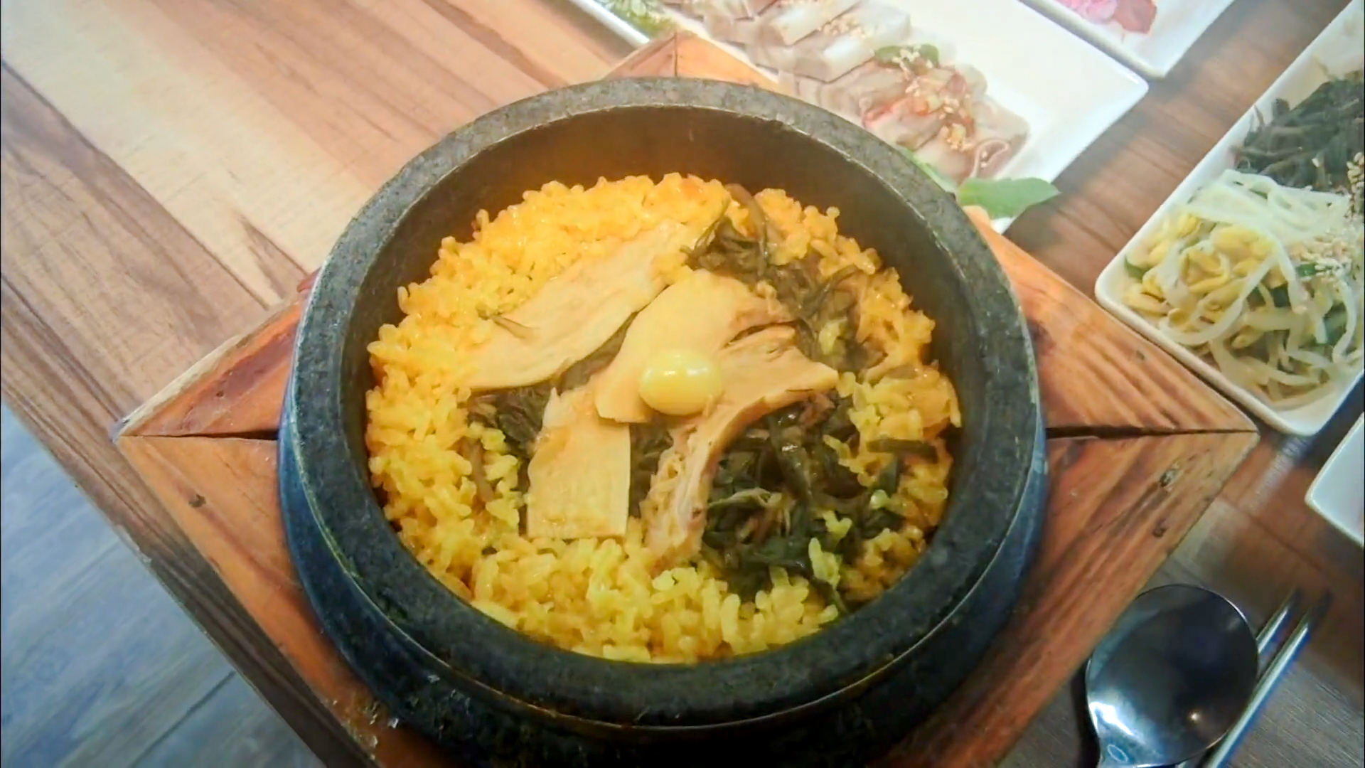 송이 치자 영양 돌솥밥입니다. 건강에 좋은 치자가 들어간 노란 돌솥밥이 입안에서 착착 감기며 은은하게 퍼지는 송이버섯의 맛과 향이 입맛을 완전 살려줍니다.