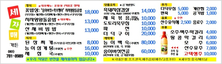 전라남도 구례군 광의면 수월리에 위치한 구례 맛집 '세자매가든'입니다. 이곳은 지리산 나물 밥상을 판매하고 있는 곳입니다. 돌솥밥부터 산채비빔밥, 능이백숙 등 다양한 한식을 맛볼 수 있습니다. 지리산 제철 산나물에서 느껴지는 전라도 한식의 맛을 제대로 즐길 수 있어 많은 사람들이 찾고 있는 것 같습니다. 나오는 음식들은 모두 사장님이 직접 만들어 제공하고 있으며 음식이나 반찬 하나하나가 정갈하고 맛깔납니다. 시골밥상처럼 나오는 한식 좋아하시는 분들은 정말 좋아할 만한 곳입니다. 현지인들 뿐만 아니라 지리산 쪽을 방문한 사람이나 우연히 이곳을 지나가던 사람들도 많이 찾고 있는 것 같습니다.