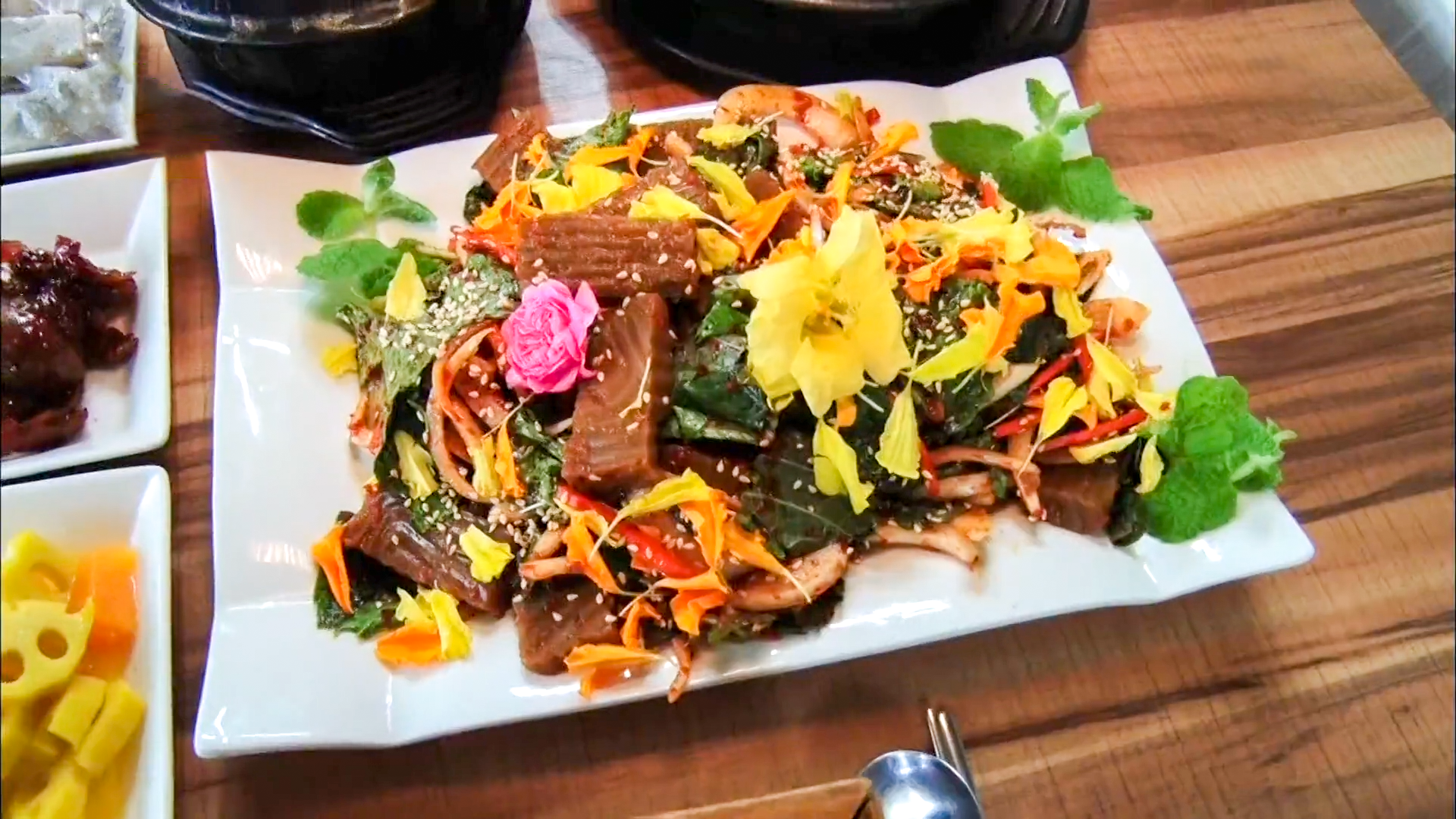 등장부터 감탄이 절로 나는 이 집의 대표 메뉴 '꽃 밥상'입니다. 한상 가득 더덕무침, 편육, 도토리묵무침, 조기구이, 콩나물무침, 취나물무침, 박나물 무침, 참나물무침, 고추장아찌, 깻잎절임, 버섯볶음, 토란 볶음, 배추김치, 연근 무침, 달걀찜, 된장찌개 등이 아주 푸짐하게 나옵니다.