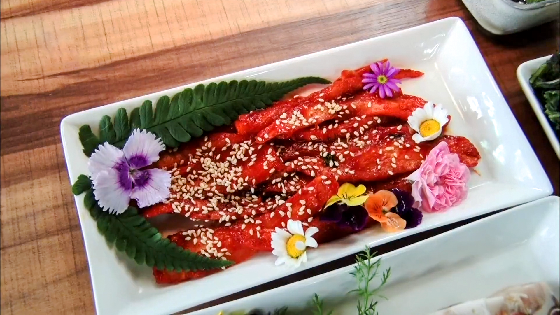제라늄과 팬지를 올린 돼지 편육입니다. 한 점만 맛봐도 맛깔난 반찬들이 입맛을 돋게 합니다.
