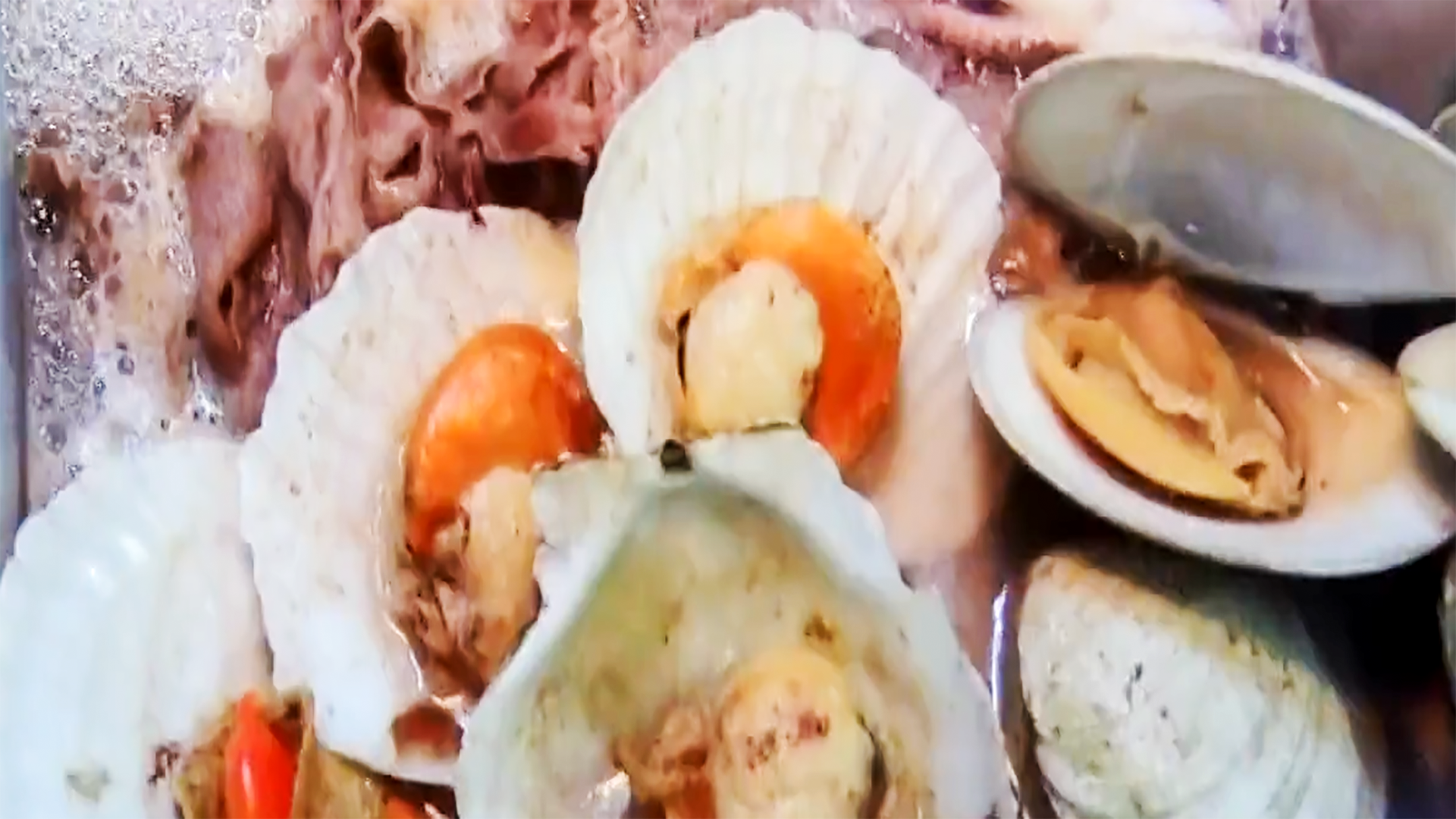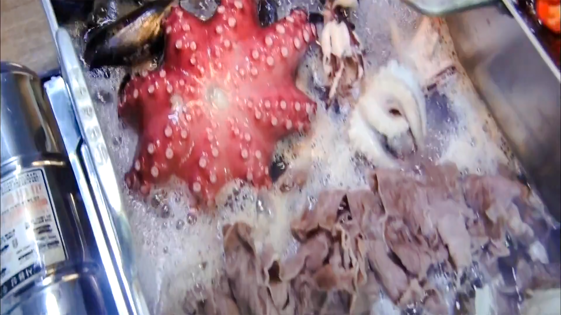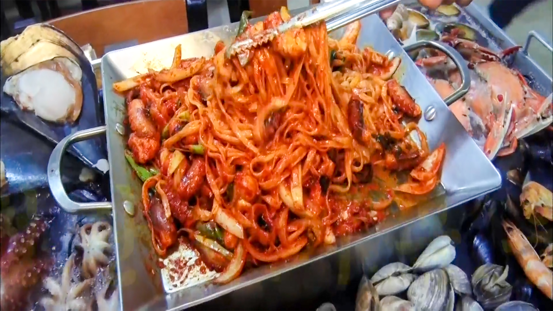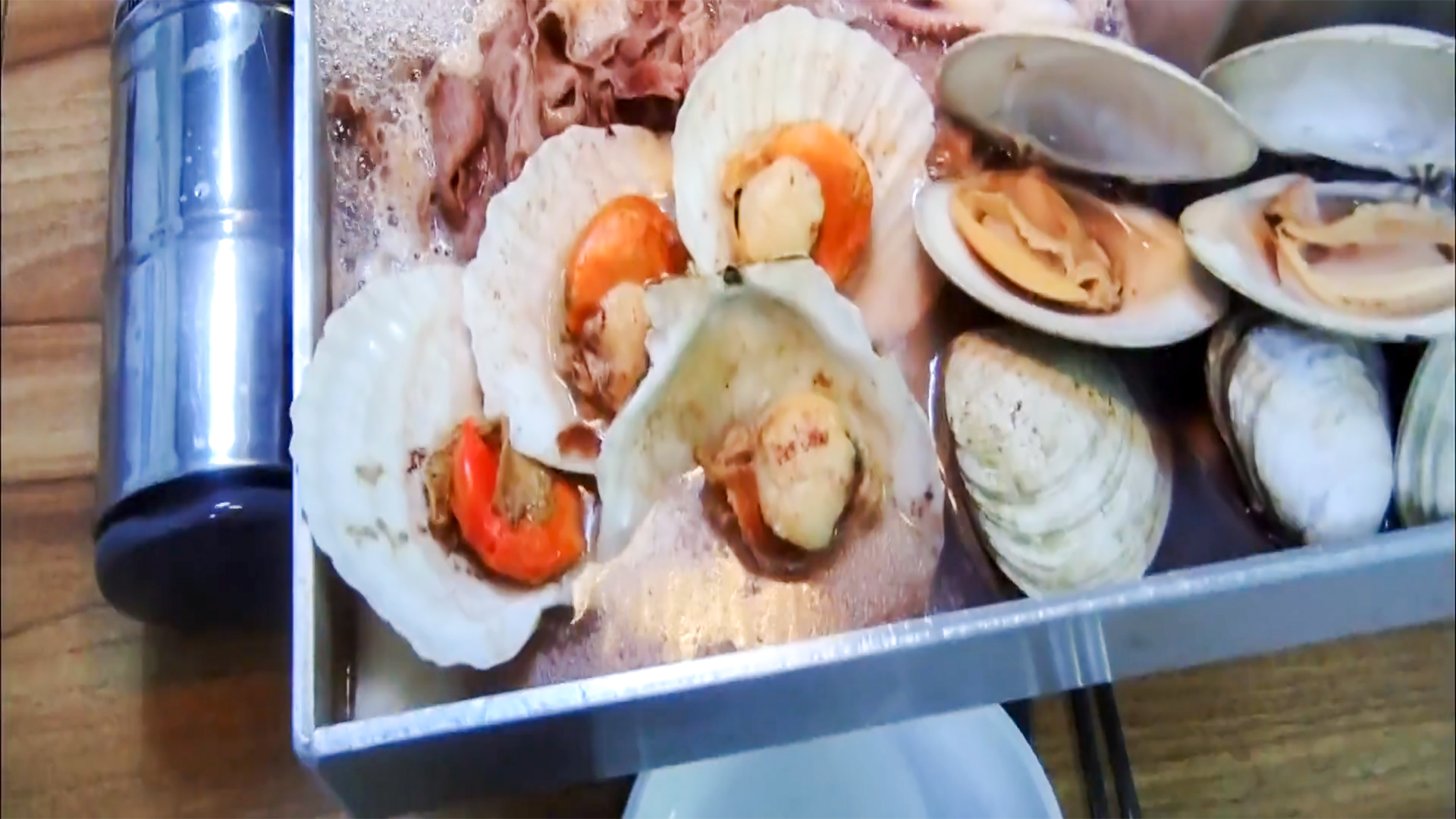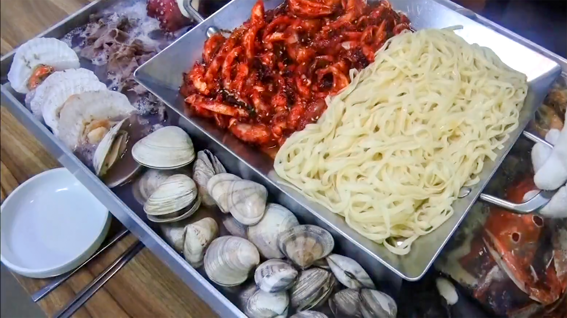 매콤한 낙지볶음, 전복, 키조개, 문어, 새우, 게 등 각종 해산물이 듬뿍 들어가 있습니다. 조개탕이 끓는 동안 배고픔에 지루하지 않게 낙지볶음을 먹어주면 됩니다. 낙지볶음을 먹다 보면 팔팔 끓는 조개탕이 어느새 다 익어 있습니다.