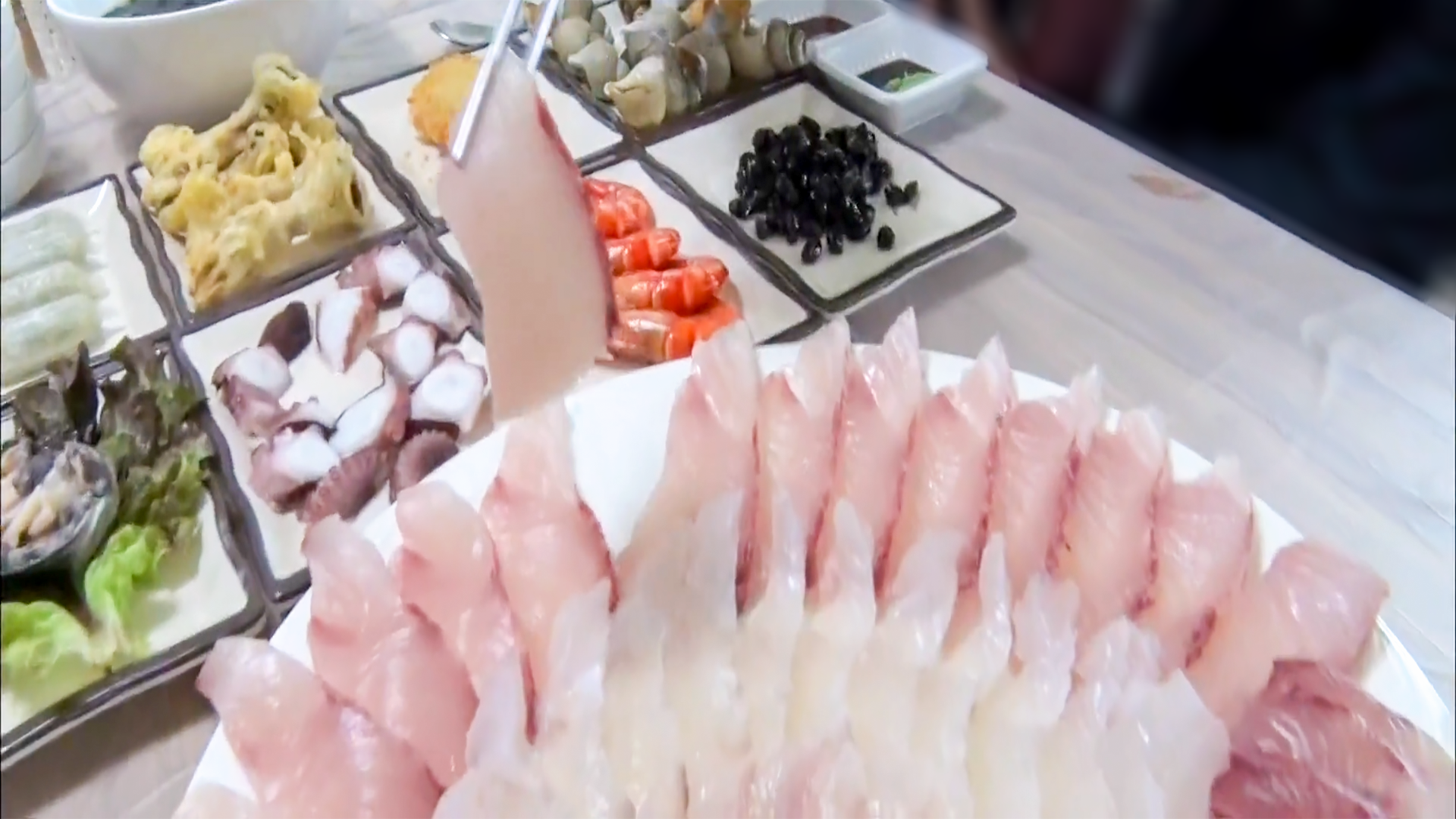 여기에 오징어, 멍게, 전복, 새우, 키조개 등 다양한 사이드 음식이 함께 나옵니다. 신선한 바다의 맛을 그대로 느낄 수 있습니다.
