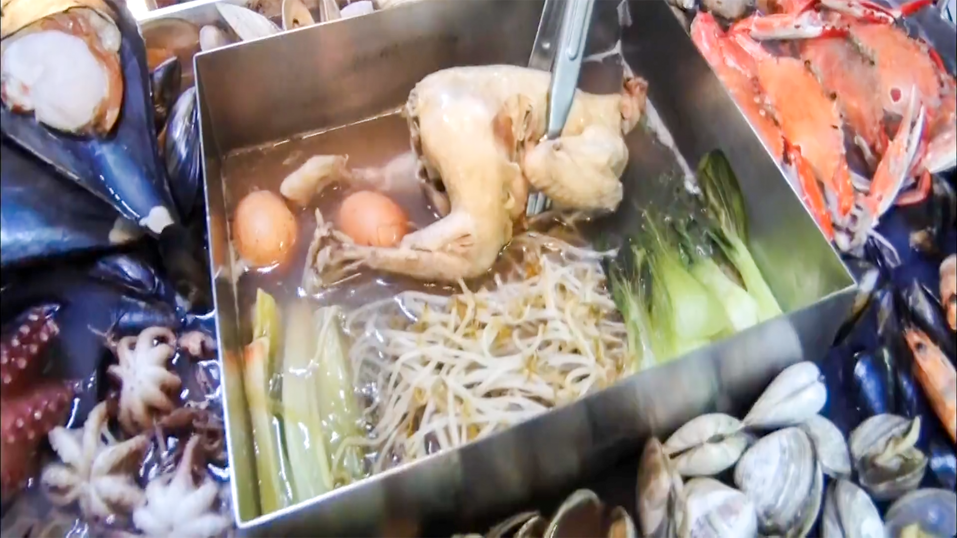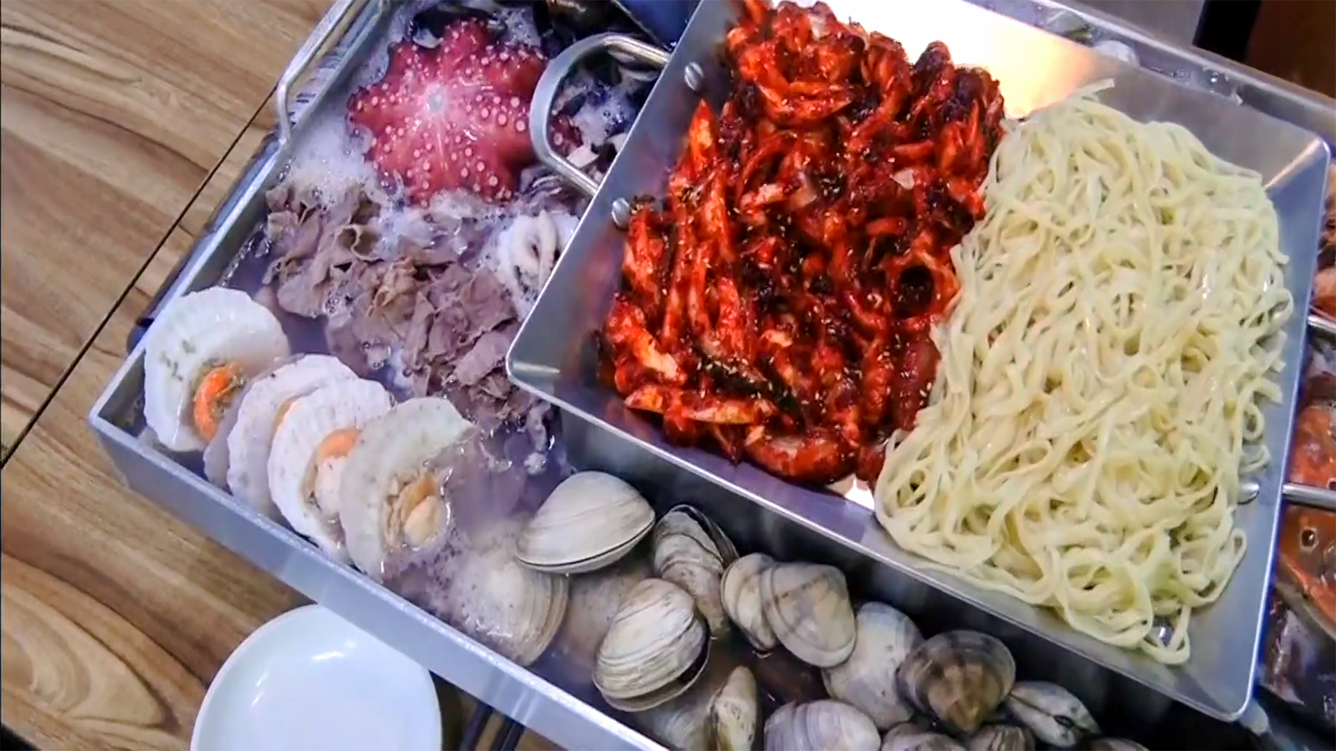 1층에는 각족 해산물이 들어간 조개 전골 2층에는 닭백숙, 숙주 채소 3층에는 매콤한 낙지볶음, 칼국수가 올라가 있습니다.