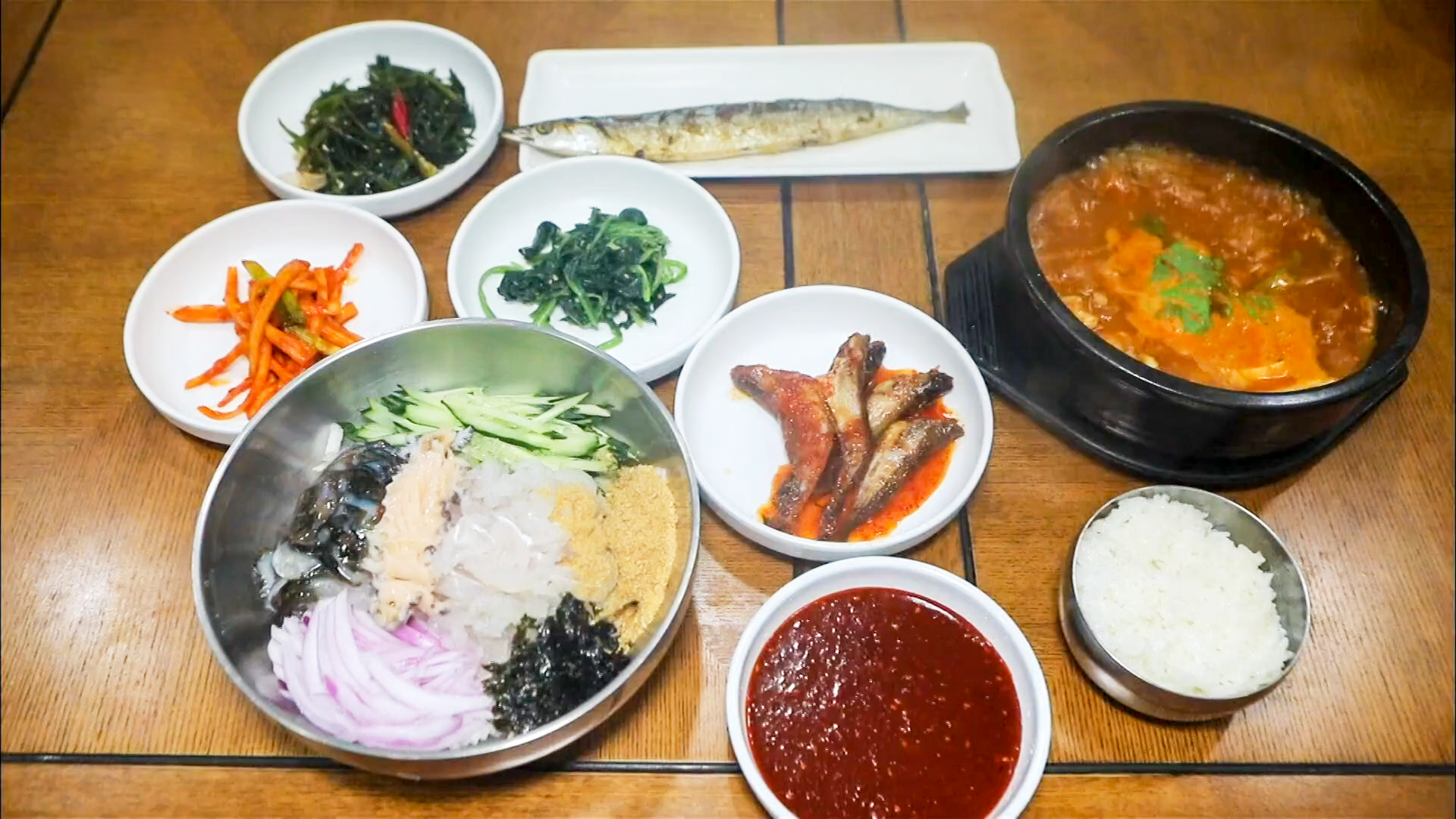 비빔 물회를 시키면 우럭 매운탕, 도루묵 조림, 꽁치구이 등이 함께 나옵니다.