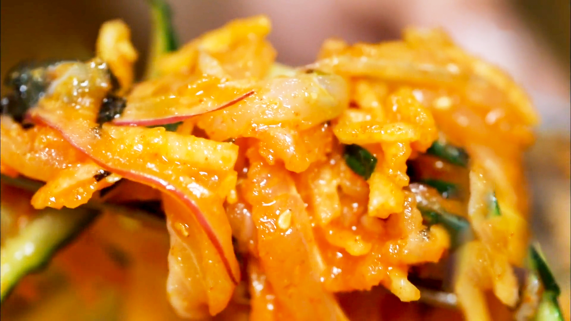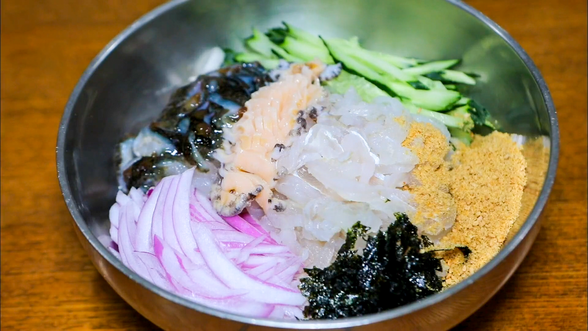 고추장 양념에 채소와 싱싱한 해산물을 슥슥 비벼줍니다.