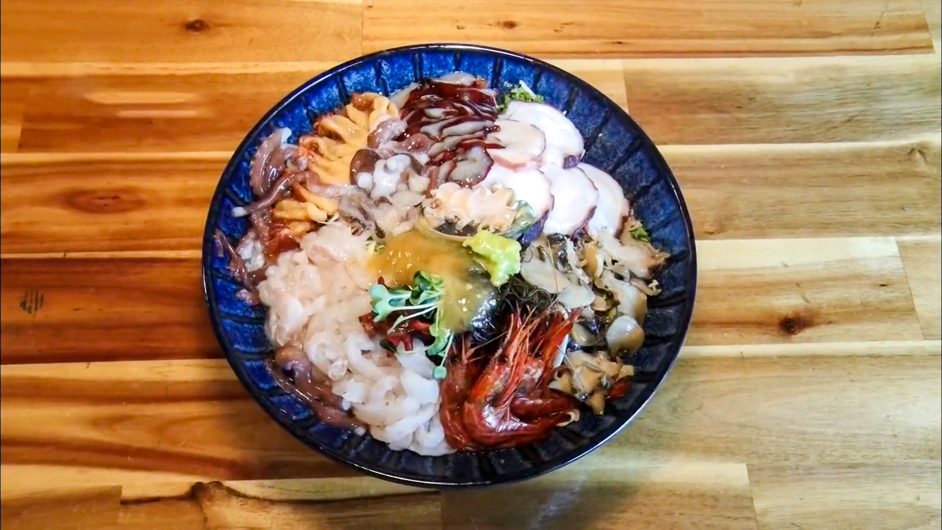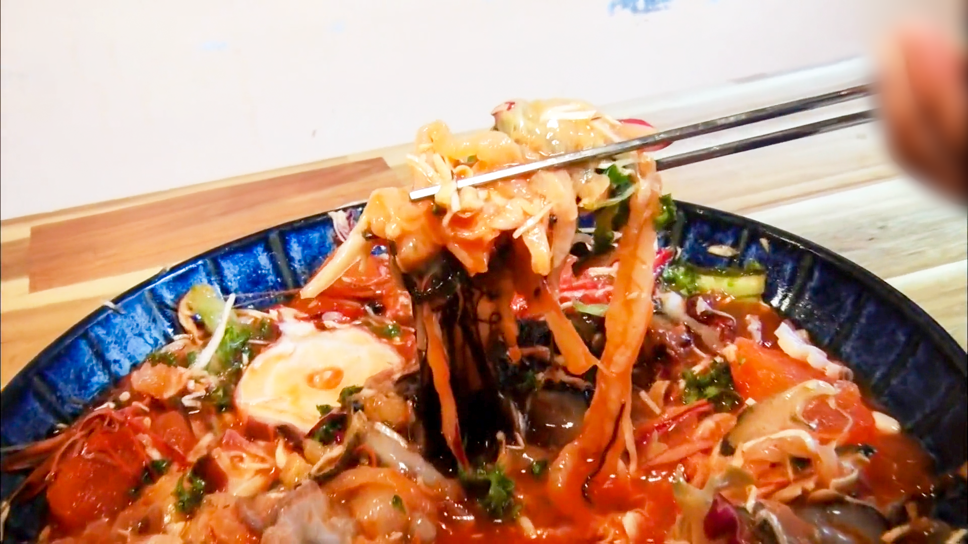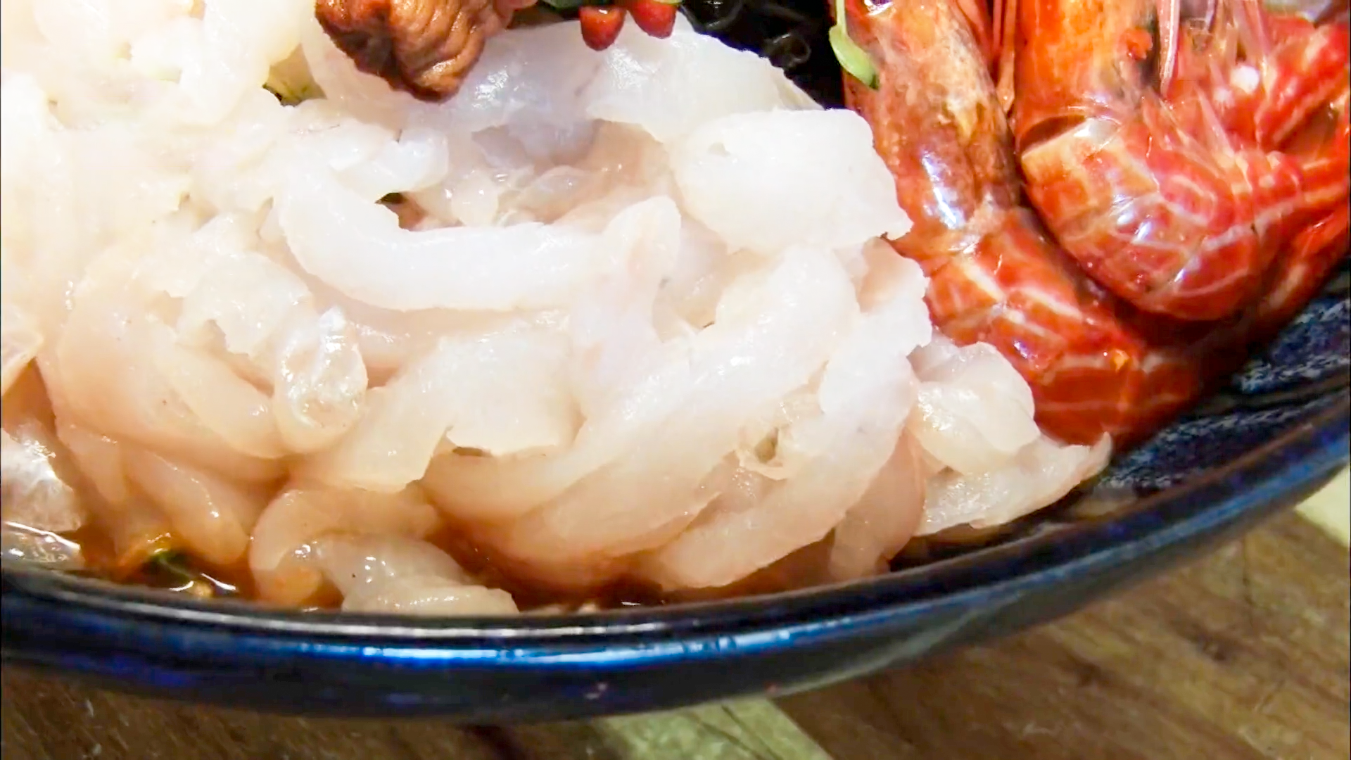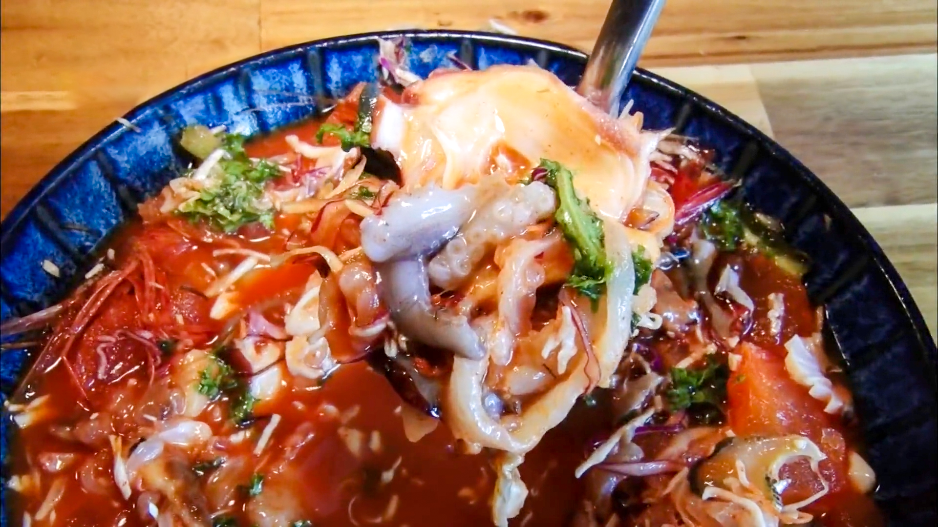 이 집의 대표 메뉴 '황제 물회'입니다. 싱싱한 해산물이 한가득 들어 있습니다.