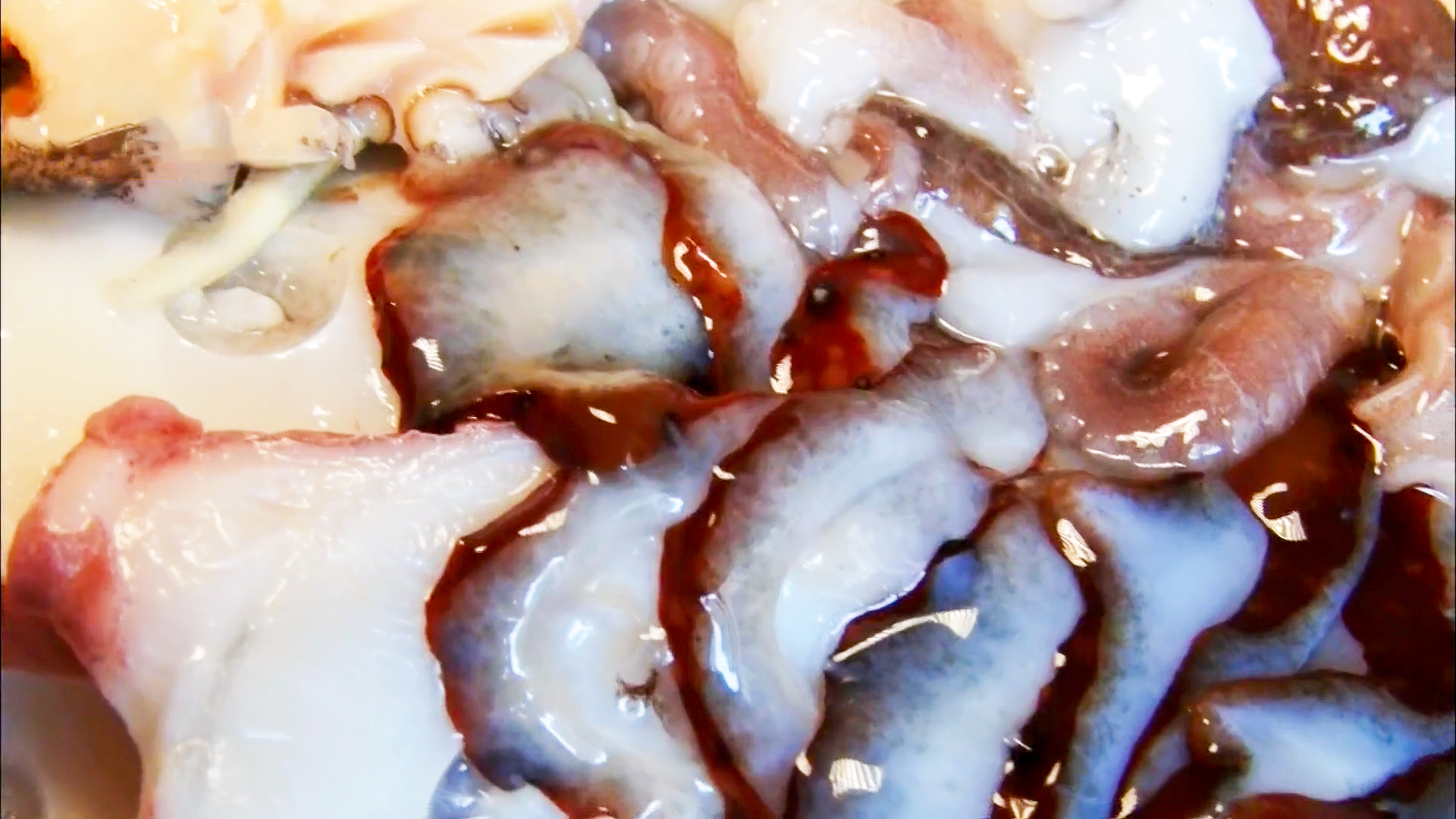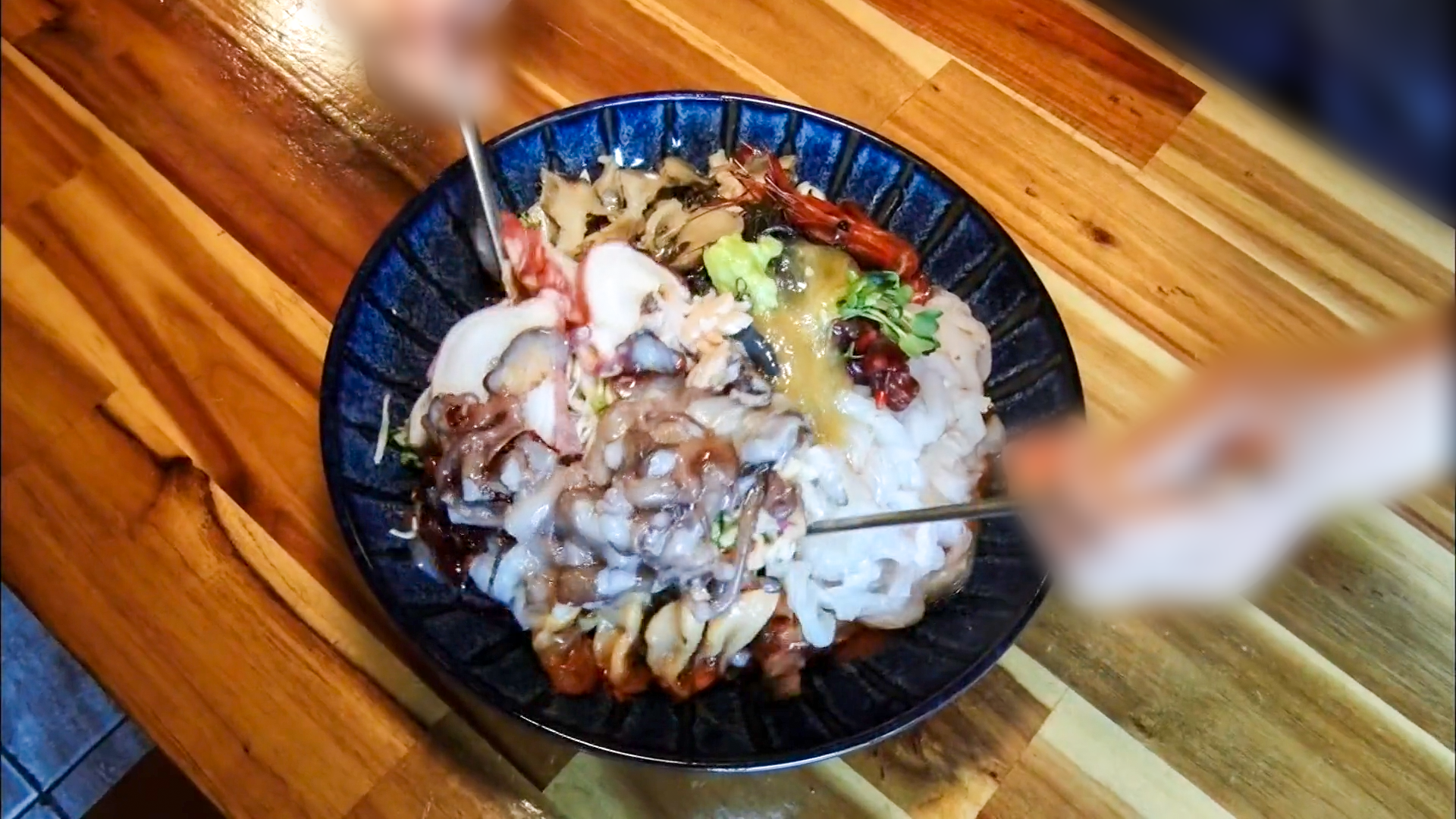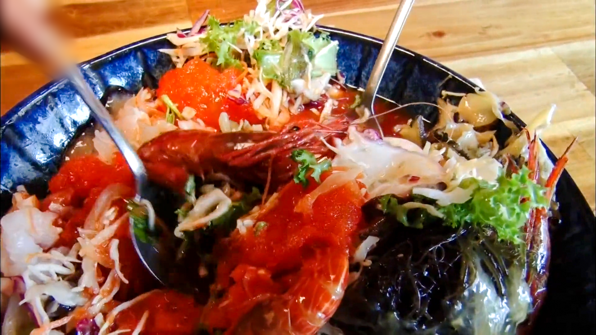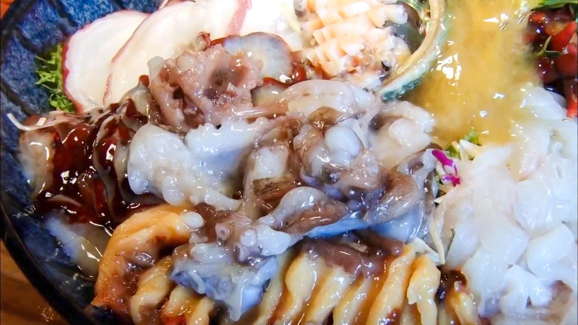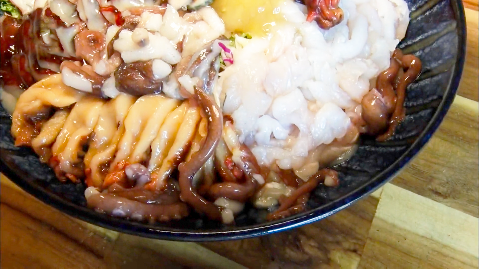 이 집의 대표 메뉴 '황제 물회'입니다. 싱싱한 해산물이 한가득 들어 있습니다.