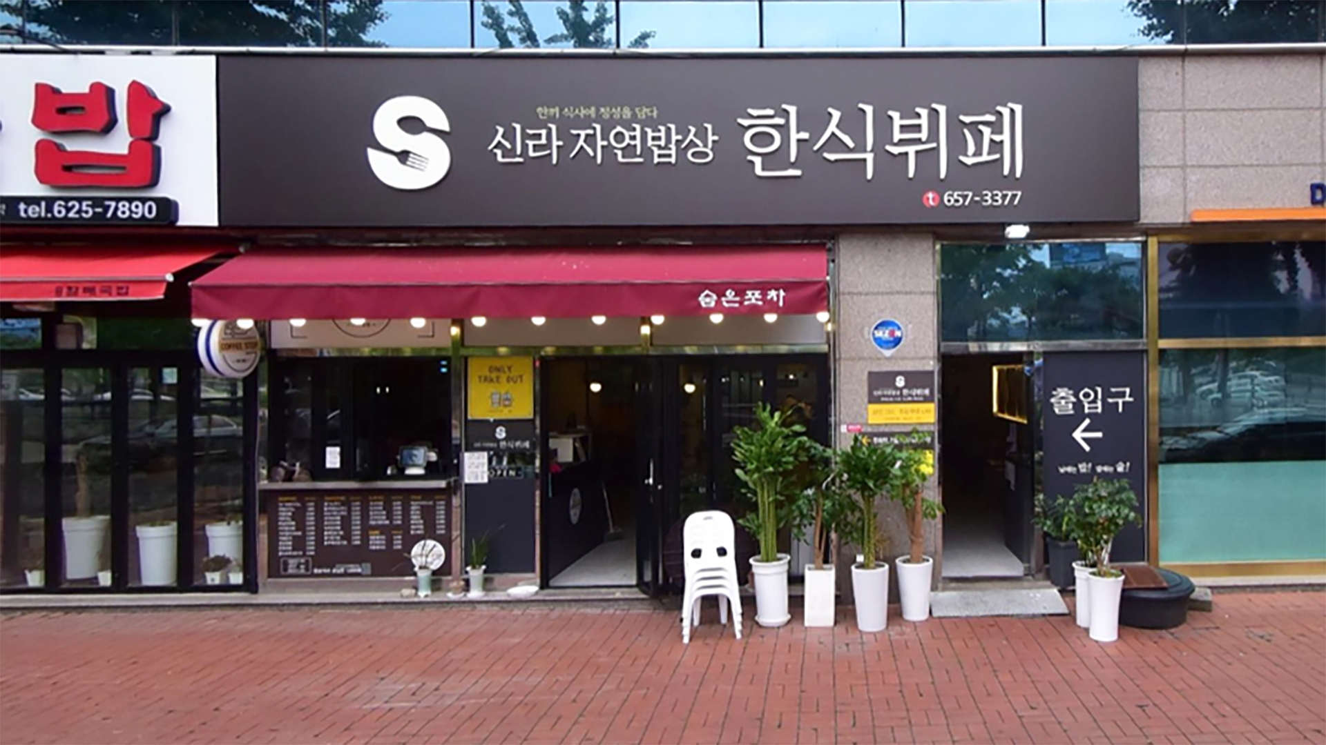 대구 맛집 '신라자연밥상한식뷔페'의 입구입니다. 두류역 두류네거리 경상병원 건물 1층에 위치하고 있으며 두류역 16번 출구에서 도보 1분~2분 걸리는 곳입니다. 두류역 바로 코앞이라 아주 쉽게 찾을 수 있습니다. 자차 이용 시에는 건물 뒤 타워주차장에 편하게 주차할 수 있습니다.
