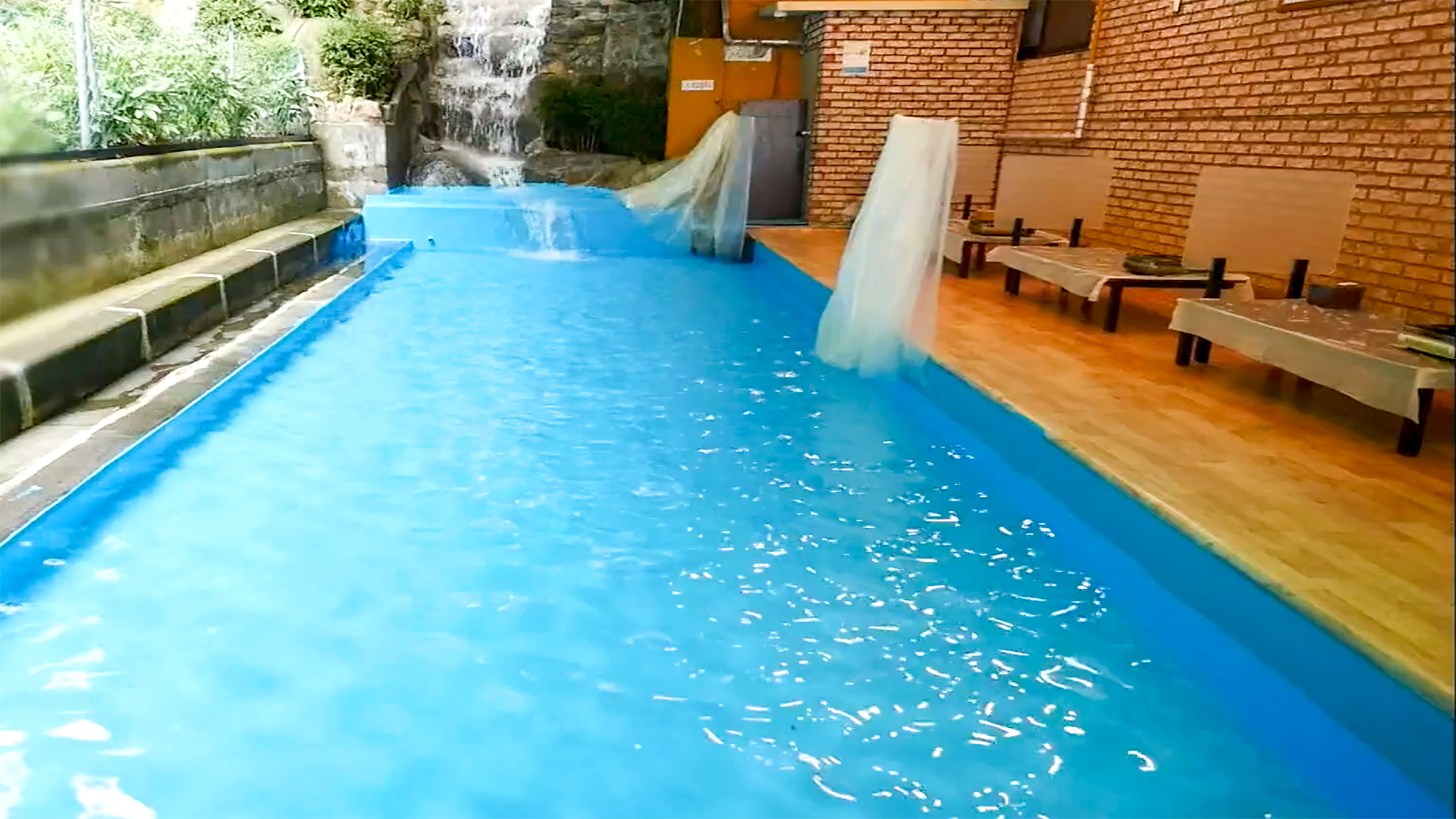 음식점 안에 수영장이 마련되어 있어 물놀이도 하고 발도 담그고 놀 수 있습니다.
