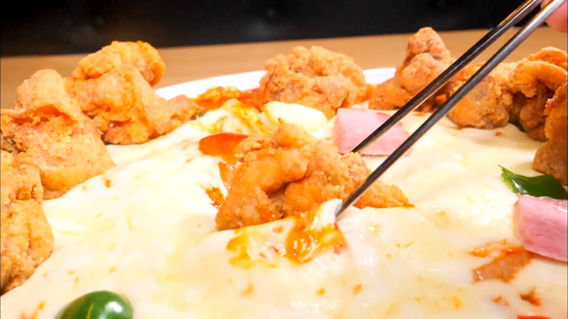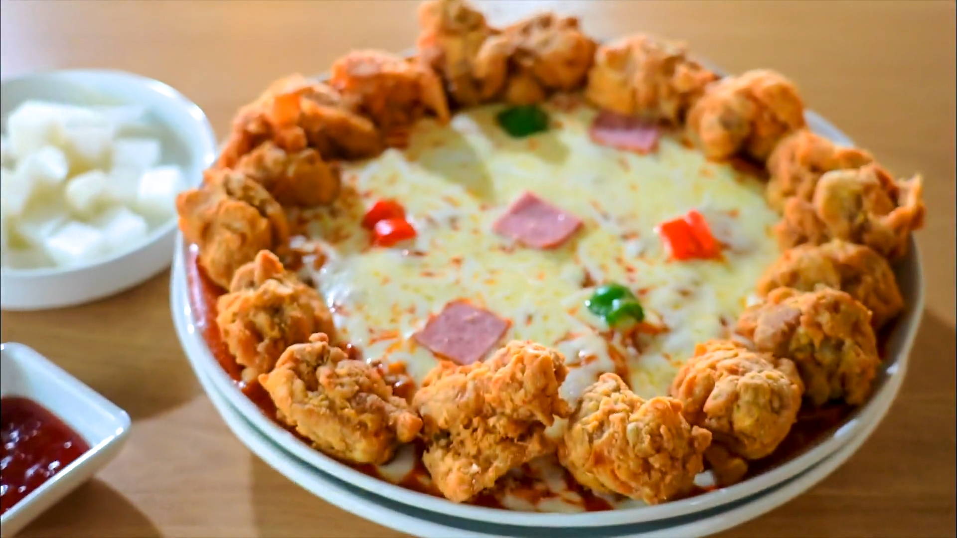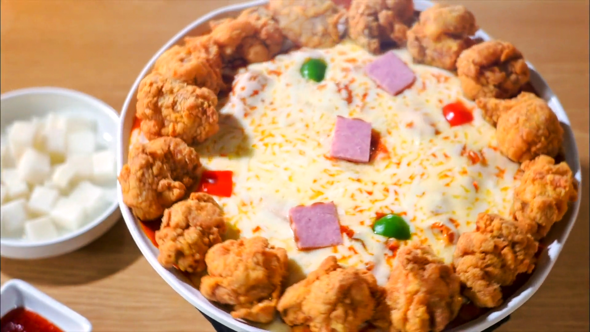떡볶이와 피차, 치킨, 김치를 결합시킨 치킨 피자 김치떡볶이 순살치킨입니다.