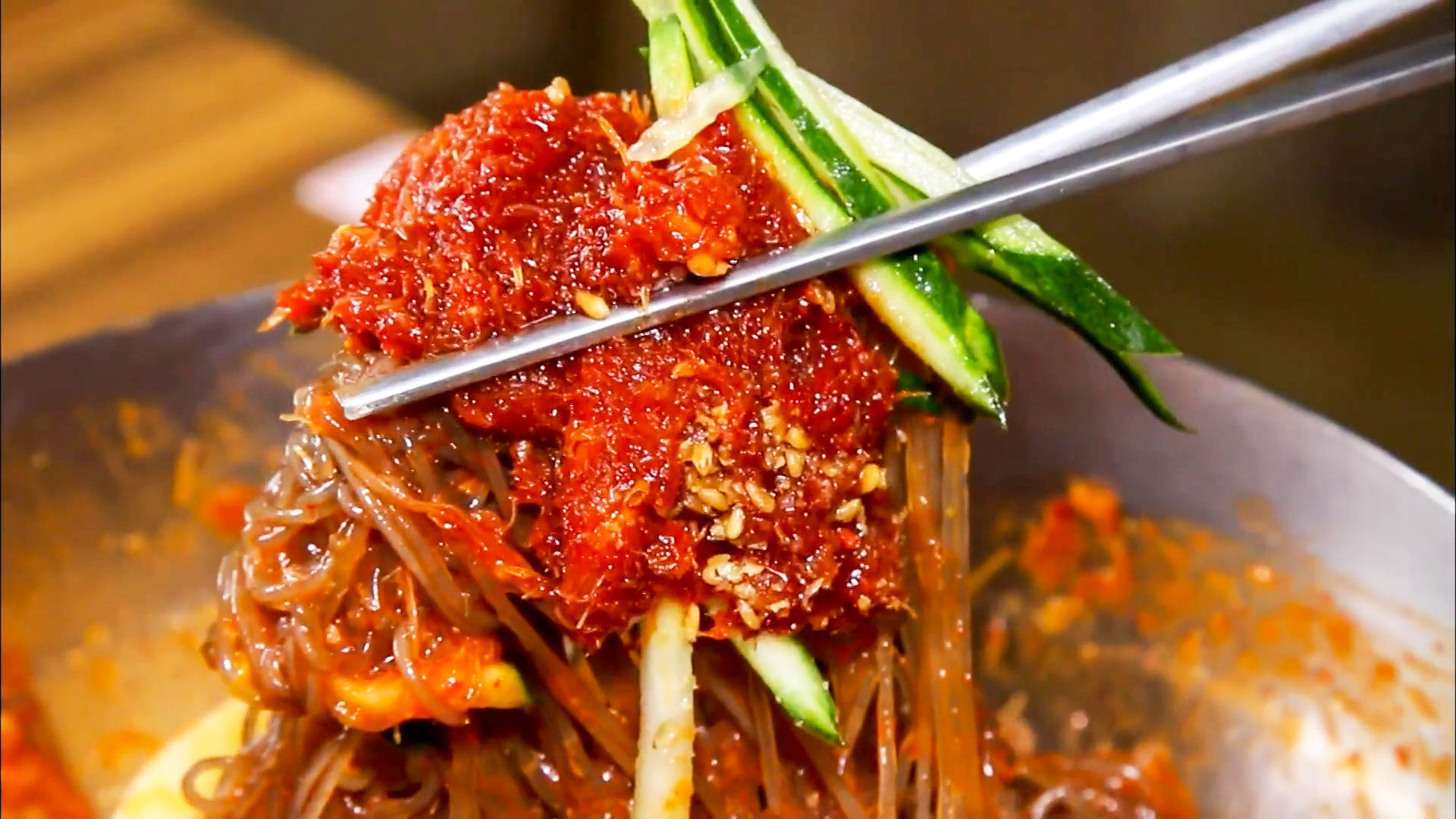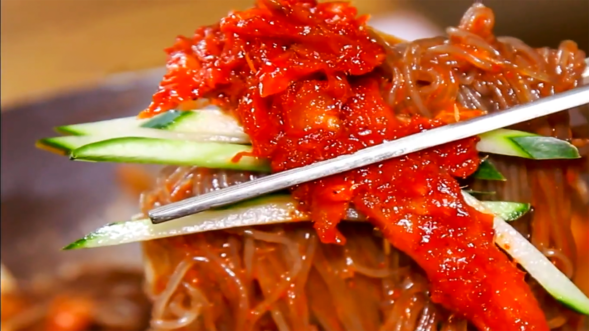 쫄깃한 면발에 빨간 명태회 고명이 아주 입맛을 당기게 합니다.