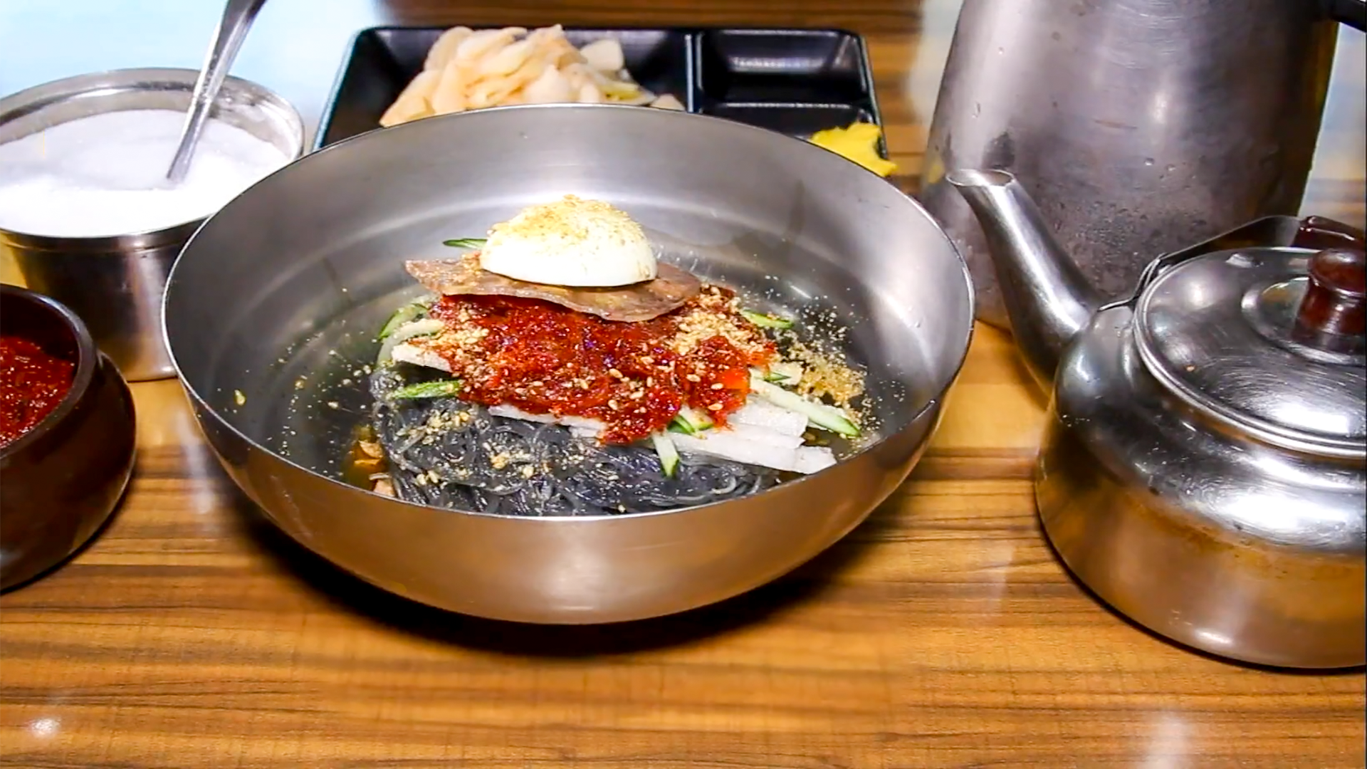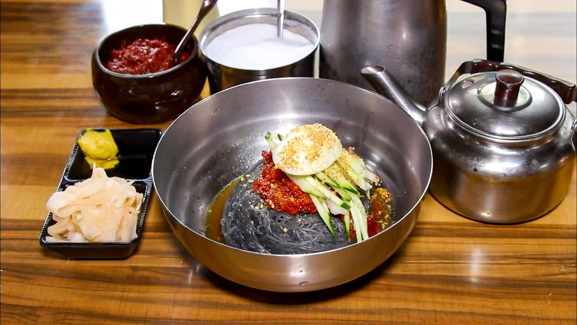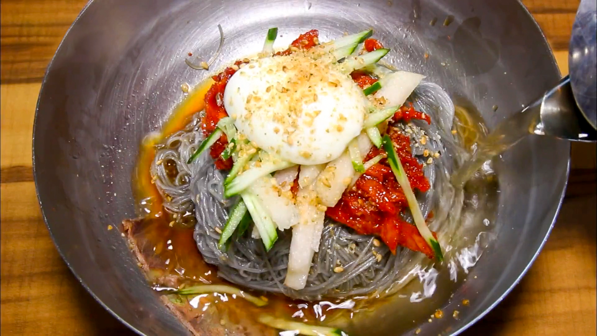시원하고 깔끔한 육수를 부어주면 물냉면으로 먹을 수 있습니다. 취향에 따라 비빔냉면, 물냉면 두 가지 방식으로 먹을 수 있으며 음식이 전체적으로 깔끔하고 개운한 맛이 납니다. 설탕 한 스푼, 식초 한 바퀴 , 양념장 한 스푼, 겨자 약간을 넣고 슥슥 비며 먹으면 아주 맛있게 먹을 수 있습니다.