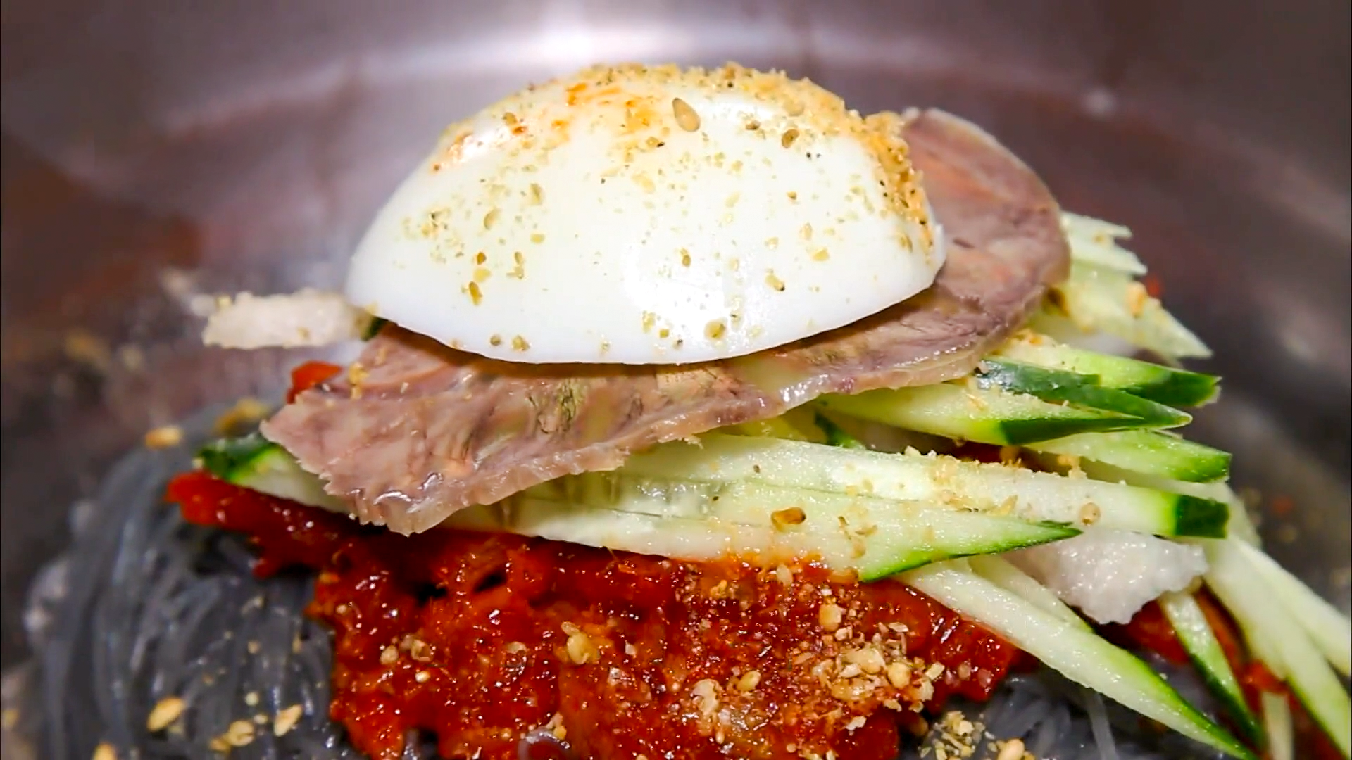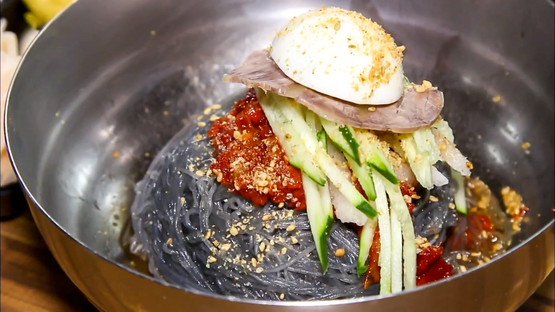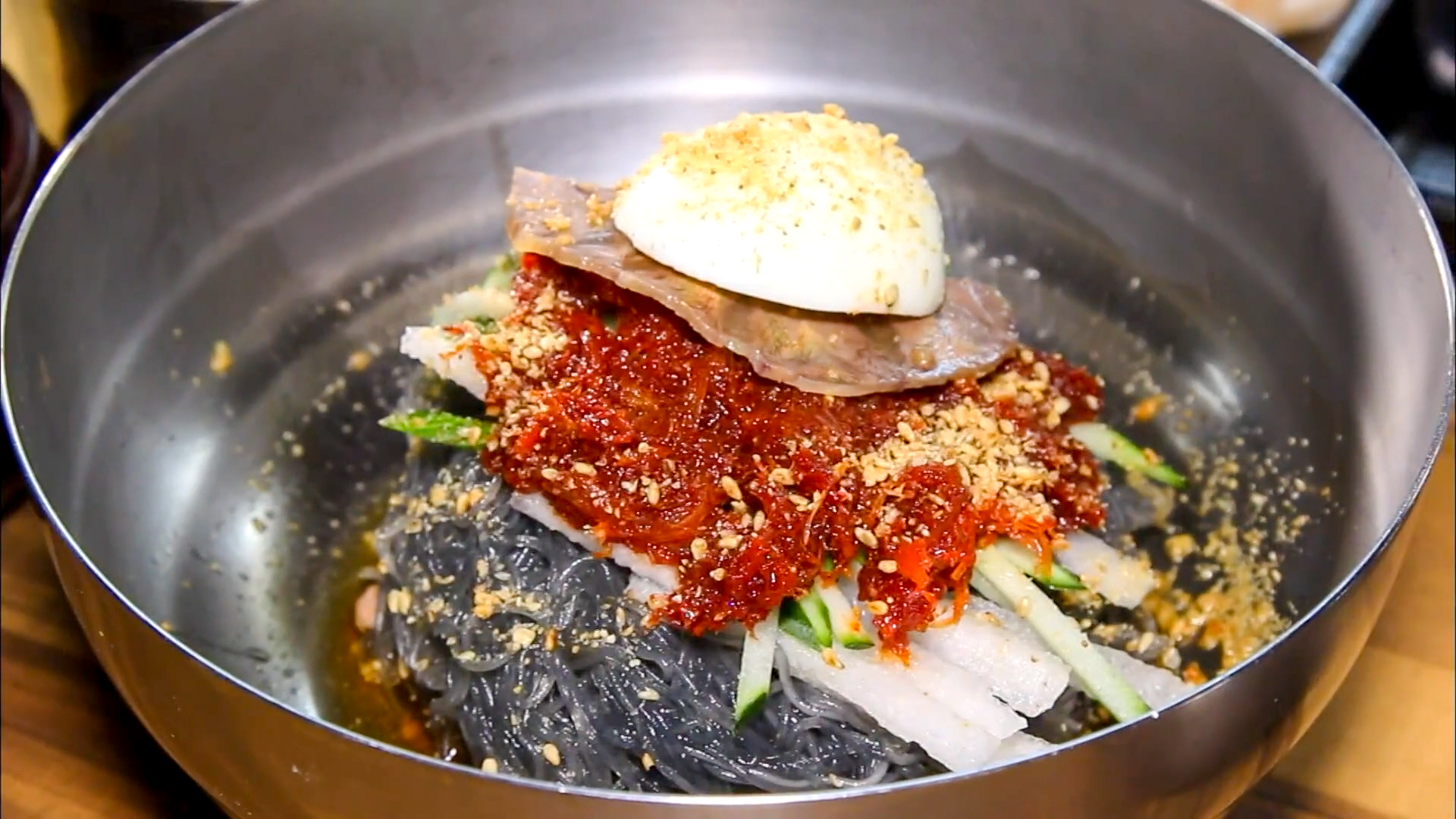 시원하고 깔끔한 육수를 부어주면 물냉면으로 먹을 수 있습니다. 취향에 따라 비빔냉면, 물냉면 두 가지 방식으로 먹을 수 있으며 음식이 전체적으로 깔끔하고 개운한 맛이 납니다. 설탕 한 스푼, 식초 한 바퀴 , 양념장 한 스푼, 겨자 약간을 넣고 슥슥 비며 먹으면 아주 맛있게 먹을 수 있습니다.