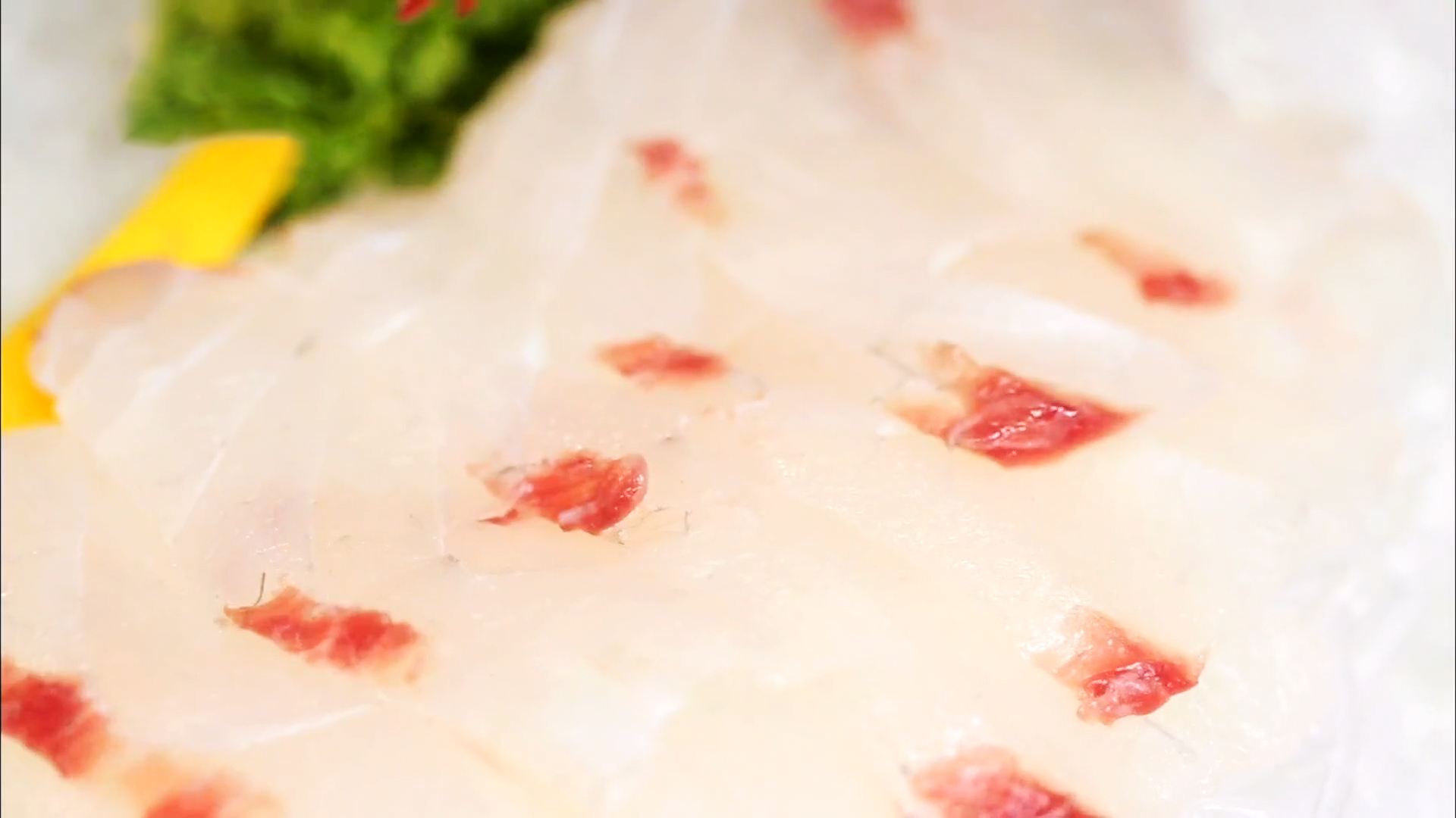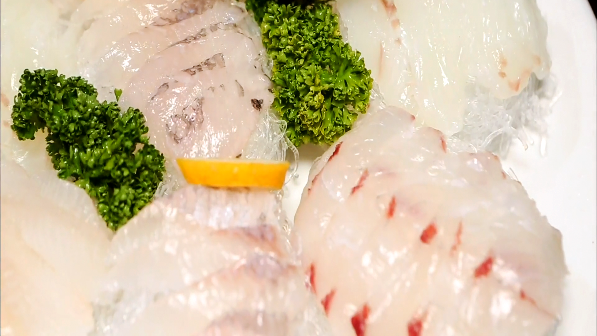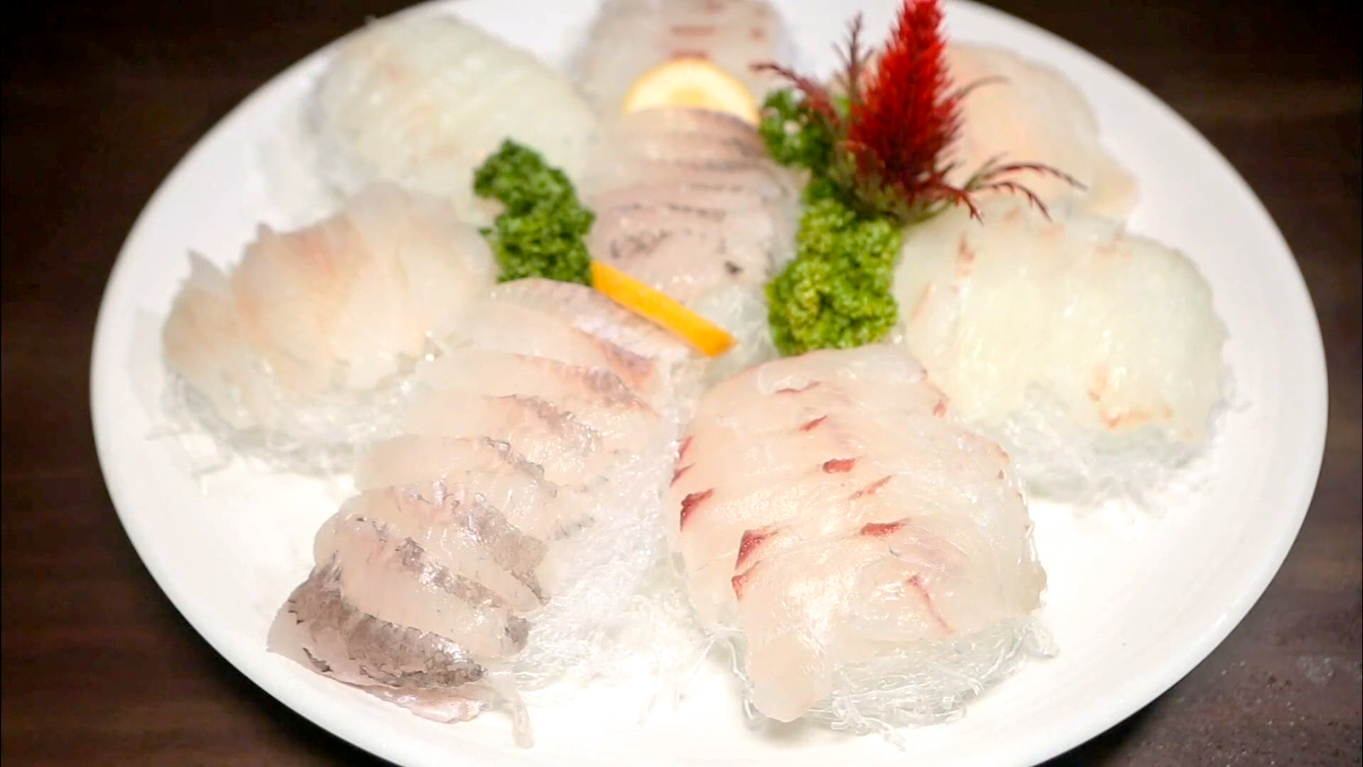괴도라치(전복치)회입니다. 괴도라치는 동해에서 주로 서식하며 쫄깃하면서 고소한 맛이 특징입니다. 양식이 불가능해 100% 자연산으로만 즐길 수 있는 생선입니다.
