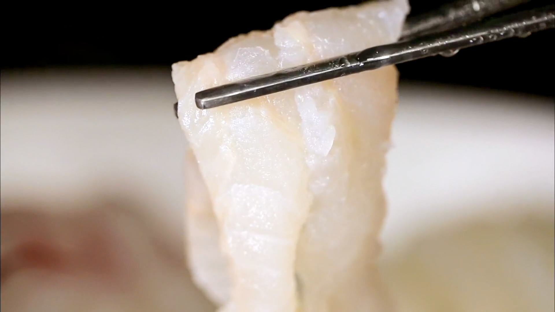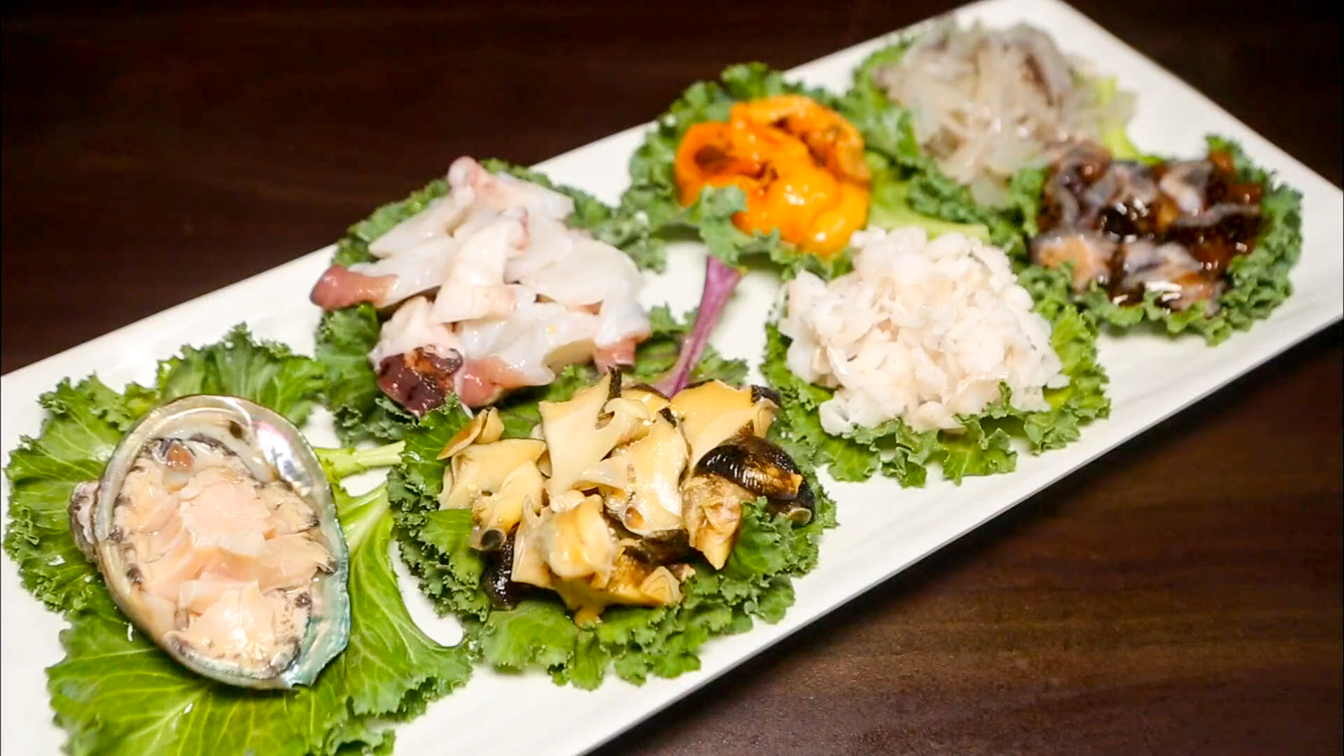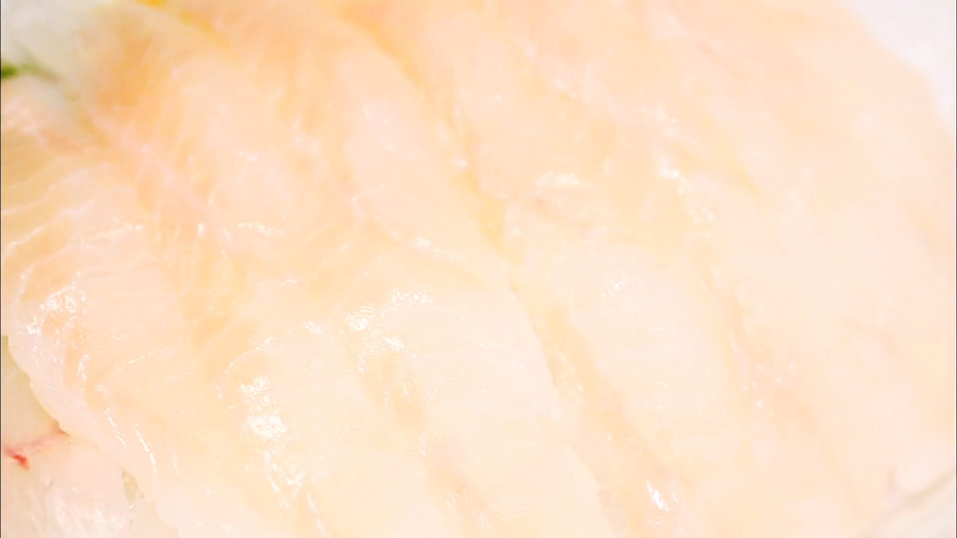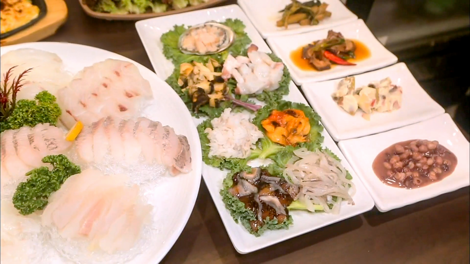 괴도라치(전복치)회입니다. 괴도라치는 동해에서 주로 서식하며 쫄깃하면서 고소한 맛이 특징입니다. 양식이 불가능해 100% 자연산으로만 즐길 수 있는 생선입니다.