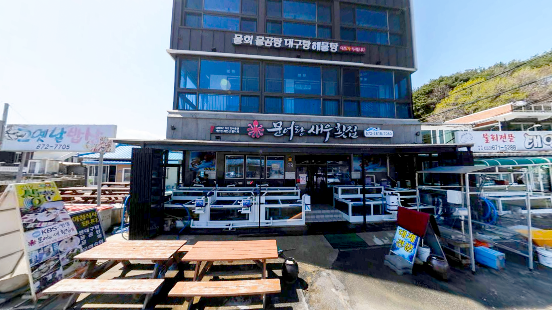 양양 맛집 '문어랑새우횟집'외관입니다. 수산항 바로 앞에 있으며 양양 쏠비치 근처에 위치하고 있습니다. 수산항으로 들어가는 직선 도로에 있습니다.