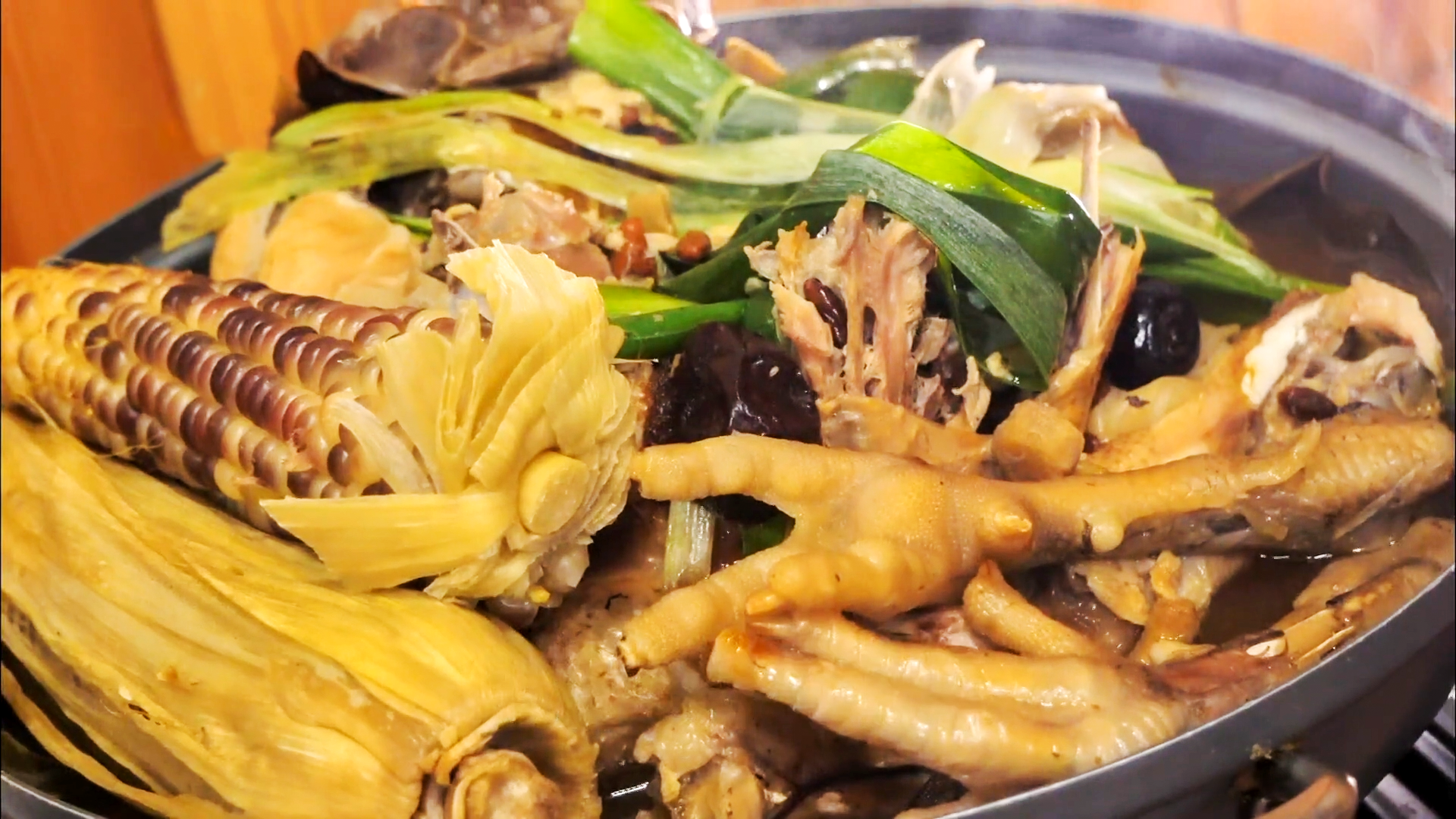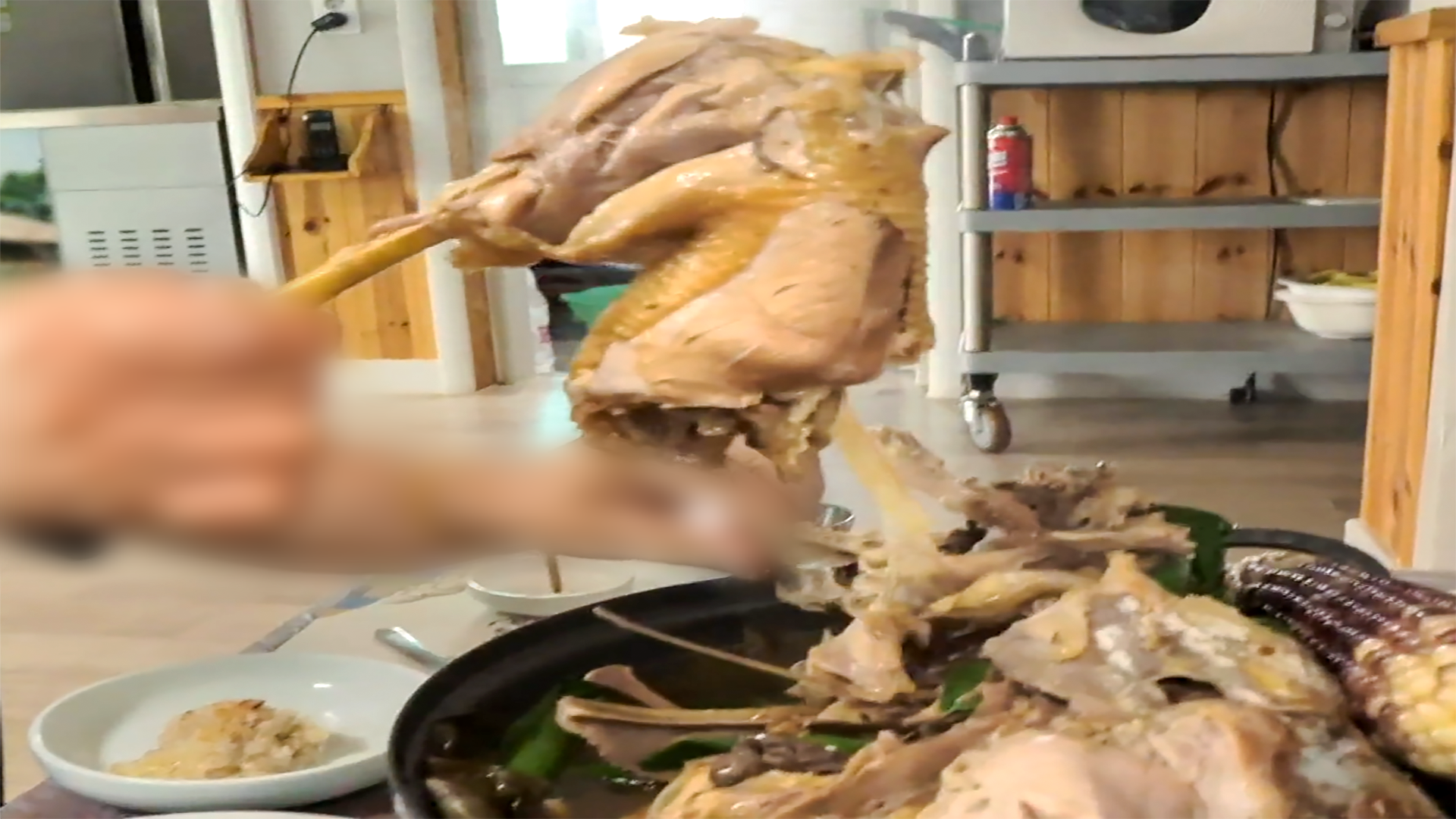 연잎을 넣은 닭백숙입니다. 강원도 옥수수와 밤, 대추, 마늘, 생강, 양파, 엄나무, 구기자 등 각종 한약재와 채소들이 아주 푸짐하게 들어가 있습니다.