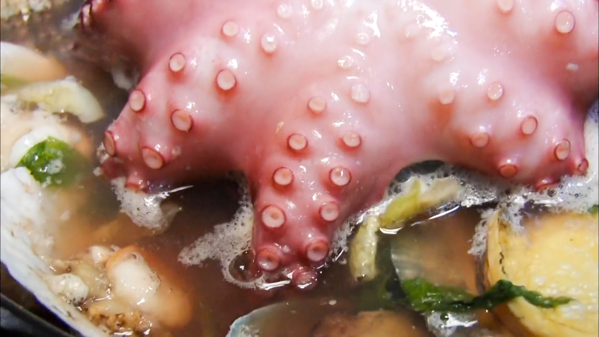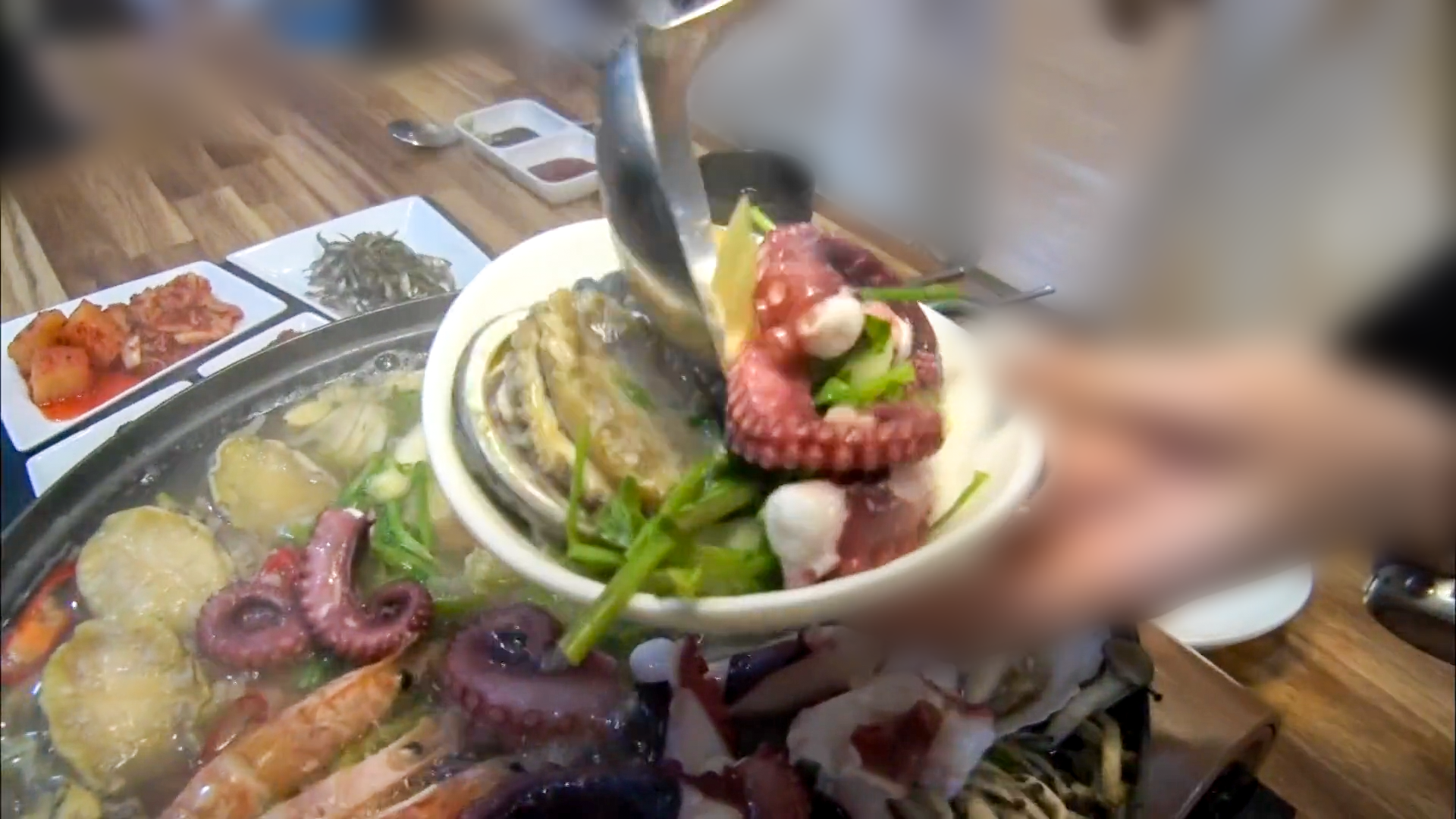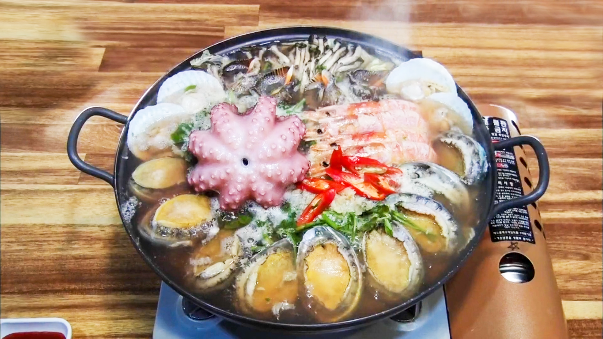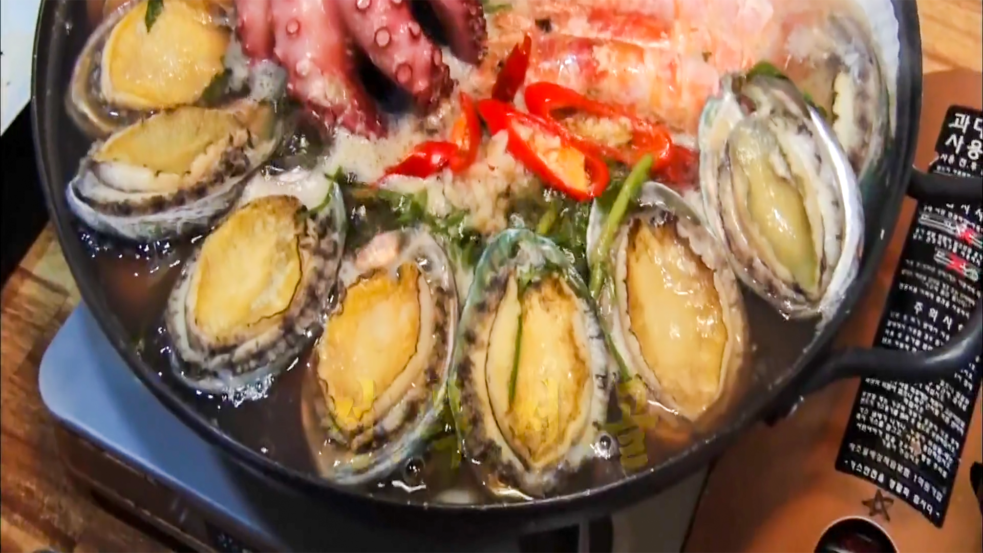 이 집의 대표 메뉴 중 하나인 '전복전골'입니다. 전복, 문어 가리비, 새우, 버섯 등 각종 재료가 푸짐하게 들어가 있습니다.