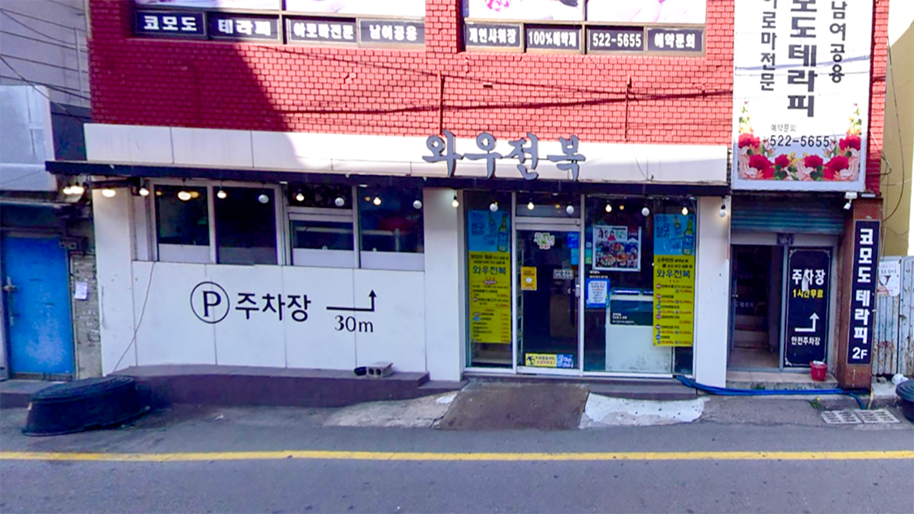 부산 맛집 '와우전복뚝배기돌솥밥'의 입구입니다. 4호선 서동역 3번 출구에서 도보로 약 3분~4분 정도의 거리에 위치하고 있으며 금사 교차로 근처에 위치하고 있습니다. 자차 이용 시 30m 떨어져 있는 안전 민영주차장에 주차할 수 있으며 와우전복에서 식사를 하고 도장을 받아오면 1시간 무료로 주차할 수 있습니다.