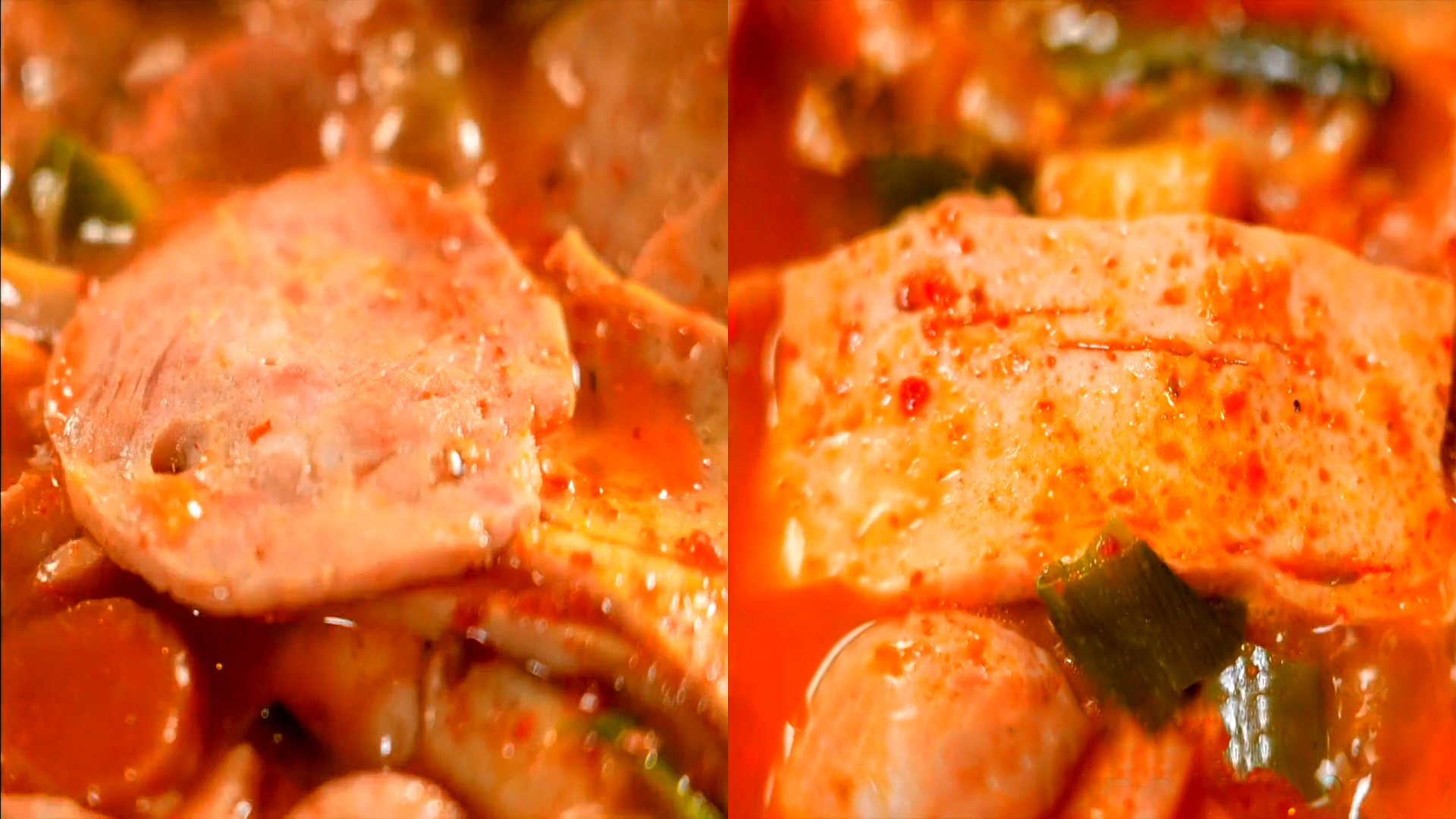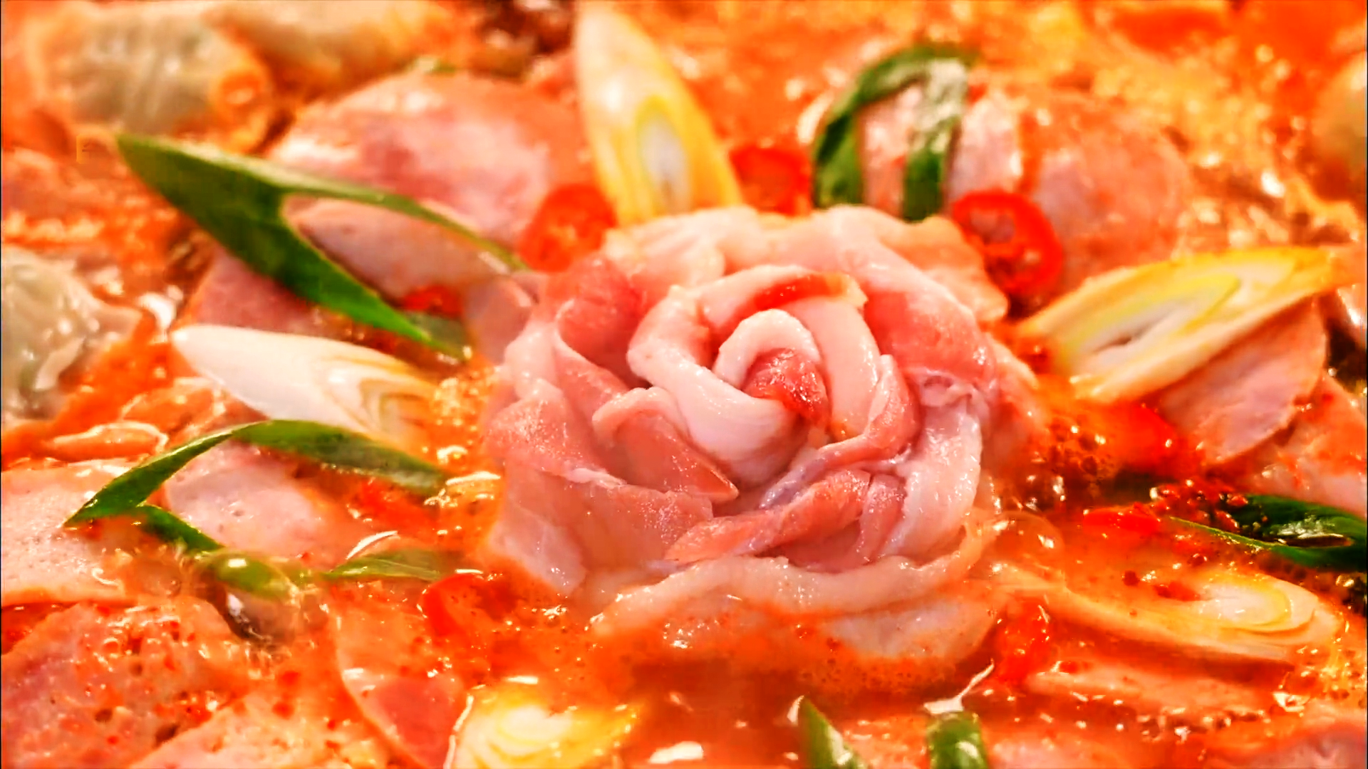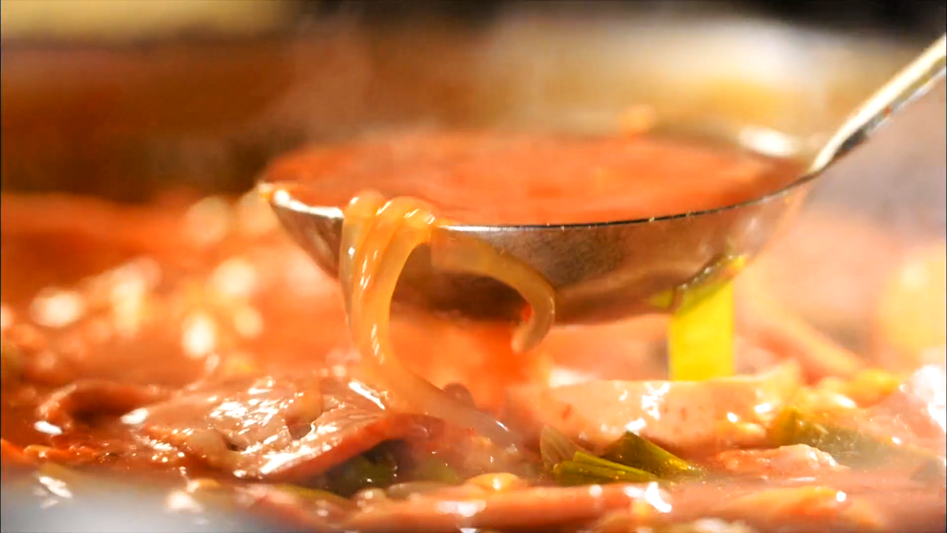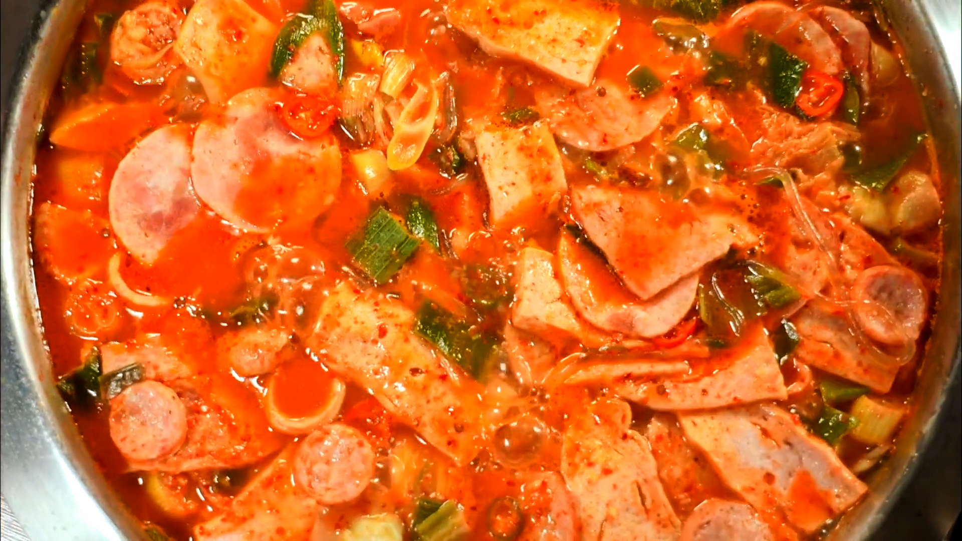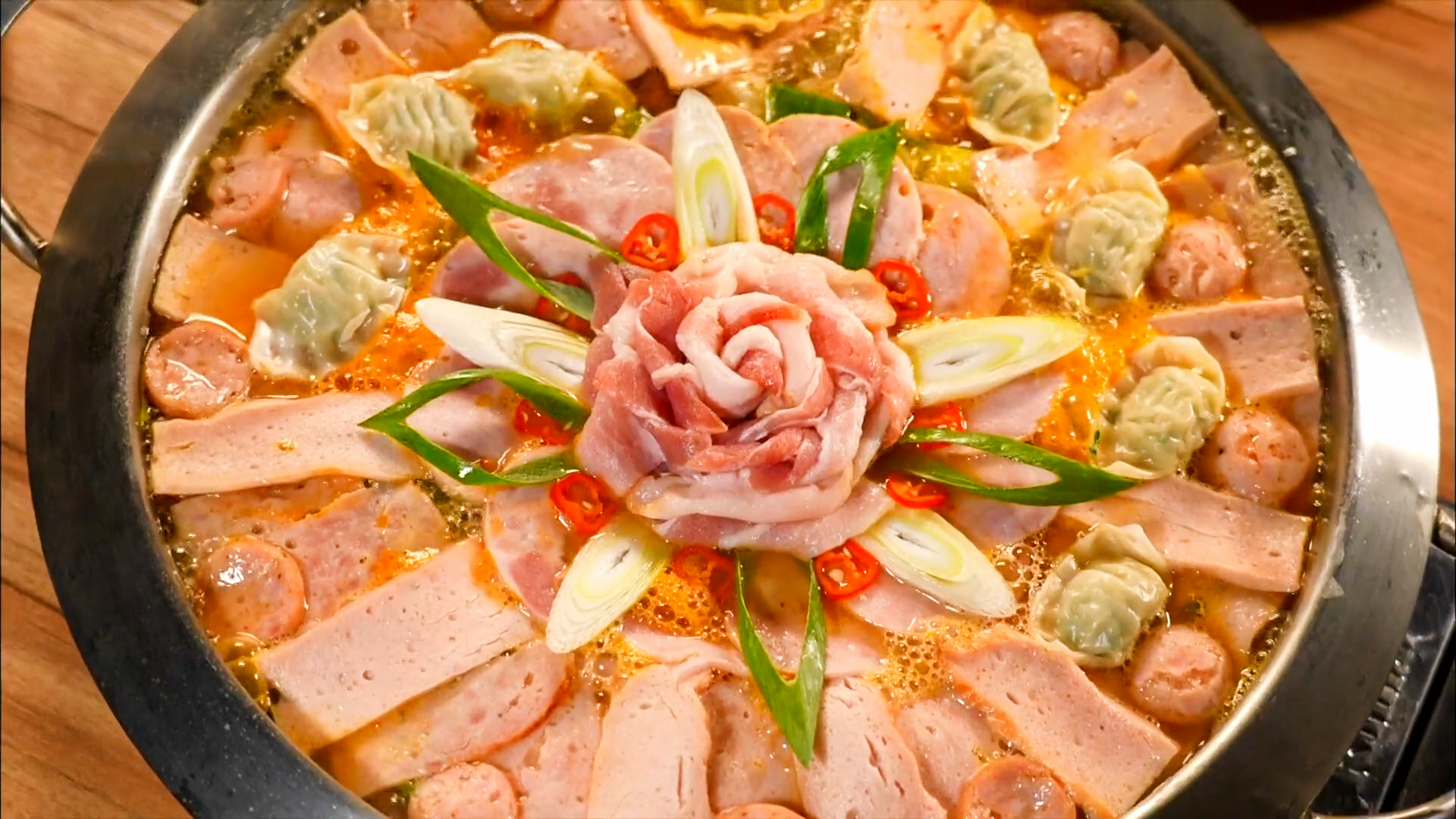 이 집의 대표 메뉴 '수제햄 고래꽃 부대찌개'입니다.