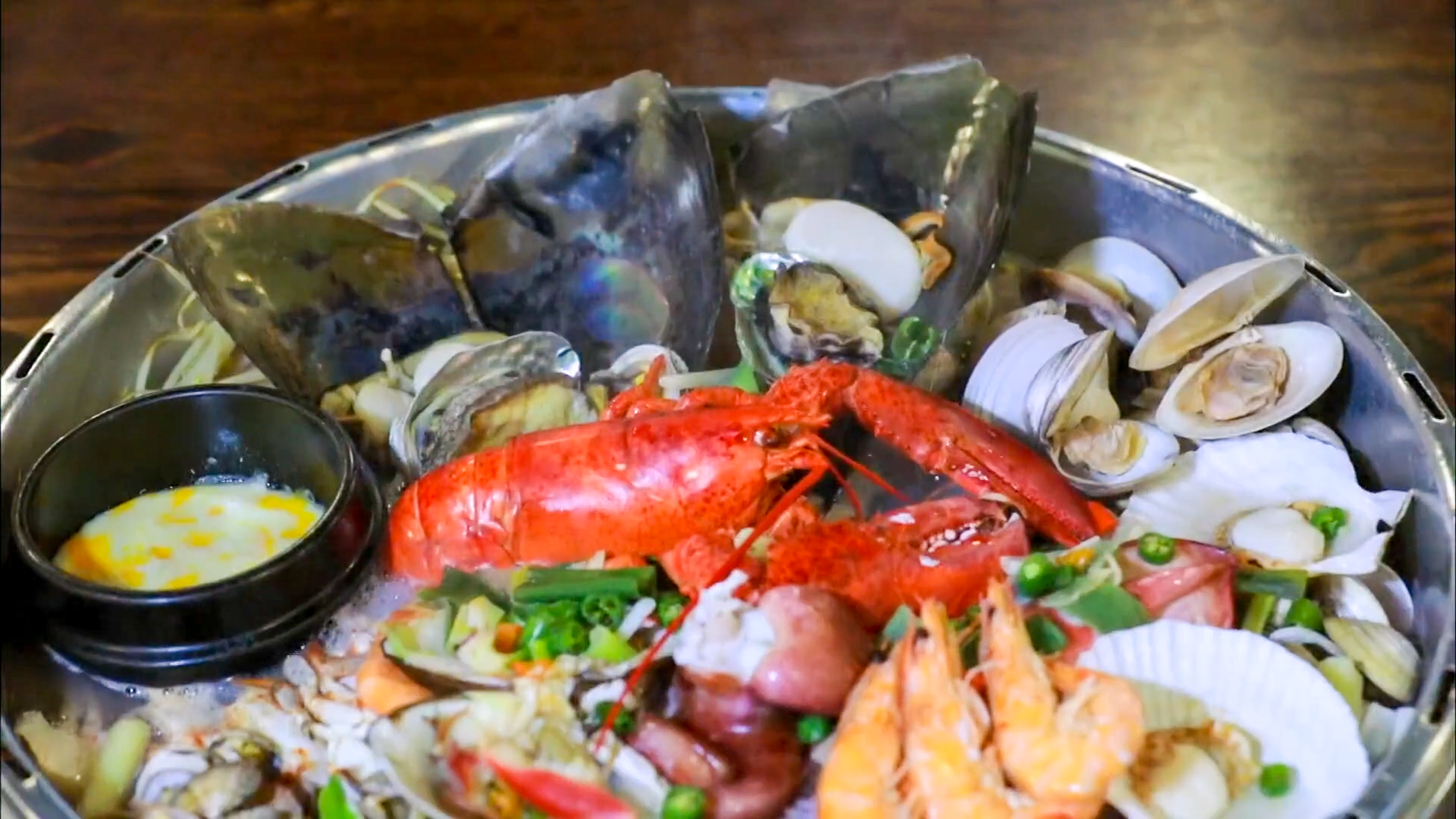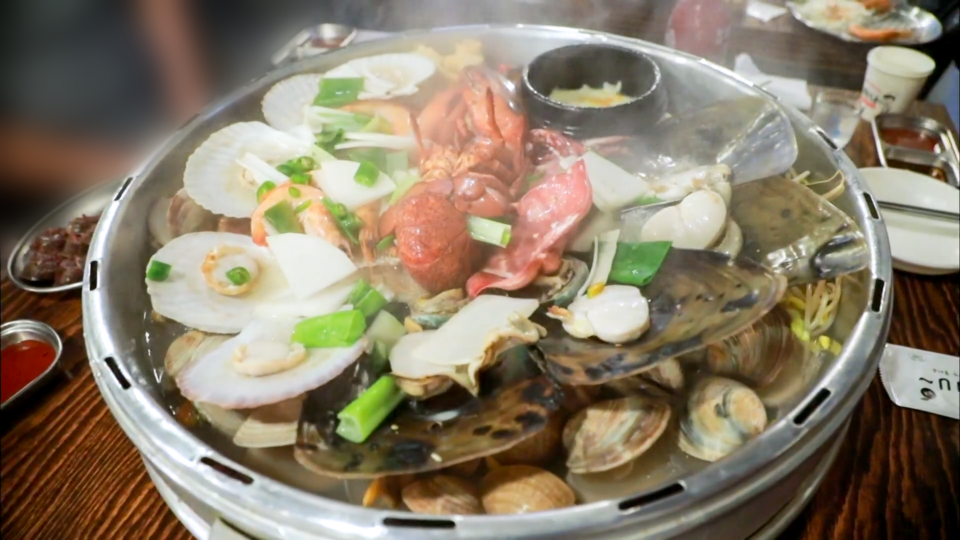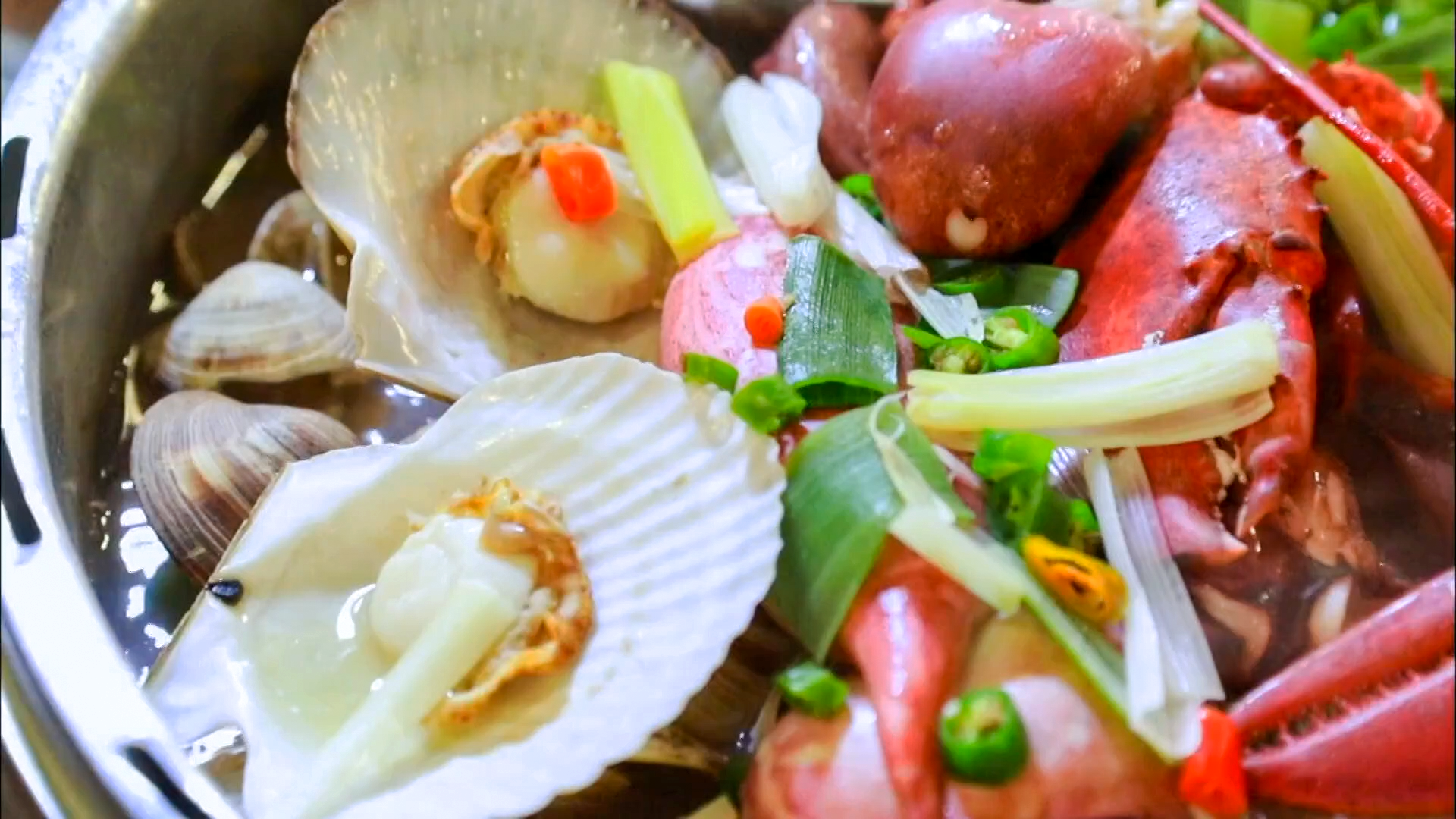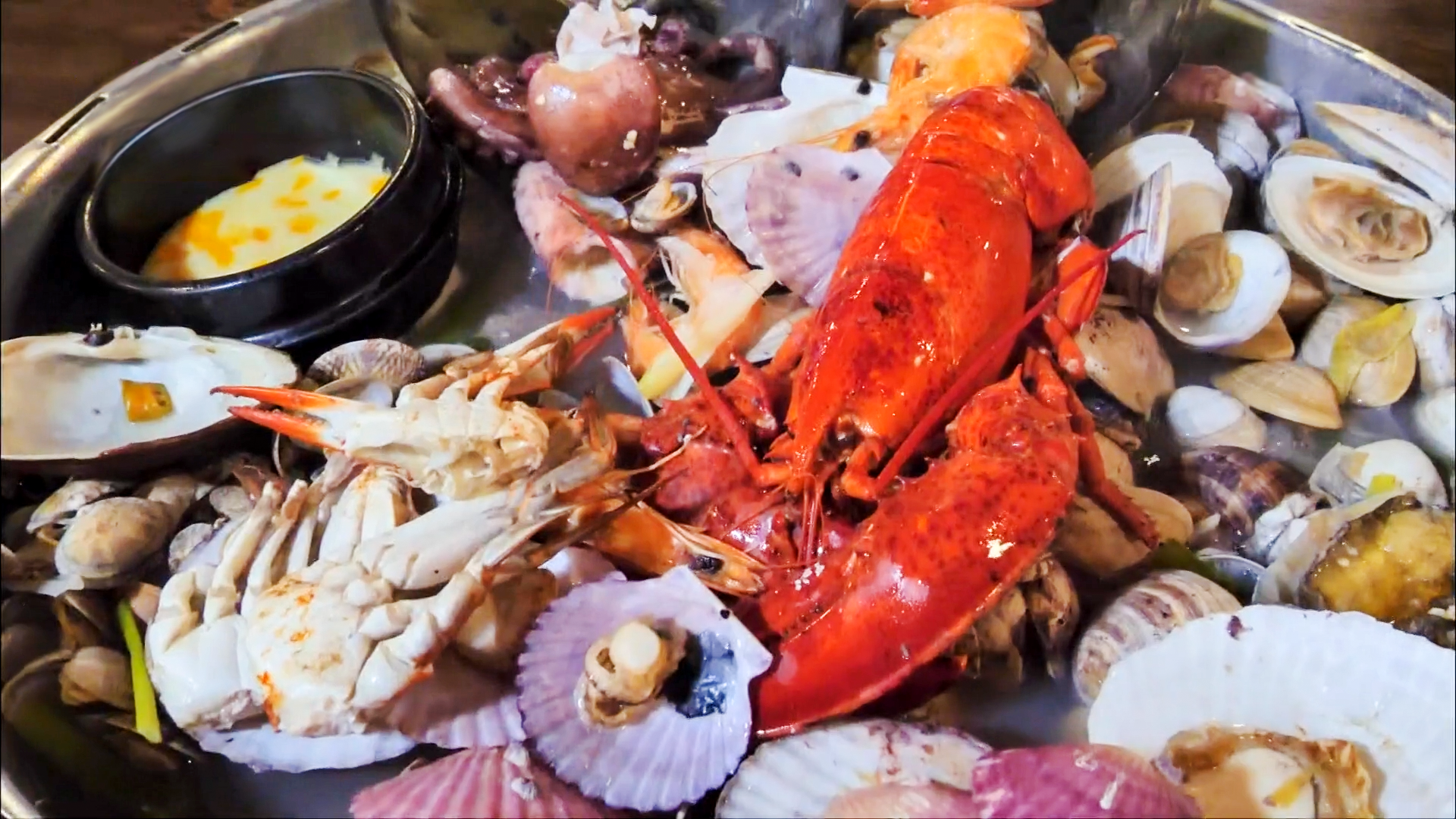 큼지막한 랍스터, 키조개, 가리비, 바지락, 전복, 꽃게 등 다양한 해산물이 들어가 있습니다.