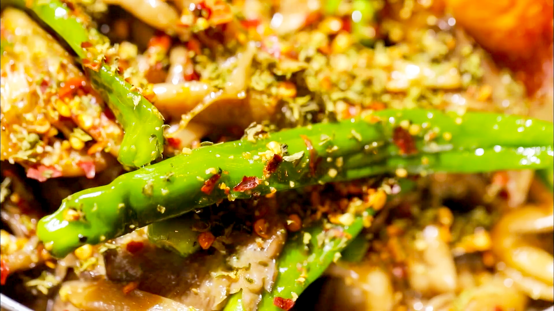 마늘 기름에 느타리버섯과, 꽈리고추가 아주 잘 어우러져 있습니다.