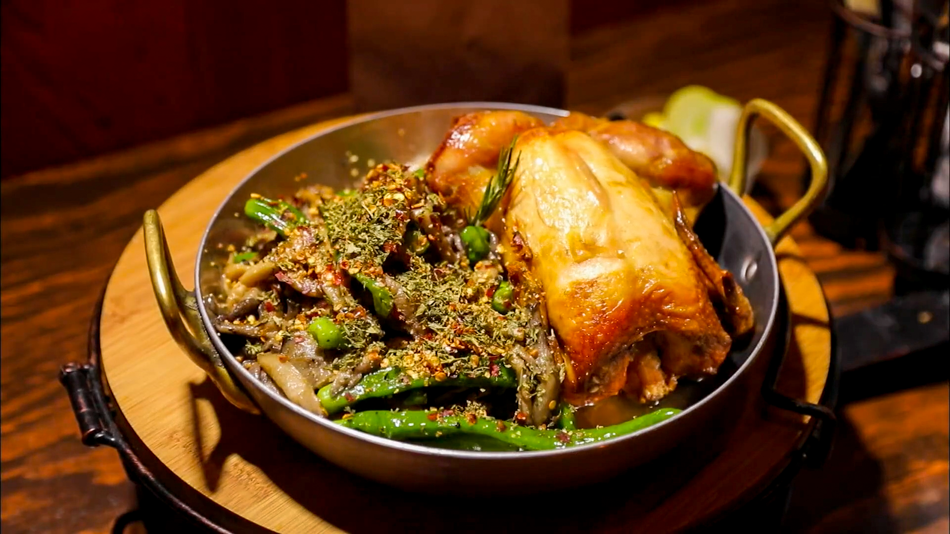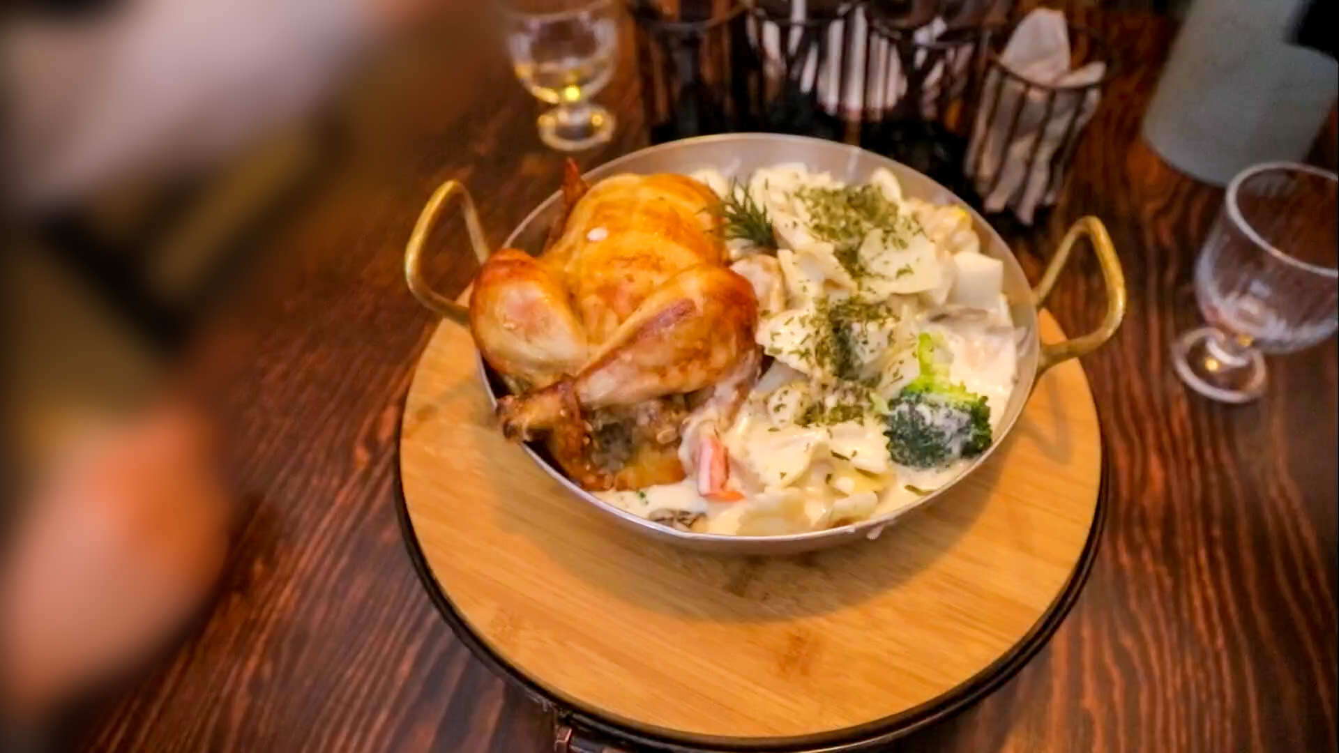 이 집의 대표 메뉴 '꽈리고추 알리오 로스트 치킨'입니다.