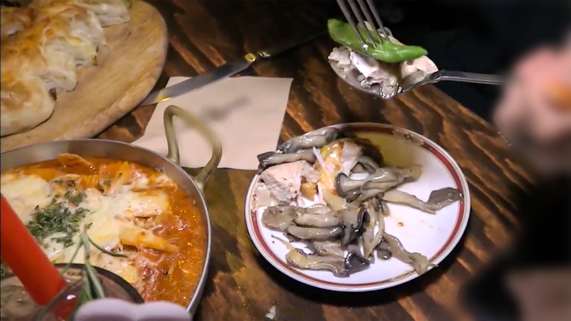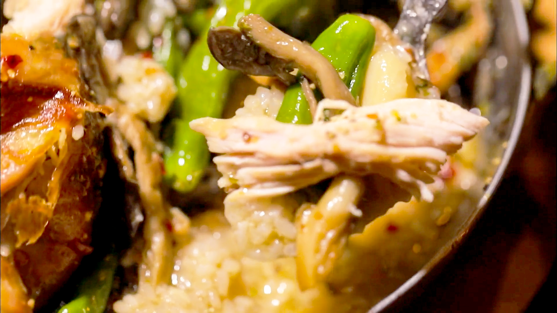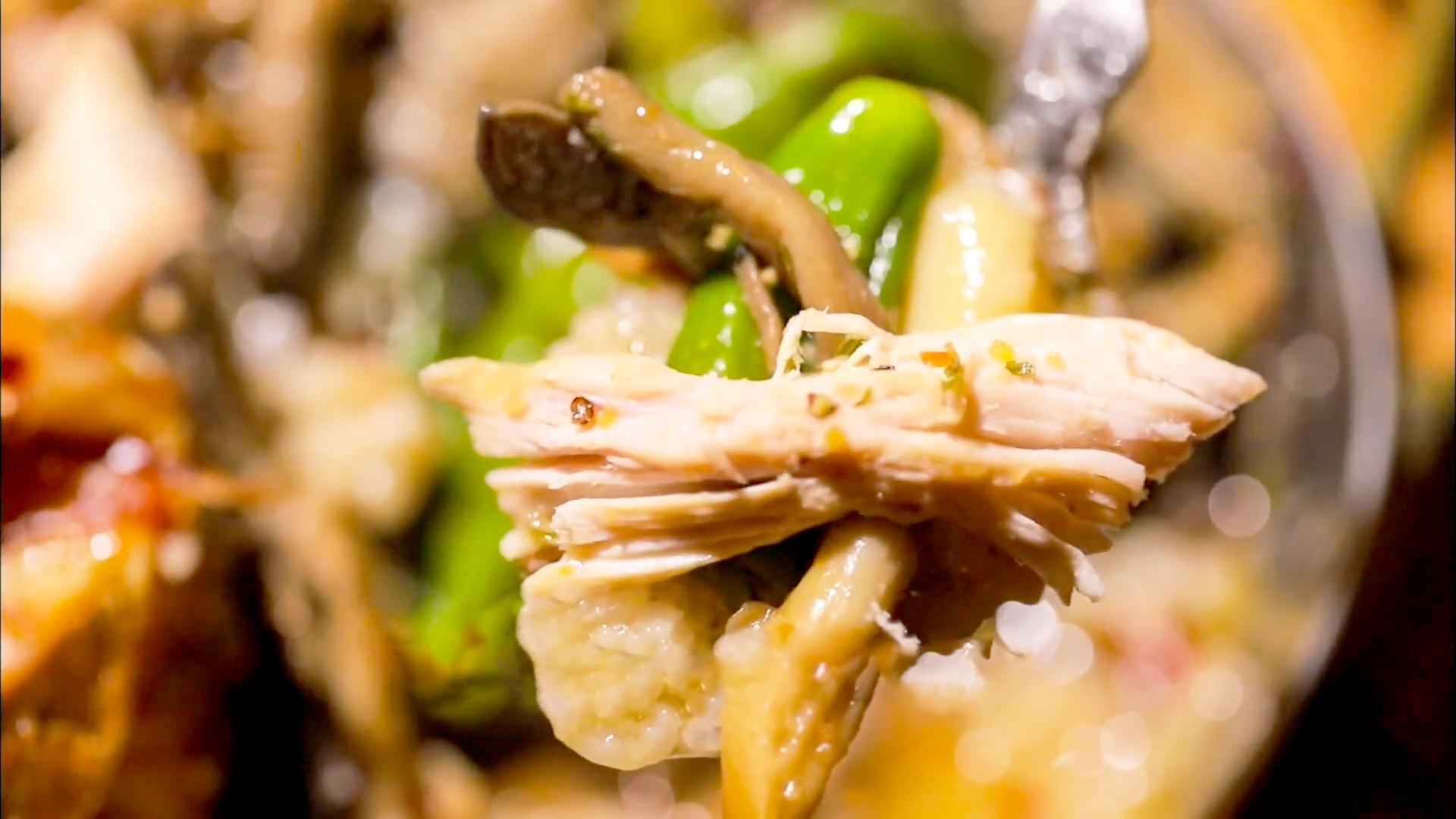 부드러운 치킨에 느타리버섯, 꽈리고추를 올려 먹으면 완전 꿀맛입니다.