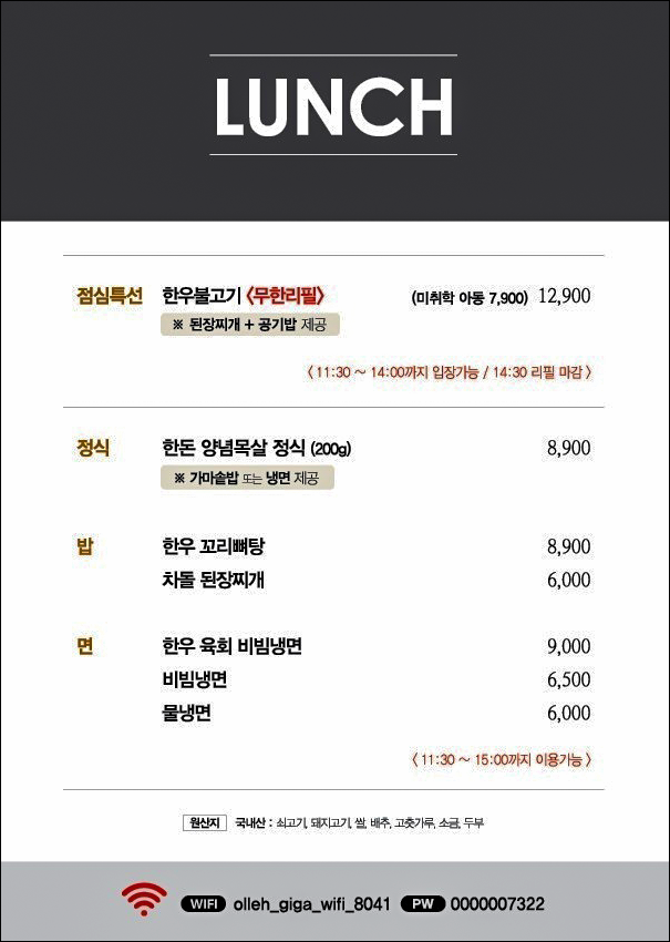 한우불고기 무제한 12,900원, 미취학 아동 7,900원 : 점심 특선 메뉴로 11:30 - 14:00 입장 가능 / 14:30 리필 마감
