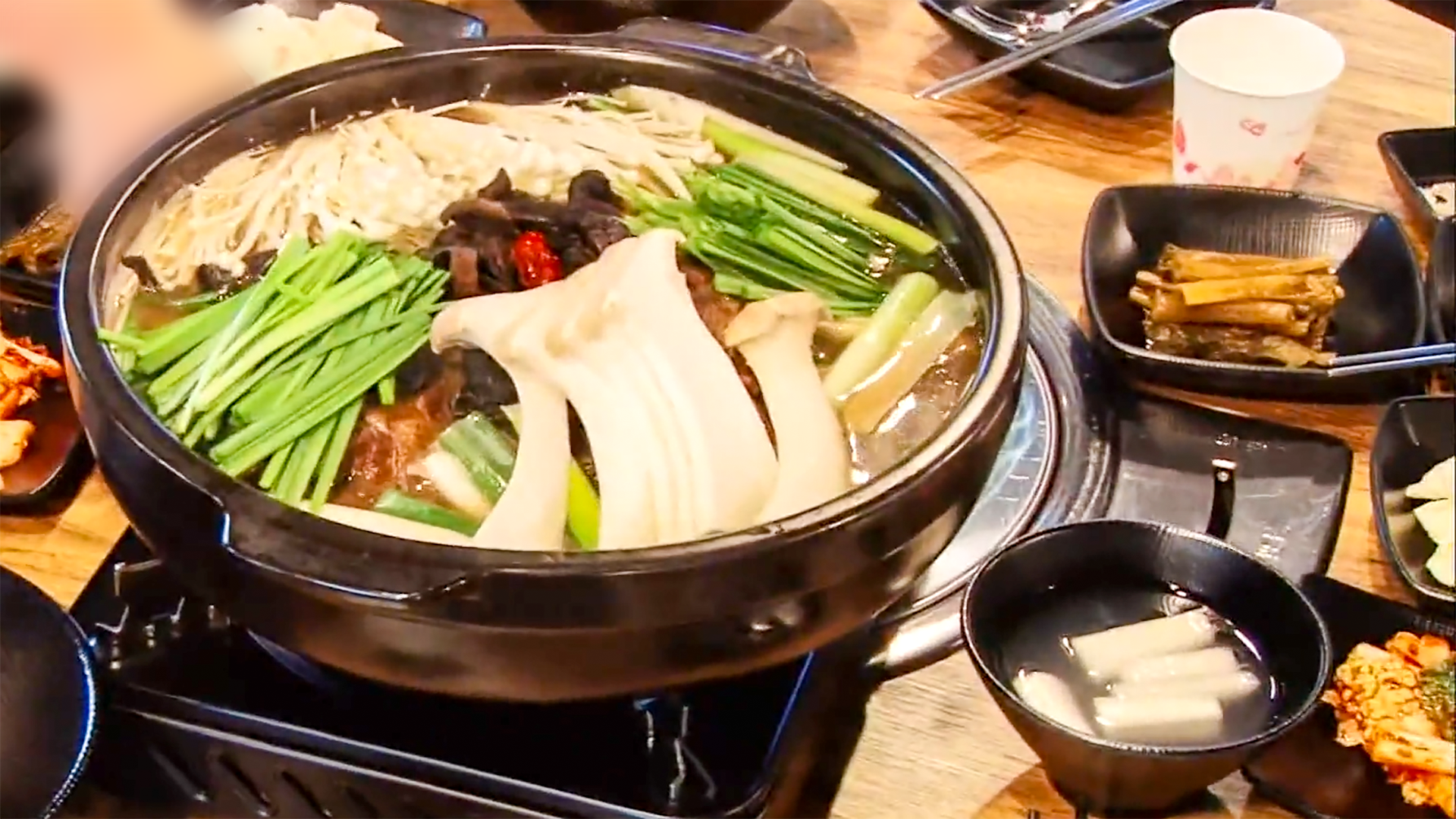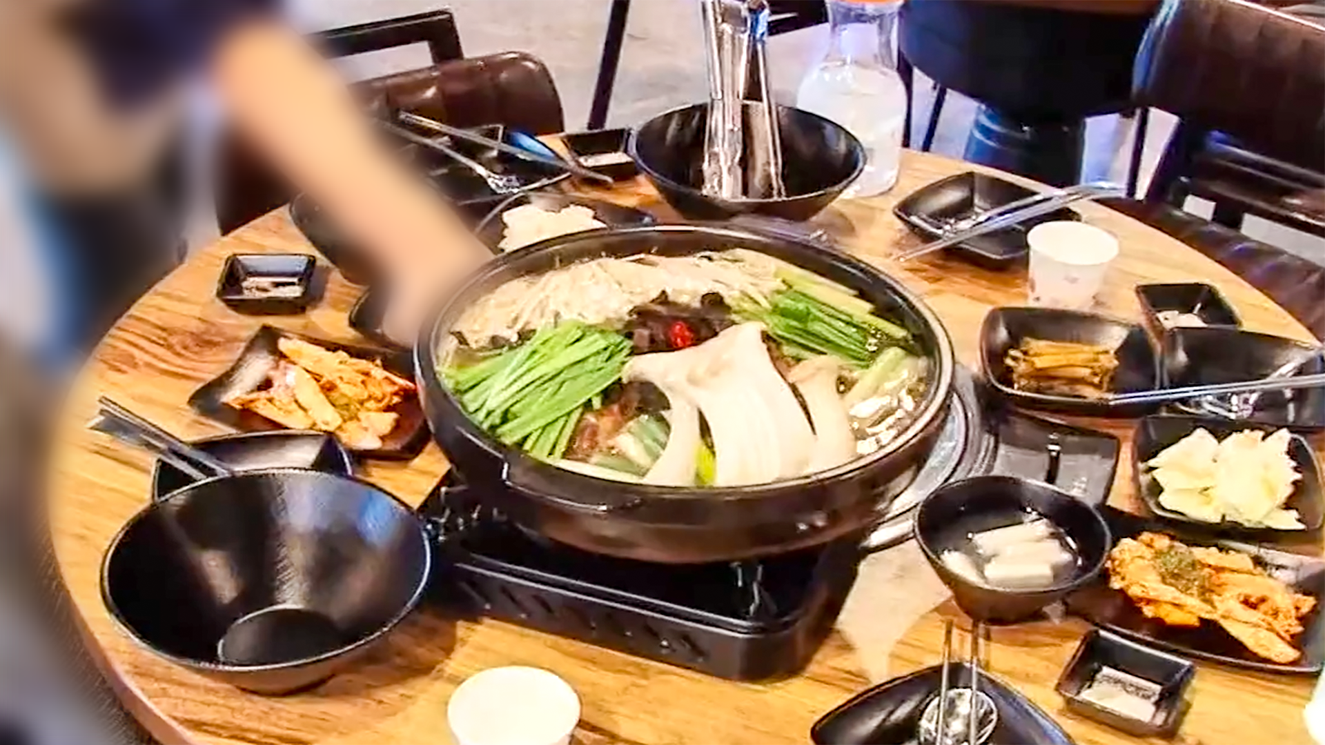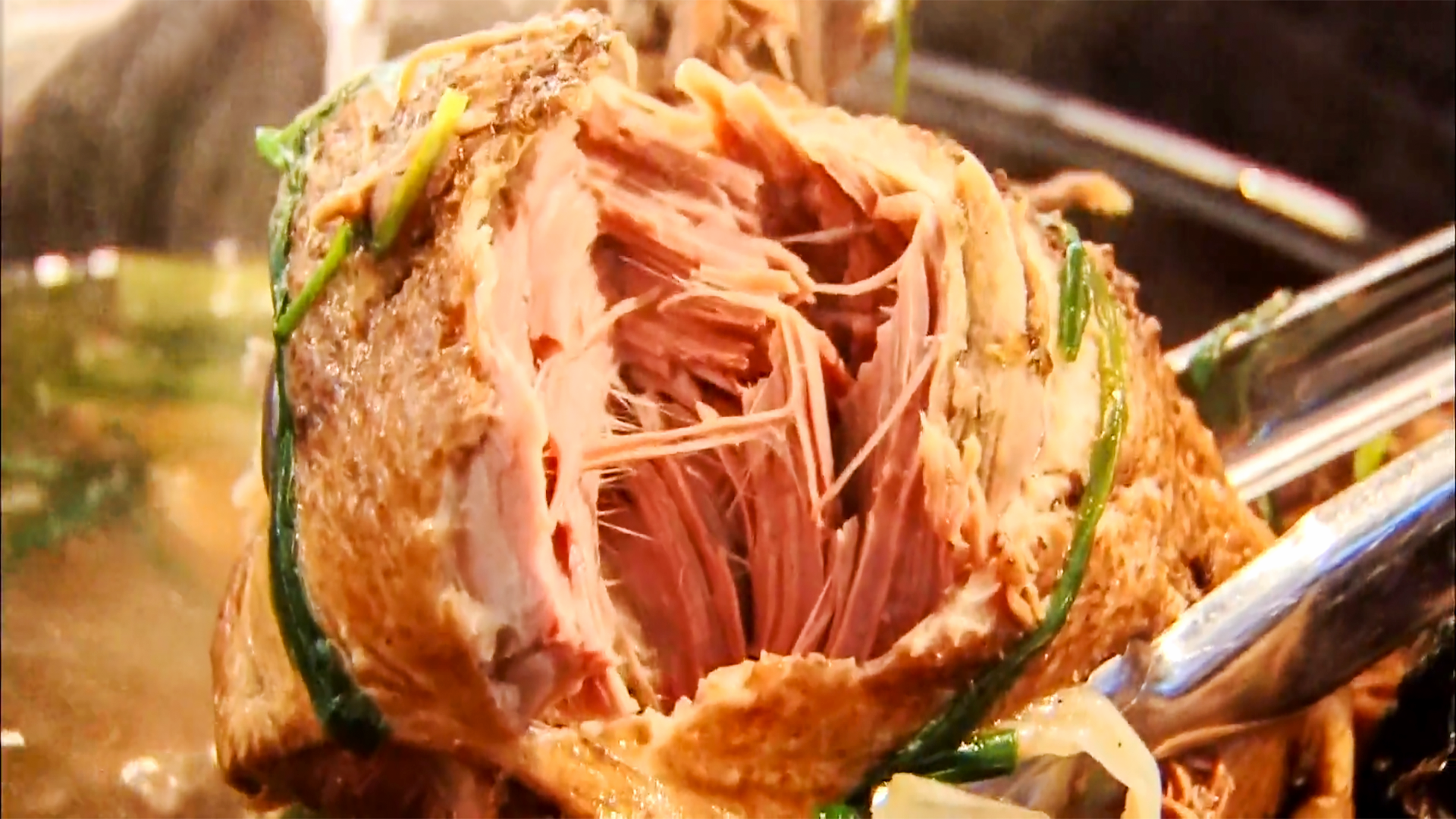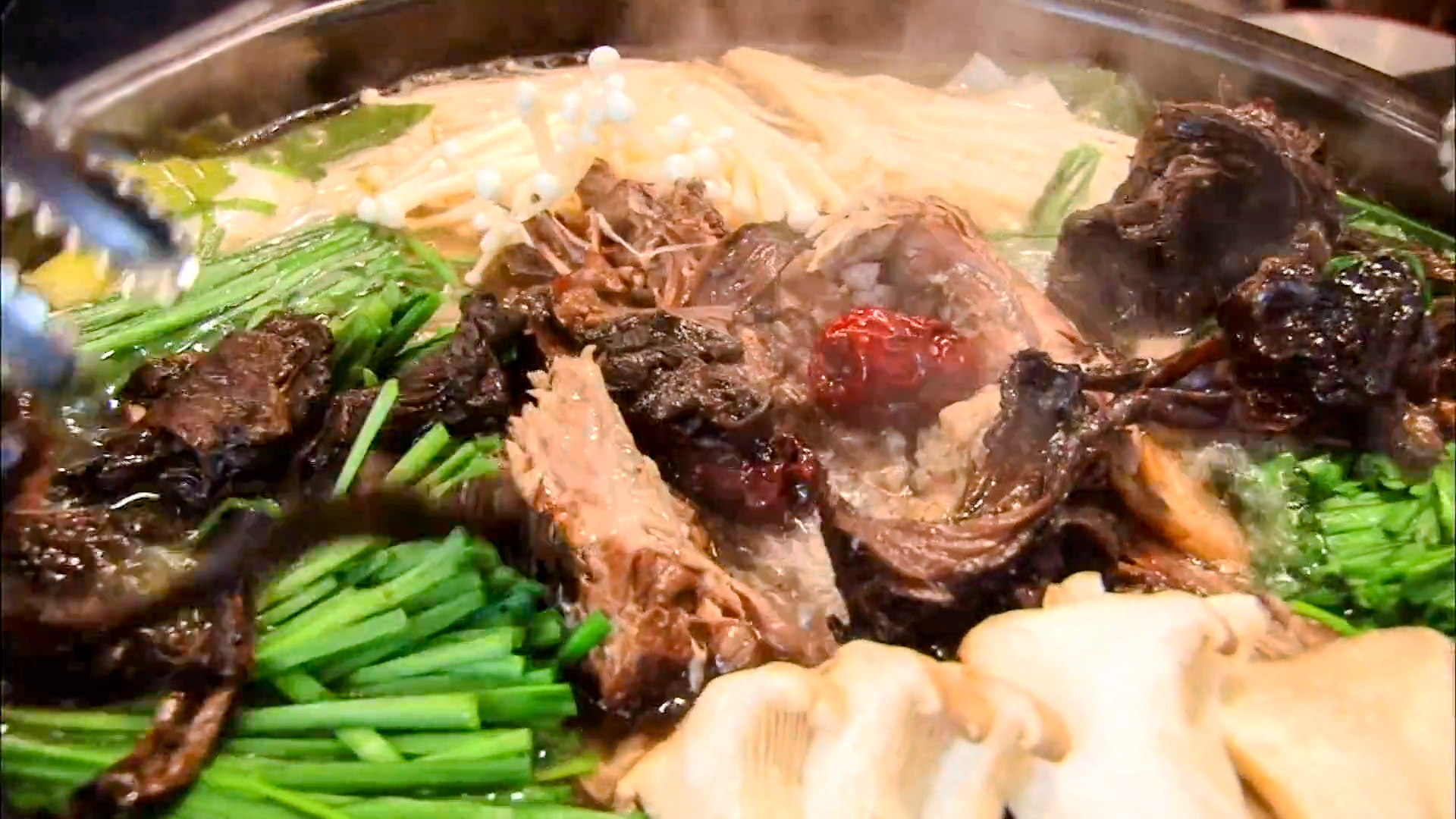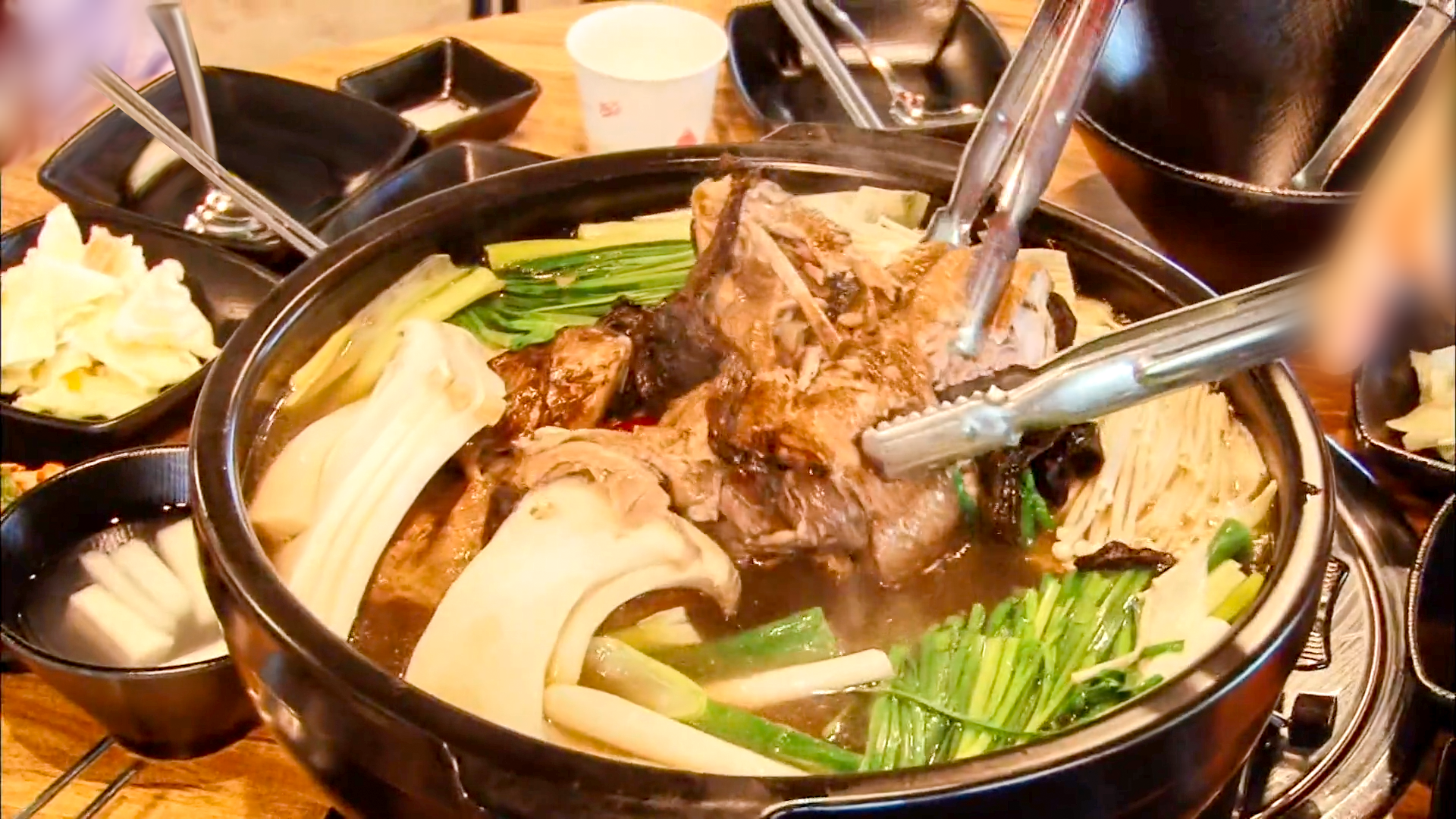 오리 한 마리가 통째로 들어가 있으며 각종 한약재와 함께 푹 끓여내 국물이 깊고 시원한 진국입니다.