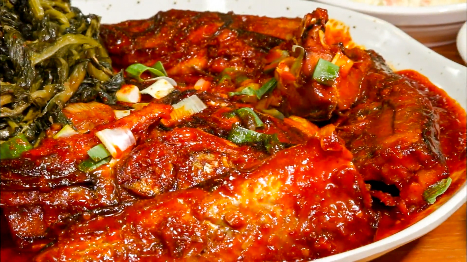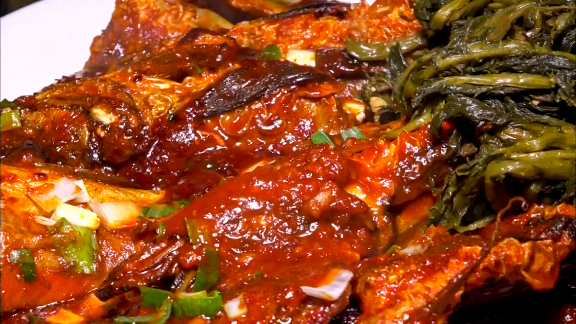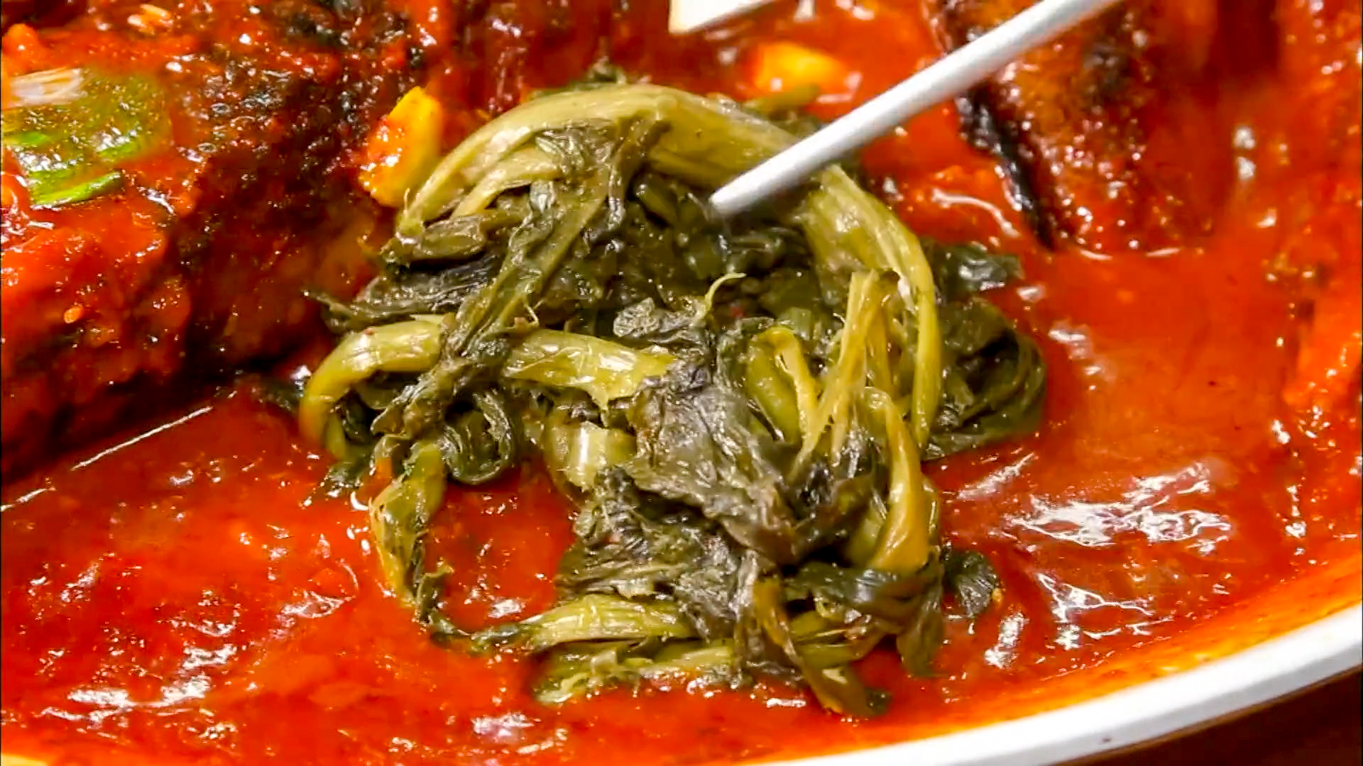매콤 달콤한 코다리찜 위에 시래기가 듬뿍 올라가 있습니다.