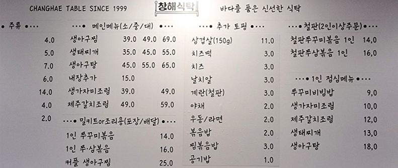 ※생아구찜이외에 생태찌개, 생아구탕, 생가자미조림, 제주갈치조림, 철판쭈꾸미볶음, 철판쭈삼볶음, 등을 판매하고 있으며 메뉴와 가격은 음식점 사정에 따라 변경될 수 있습니다.