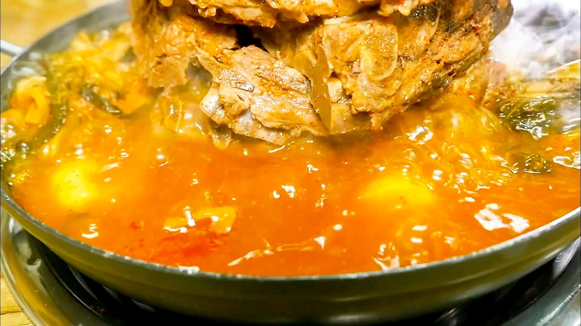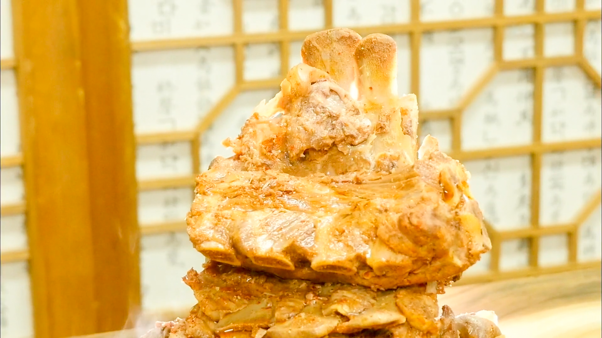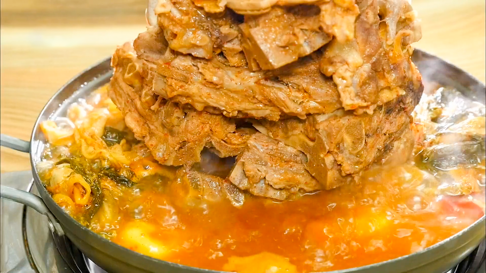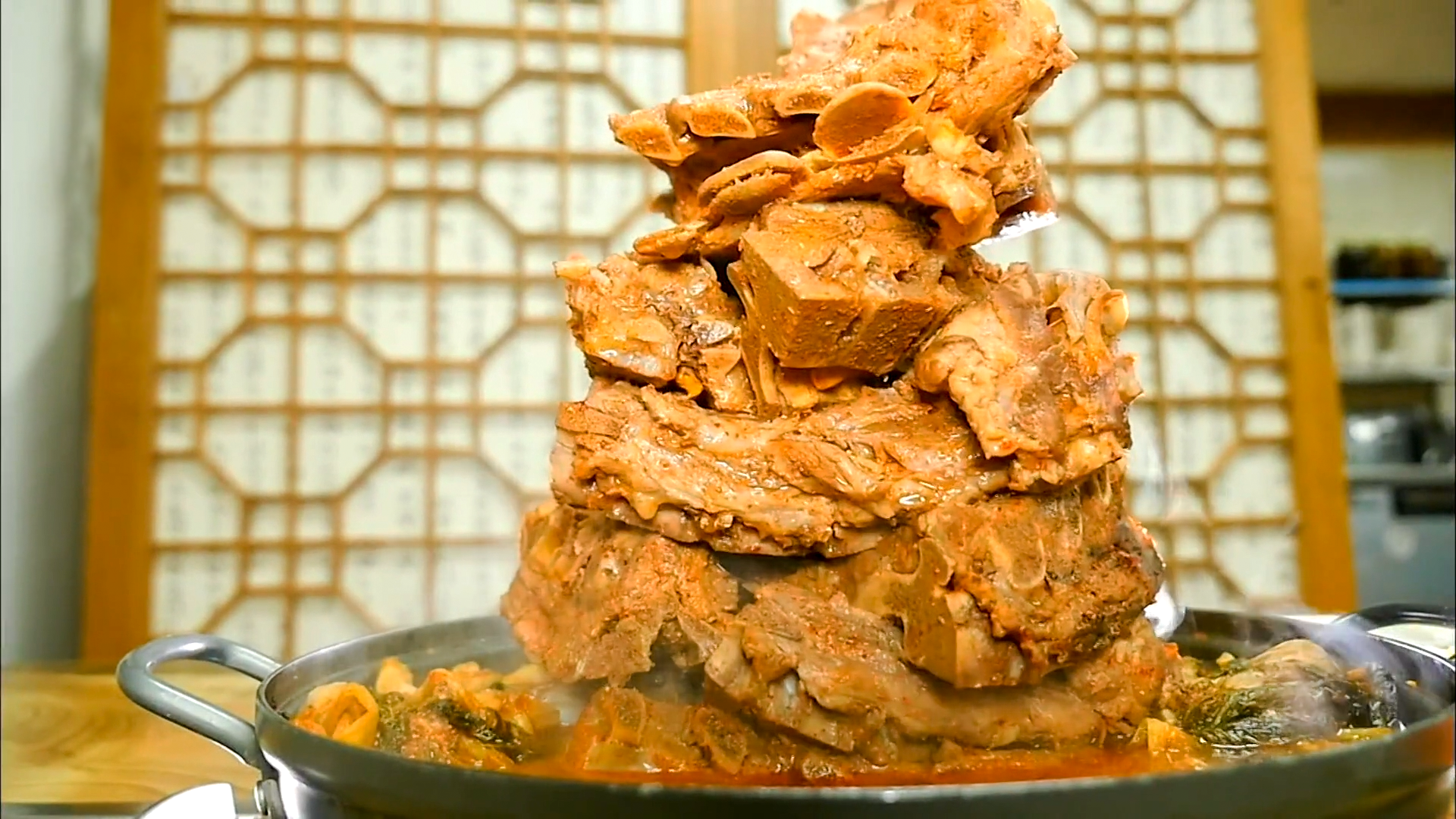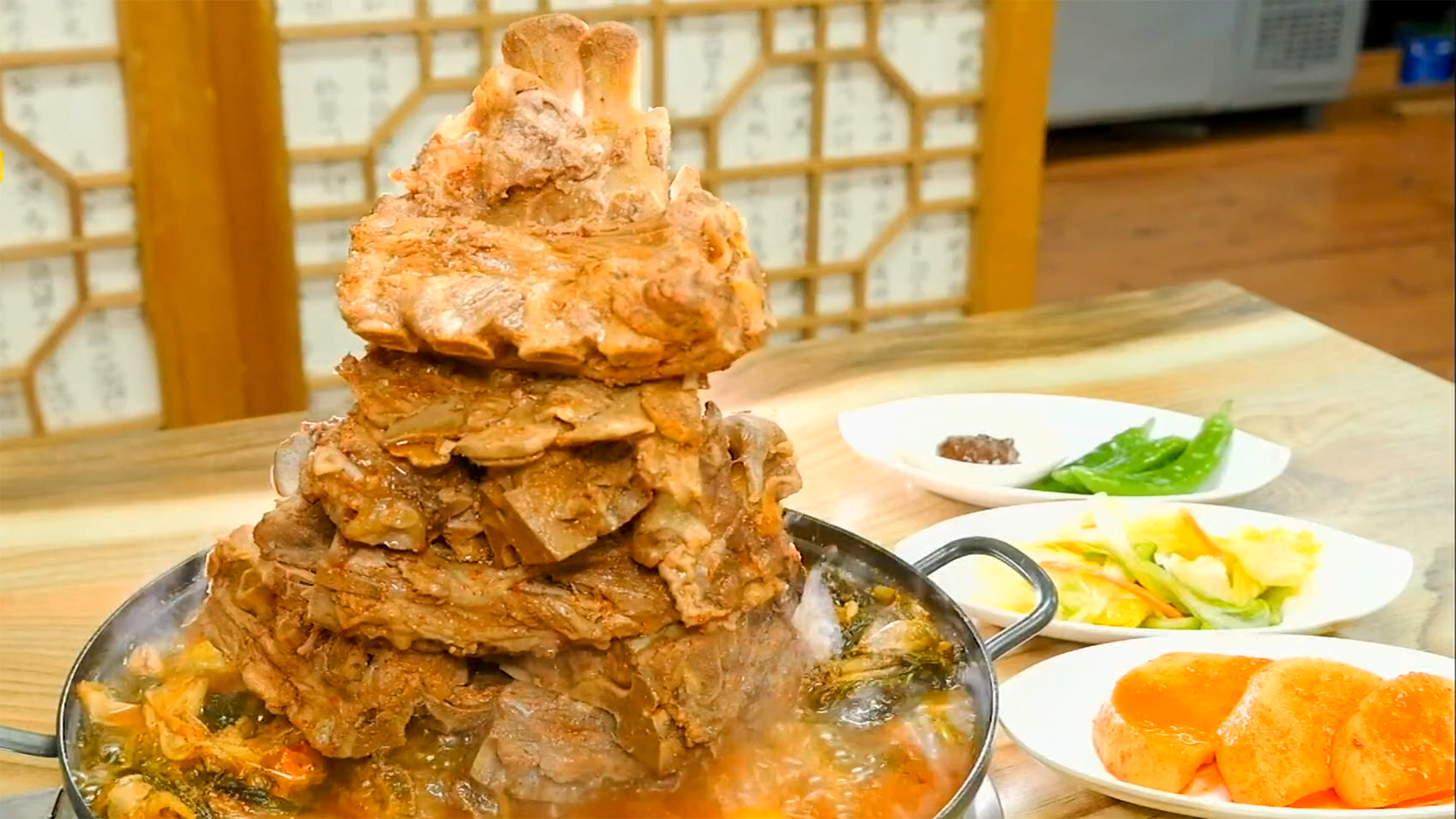 이 집의 대표 메뉴 뼈탑전골입니다. 푸짐하게 쌓아 올린 뼈다귀가 한눈에 시선을 사로잡습니다.