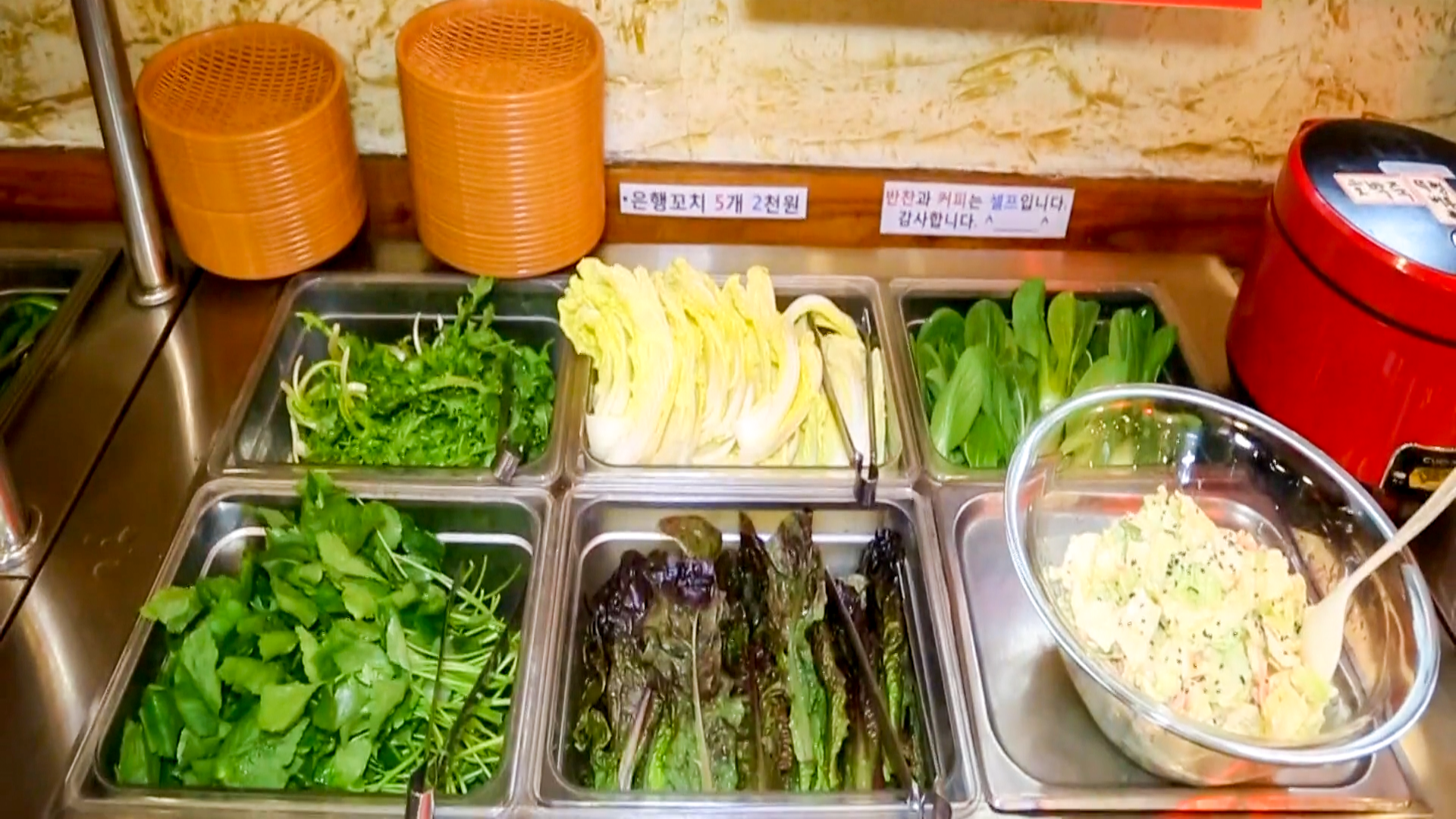 쌈채소, 햄, 샐러드, 쌈장, 소금, 참기름 등은 셀프로 더 먹을 수 있습니다.